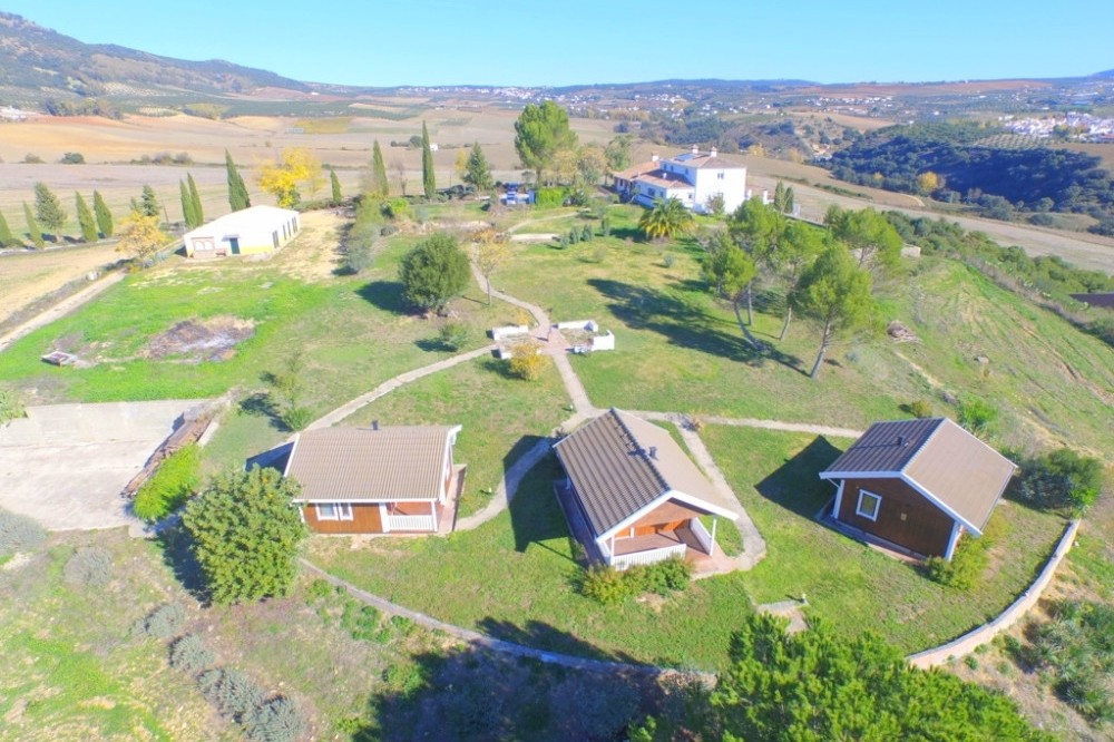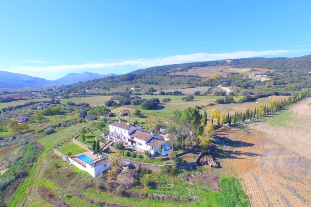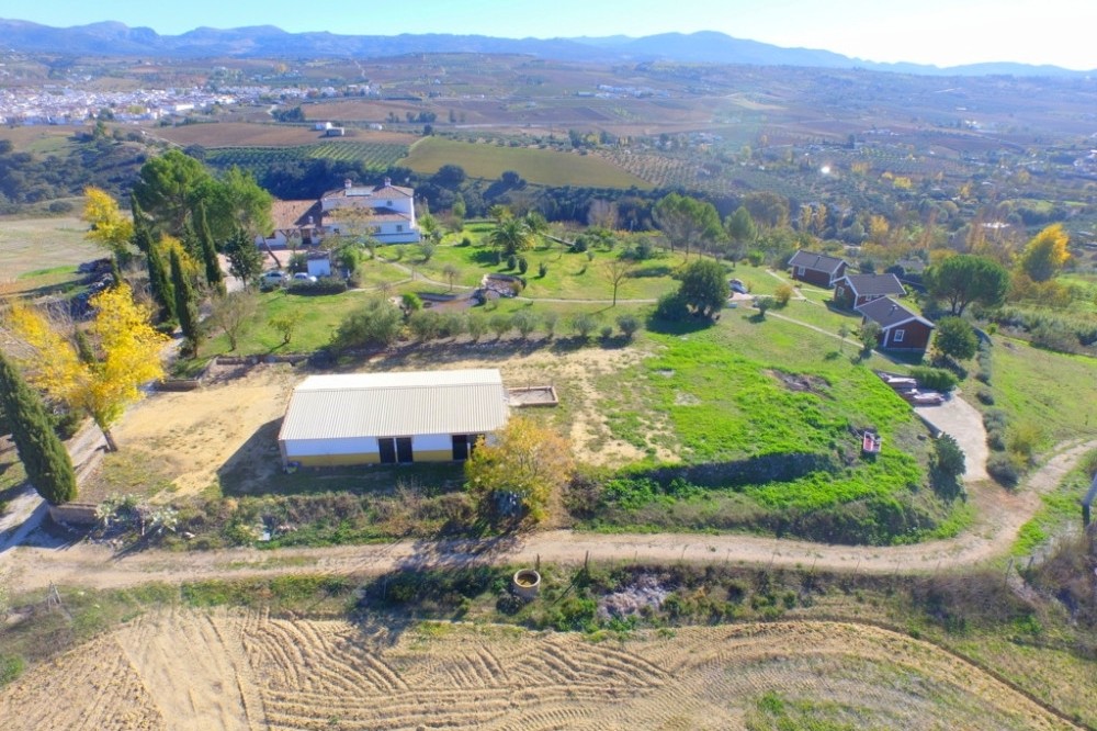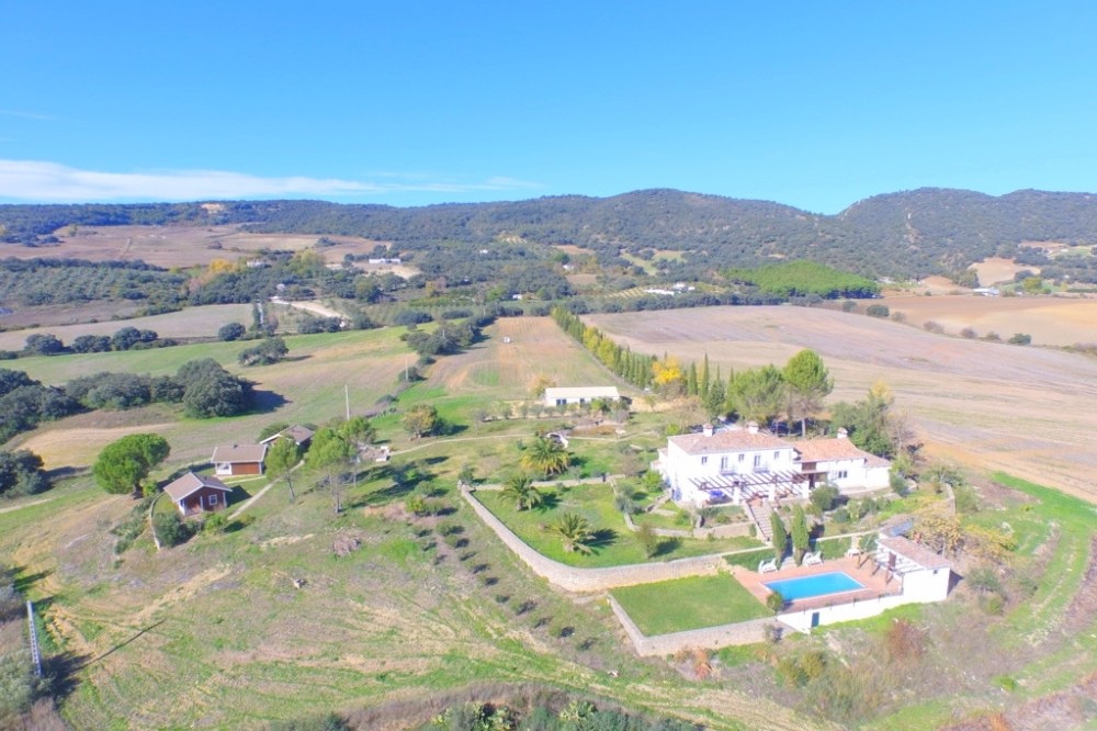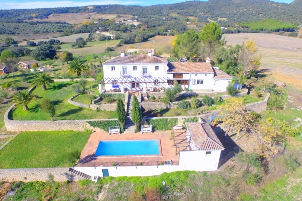 - Opportunity! Andalusian Cortijo with wonderful panoramic views, 5.000 olives trees, excellent road access, 3 separate Bungalows and 10 stables, on an impressive flat and fully fenced plot of almost 200,000m2 with well water. The main house is spread over 2 floors as follows: Ground floor: Large dining area with seating area with access the porch. Large living room with fireplace and several areas to sit, toilet, fully fitted kitchen with pantry, engine room. A double bedroom with fitted wardrobes and en suite. Service apartment located on the other side with living room, equipped kitchen, 3 bedrooms and 2 bathrooms. Upstairs: 2 large bedrooms with en suite plus office and ample storage. Beautiful sunny porch with great views and access to the pool with 100% privacy with the gym with sauna (which can be converted into a barbecue house). Solid property with huge potential, terracotta floors, wooden beams, double glazed windows, air conditioners and solar panels. Three Bungalows in perfect condition with kitchen, bathroom, 2 bedrooms (one with 1 bedroom), living room, porch with panoramic views. Stables with 10 boxes and 3 warehouses. Plot 194.607m2 with own well water and irrigation system.Total built size 992,01m2, plus pool 40m2. Living area 668,03m2. Porches and patio 115,68m2. Gym, sauna, stables, warehouses, machine room and shed 208,03m2. IBI 2.079,81€ per year. Distances: Ronda 10 km. Puerto Banus, Marbella 60km. Malaga airport 114km.