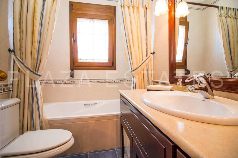 • Great house with 4 bedrooms and 3 bathrooms, located in the quiet urbanization of La Noria with a communal pool and a tennis court, 5 minutes drive from the center of Nerja, and views to the sea. The house is built with high quality materials and distributed over three floors. On the entrance level you will find the living room, a small lounge, a separate kitchen and a large covered terrace with outdoor kitchen. Upstairs there are 2 bedrooms and 2 bathrooms and a balcony with sea views. On the lower level there is a large garage and a separate apartment with one bedroom, one bathroom and a living room with an open fireplace. The private covered pool is accessed from the big terrace outside the living room.