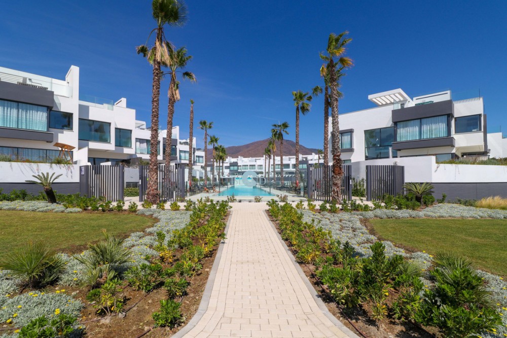 - TOWNHOUSE IN FIRST LINE OF THE BEACH, ESTEPONA Modern and luxurious townhouse with 4 bedrooms brand new on the beachfront on the New Golden Mile of Estepona, being only twenty minutes from Puerto Banús and Marbella. The community has beautiful tropical gardens, swimming area, with a fifty-meter Olympic pool, and a spa circuit with sauna and Turkish bath. The house has a private roof terrace with fantastic sea views, jacuzzi and barbecue area, large living room with fireplace, fully equipped kitchen. It is equipped with underfloor heating, air conditioning hot / cold, security shutters and double glazing.