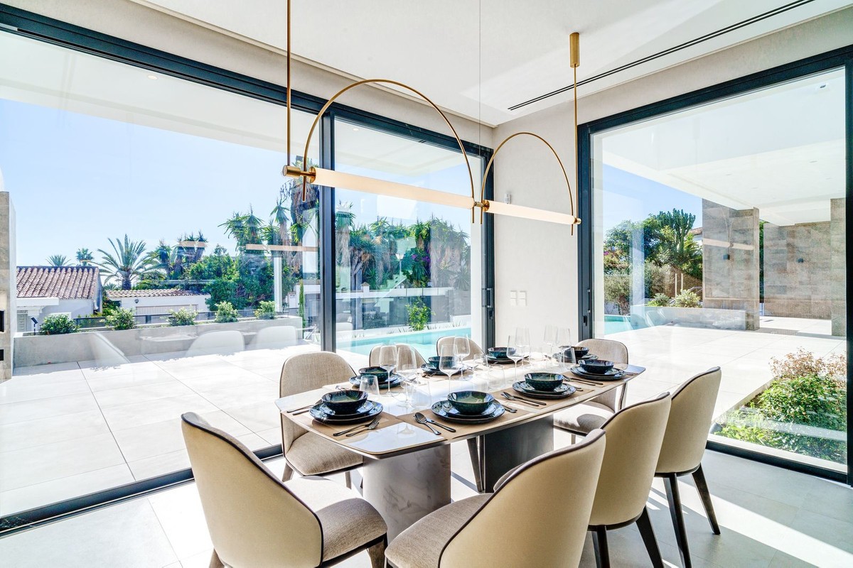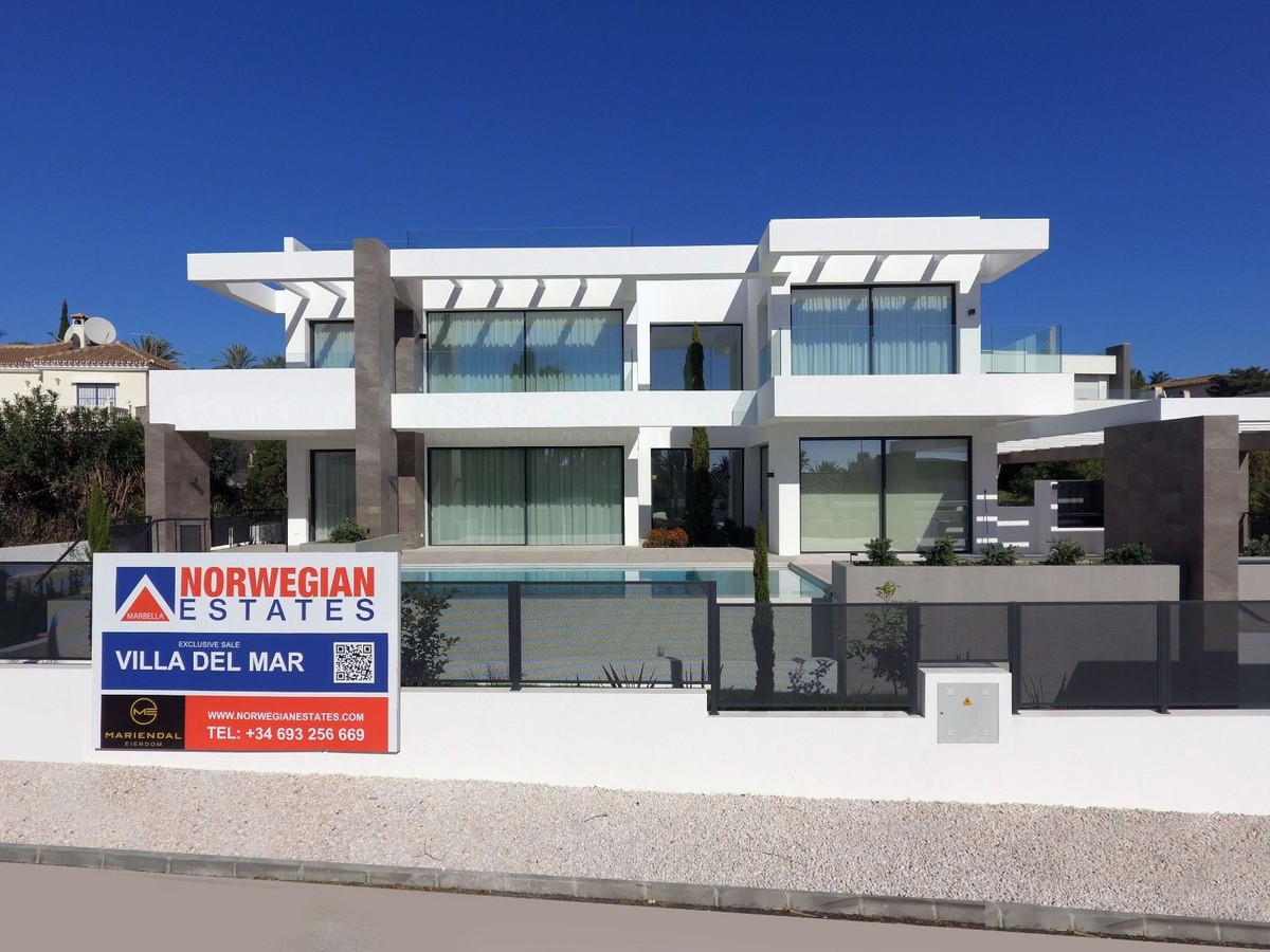 - TOTALLY NEW ULTRA MODERN BEACHSIDE VILLA WITH SEA VIEWS IN MARBESA, ELVIRIA BEACH. Fabulous brand new modern villa situated in the residential area of Marbesa Beach, one of the areas of Elviria, which is the most highly sought after destination due to its tranquility, privacy and easy access to the beach. The location offers at the same time easy access to the main highway, commercial centres and other services. This superb villa is built on a plot of 779,72 m2. The property itself offers 390,45 m2 of interior space. The entrance to the house leads into a magnificent living lounge area with fireplace and an open modern kitchen/dining zone with top quality appliances and floor to ceiling sliding doors, which gives lots of light and airy feeling throughout the day. The living room leads to the garden, porch and the sky blue swimming pool with a splendid under water window, which provides light into the storage room. The terrace has a built in stone BBQ area. There are also partial sea views from this level. There is one large guest bedroom with en suite bathroom as well as a powder room on the same floor. The wide floating gallery staircase takes us to the first floor, where we find two fabulous bedrooms with en suite bathrooms and access to their own private terraces. One of the bedrooms belongs to the Master Bedroom suite with a spacious dressing room, full bathroom with a bathtub, walk-in shower and double sink. Both bedrooms enjoy lovely sea view from this level, which also leads us to an outside staircase up towards a 100m2 solarium on the top of the villa. Here we have amazing sea views and plenty of space for a chill out, jacuzzi, outdoor gym, a BBQ area, etc.. The laundry room, the machinery room, the bathroom and three further spaces for gymnasium, cinema room, games room plus another extra bedroom are located in the large basement level. PROPERTY FEATURES: • 5 Bedrooms • 6 Bathrooms • Total built: 390,45 M2 • Basement: 158,15 m2 • Ground floor: 130,61 m2 • First floor: 101,69 m2 • Sea views • Beachside - 350 m to the beach • Unfurnished • Private pool • Fireplace • Solarium • BBQ area • Under floor heating throughout the villa (except basement) • Alarm system • Private carport for 2/3 cars THIS IS THE PERFECT XXIst CENTURY MODERN VILLA FOR A BEACHSIDE LIFESTYLE WITH ALL ITS ADVANTAGES!