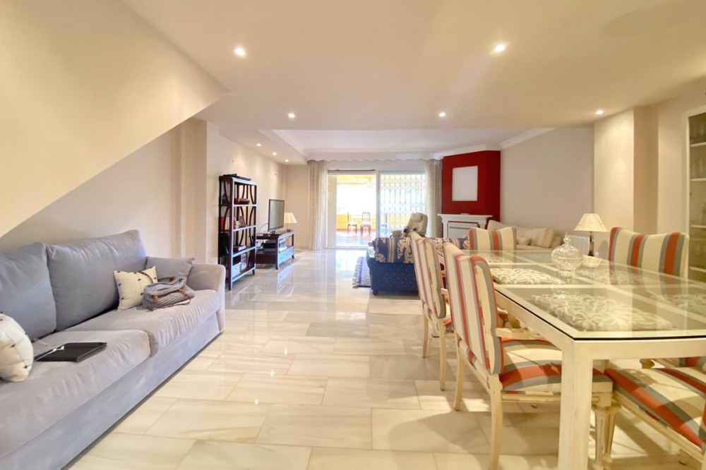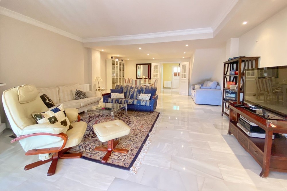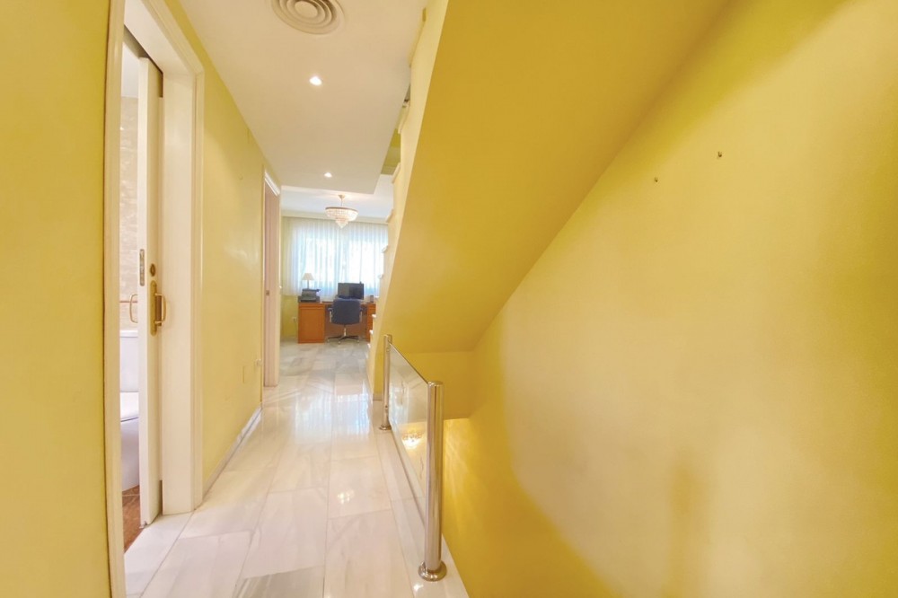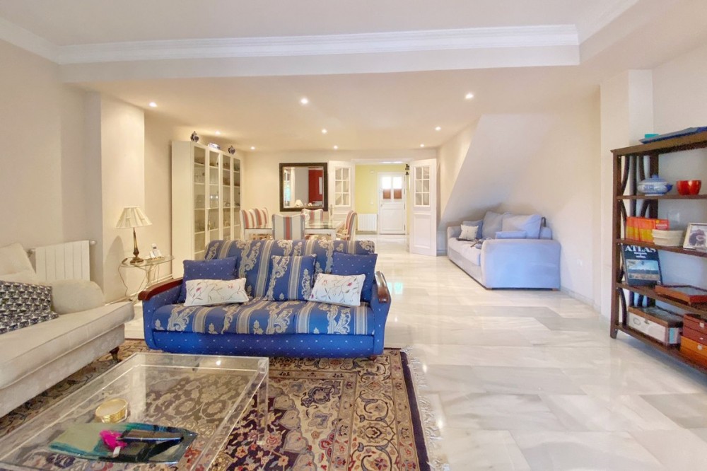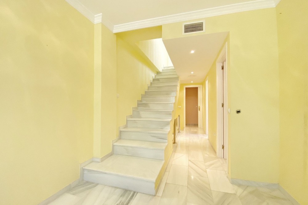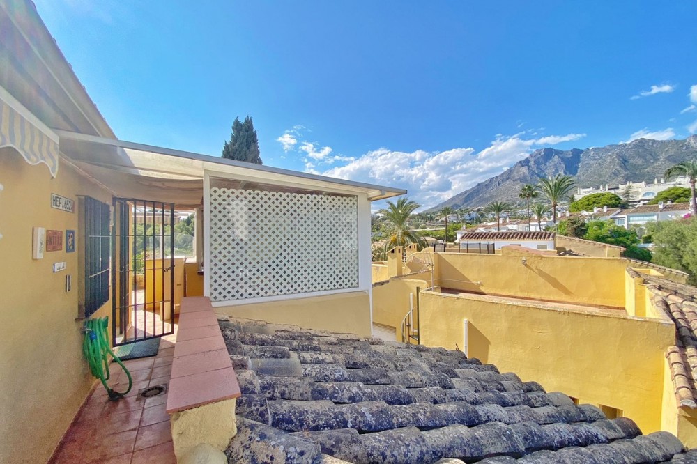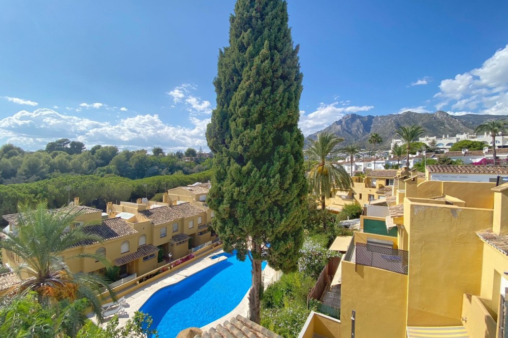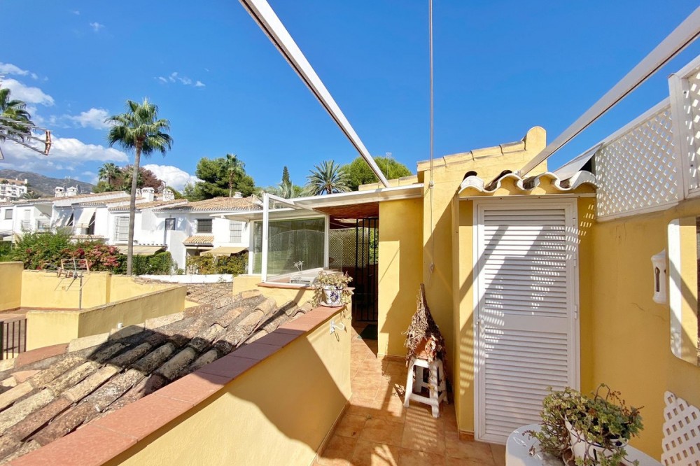 - Charming southwest facing townhouse for sale in Marbella with sea and mountain views. A gated community called Guadalpark II consisting of 36 houses with communal pool and gardens .In a quiet and well connected complex with daily concierge/gardener and within walking distance to The Old Town and amenities like schools, sports centre and supermarkets. It comprises of a spacious living/dining room with fireplace and direct access to a lovely Southwest facing terrace. The ground floor also has a fully equipped kitchen and a guest toilet. On the upper floor there are 3 bedrooms and 2 bathrooms, one en-suite with access to a private terrace and a staircase that takes you up to the solarium. The house has central heating throughout and underfloor heating in both bathrooms. It includes 2 private parking spaces, one underground and a carport connected to the entrance of the house. This is a perfect family home in a complex with mainly permanent residents.