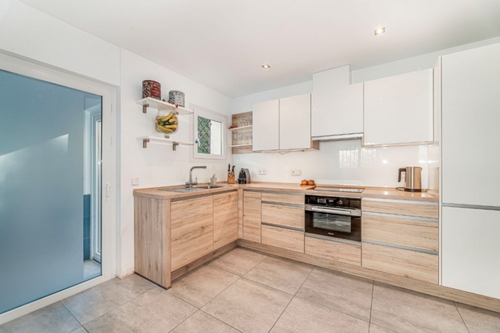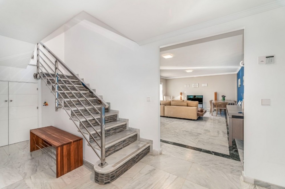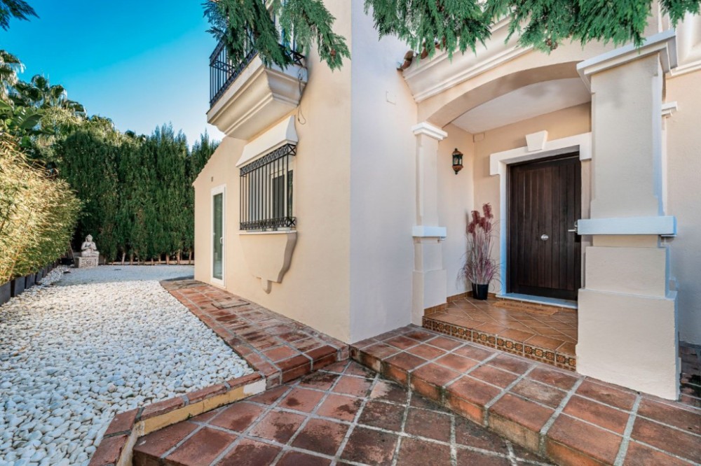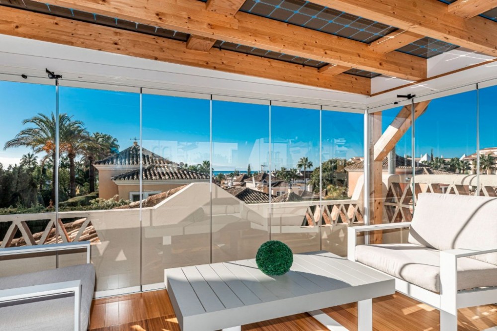 - This charming villa with heated pool is located in the famous residential area of Bahía de Marbella just a few meters from the beach. The urbanization is exclusive due to its elegance, its 24 hour security service and its unbeatable location in front of the most beautiful beaches in Marbella, not to mention the famous "La Cabane" beach club nearby. The villa has been completely renovated and is distributed over two floors. The ground floor consists of a modern kitchen with dining area and laundry room, a spacious living-dining room that opens onto the covered glazed terrace, a bedroom with an en-suite bathroom. The upper floor offers two bedrooms and two bathrooms, one of them en-suite. In addition, the villa has a large glazed terrace to enjoy the mild climate of Marbella and the sea views outdoors all year round. The villa is equipped with air conditioning h/c, under-floor heating in the bathrooms, marble floors, double glazing, solar energy, a garage for one car and a storage room.