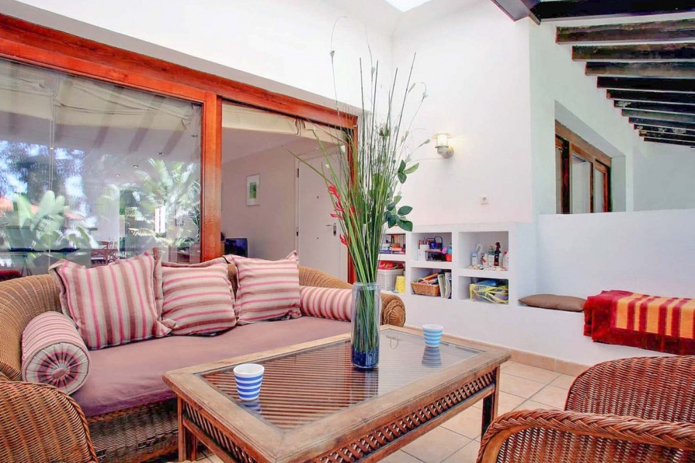 - This is an excellent opportunity to own a beautifully renovated two-bedroom, two-bathroom apartment in a sought-after, gated community by the beach. Set on the first floor and facing southwest, this apartment offers a bright open-plan living and dining space, with French doors that lead to a private covered terrace overlooking lush gardens. The fully-equipped kitchen flows seamlessly into the living area, while the master bedroom suite and guest bedroom, both with fitted wardrobes, add comfort and convenience. Enjoy access to beautifully maintained gardens, a communal pool, and tennis courts. Located within walking distance of the beach and local amenities, and just a 15-minute walk from Puerto Banús, this apartment is ideally positioned between Puerto Banús and San Pedro—perfect for holiday rentals or enjoying the best of Spanish coastal living. A dedicated parking space in the gated community is also included.