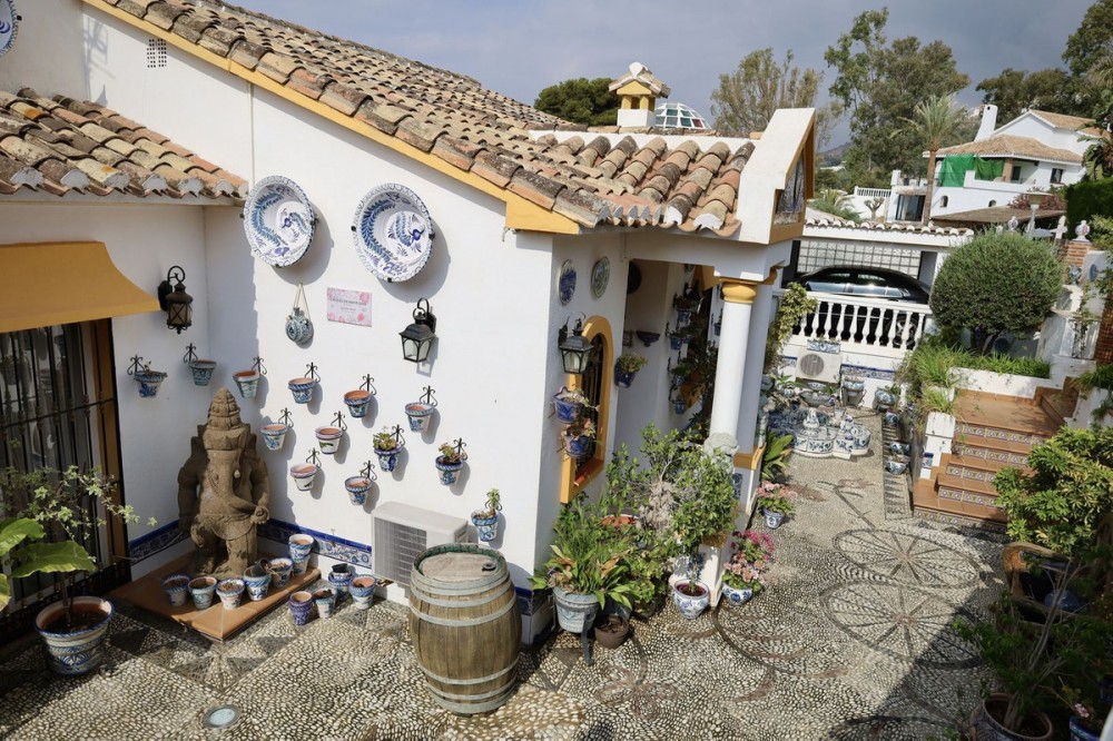 - Villa located in Torremuelle, Benalmadena Costa. Large sunny plot and amazing sea views. Distributed over 3 levels as follows: Entrance level with independent kitchen, lounge with access to the terrace that has amazing sea views, and staircase that takes you down to the bedrooms. Downstairs you find 3 bedrooms and 2 bathrooms. A lovely bodega and wine cellar. On the bottom floor there is a bar and laundry room. From this level you can access the pool and there is also an external staircase that takes you to the pool area. Outside the villa there is an independent room which is now used as an office but could be a bedroom. Private parking and 2 garages.
