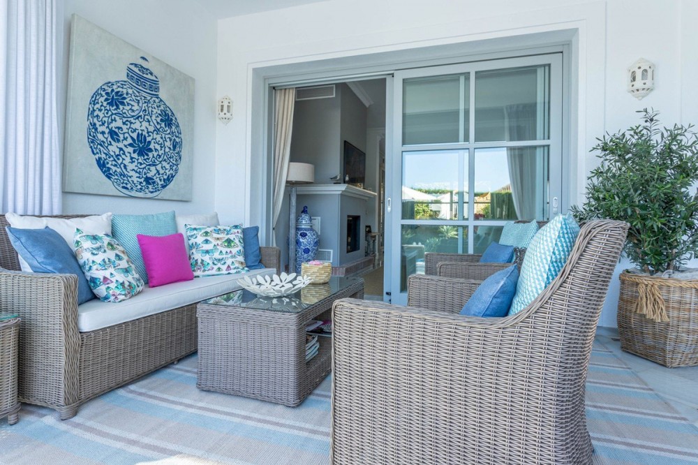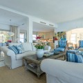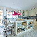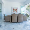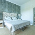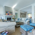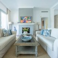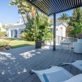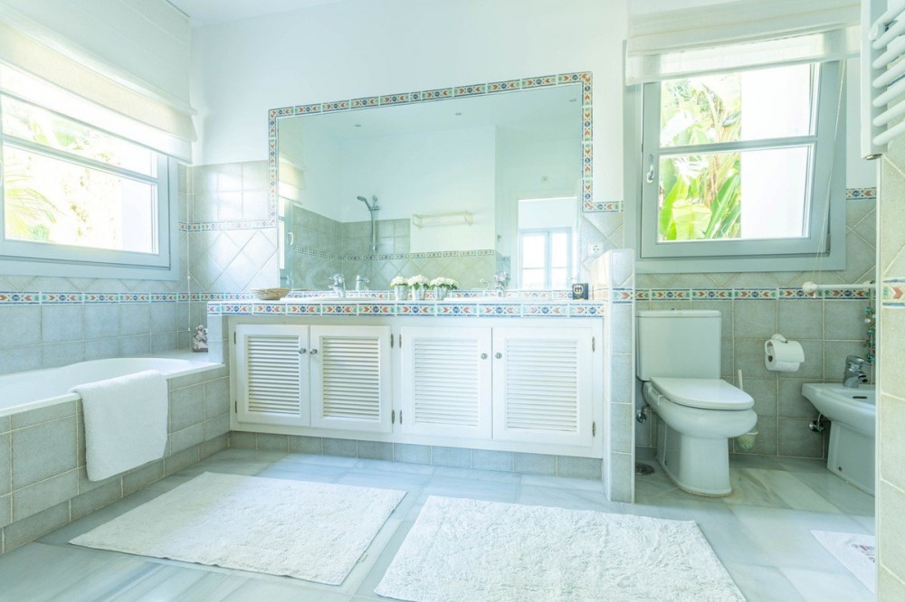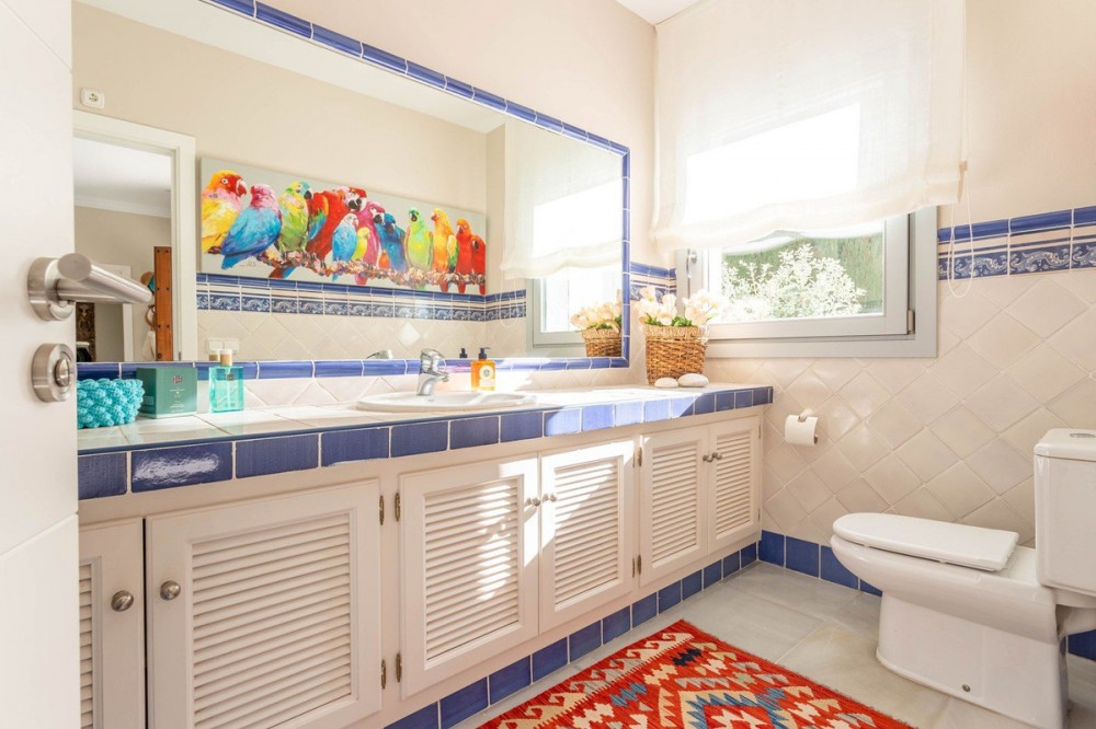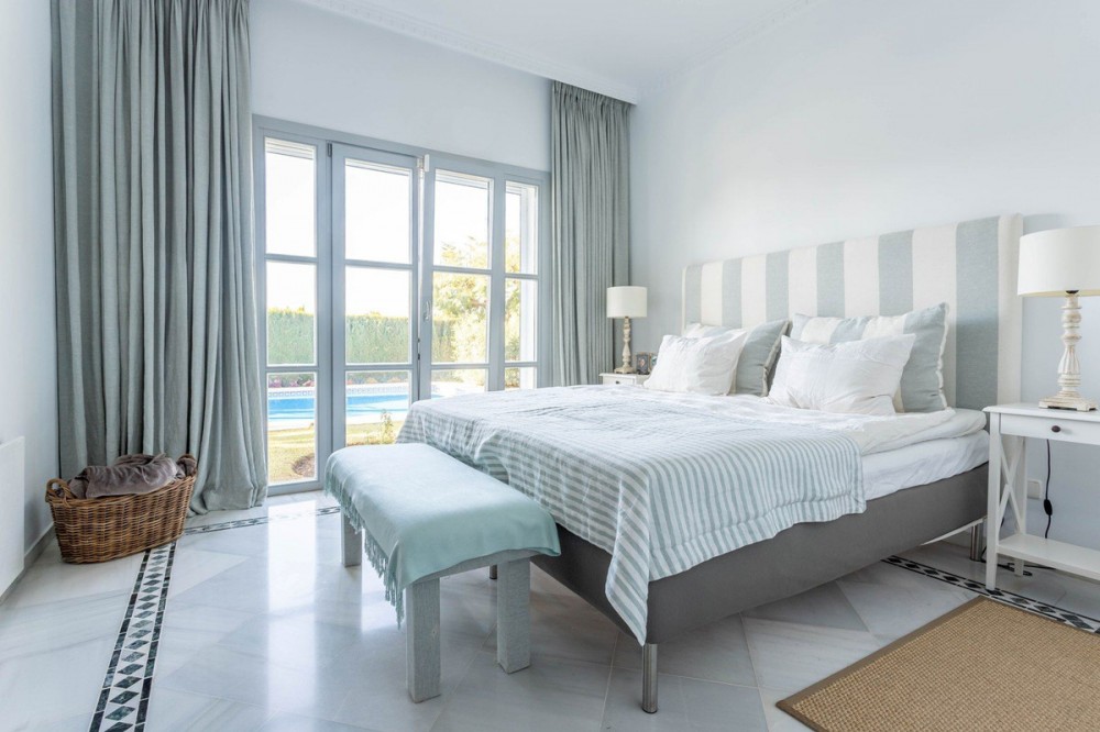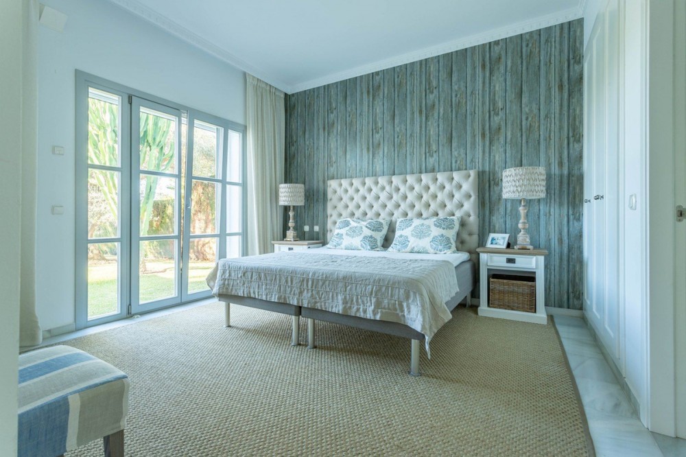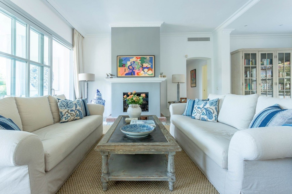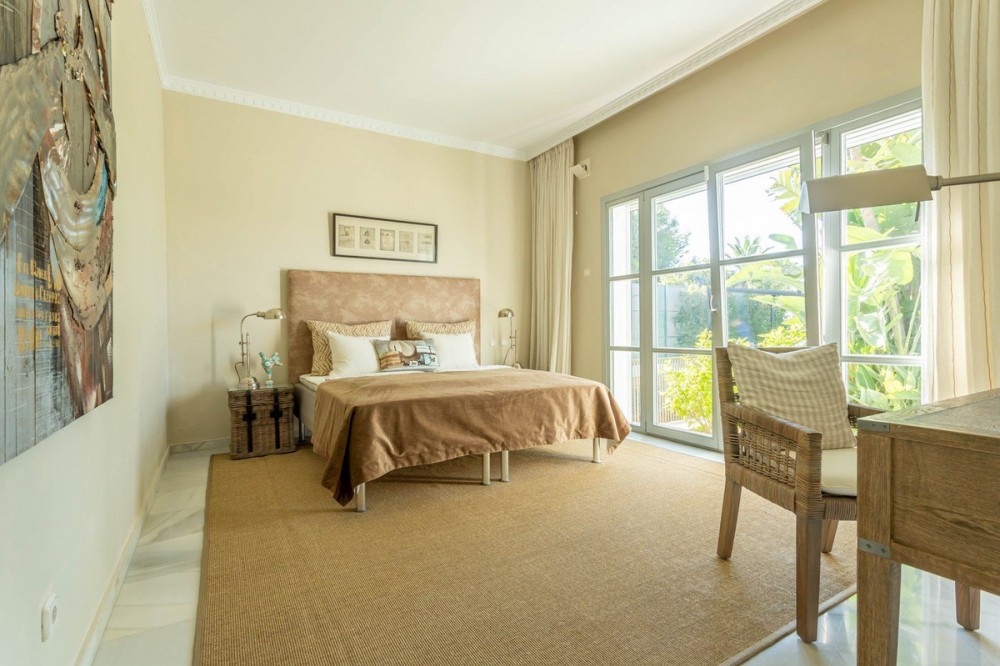 - FOR SALE: This one level villa is located in the heart of Sierra Blanca, Marbella – one of the most prestigious areas in southern Spain. With its 4 bedrooms and 4 bathrooms it can accommodate up to 8 guests who get spoiled by a perfectly maintained garden who lovingly embraces the pool in front of the house, as well as a particular charming interior design that combines harmoniously the Scandinavian soul of the owner with international art pieces. The interiors are accessed via a spacious foyer with lots of sunlight. From here you will find a bedroom with double bed and its own bathroom with shower and bath tube on the left hand side. The bedroom is characterized by floor-to-ceiling windows for plenty of natural light in the room, as well as a desk and a TV. On the right hand side of the foyer you will find a particular coloured bathroom for guests. In the further course the central area of the house opens up with living, dining and kitchen area. The floor-to-ceiling windows bring in plenty of natural light. The floor plan is open for a particularly generous feeling of space. The kitchen is equipped with all modern equipment. The dining area is framed by a small library with a collection of international books and from the living area with fireplace you access the covered terrace. This area is divided into a lounge area and an alfresco dining area, both with a fantastic view into the garden and the pool area. The west wing of the house has 1 master bedroom with direct access to the garden and an en suite bathroom with bathtub and shower. Two further bedrooms and a bathroom with shower complete the space of the villa. On the north side you will find another alfresco dining area, ideal for barbecues. A very special highlight – the sail-protected sun terrace with sea view can be reached via an external staircase. Ideal to read a book in peace, enjoy the sea view or pursue your own thoughts. The villa is the perfect choice for a family with kids or a group of friends that are looking for a villa with pool in a prestigious area close to Marbella and the beach.