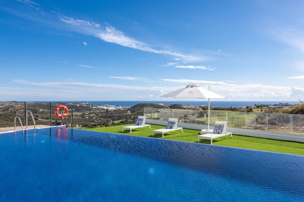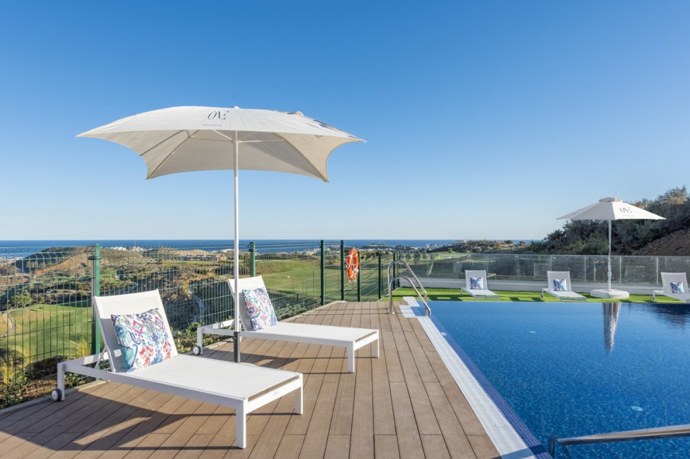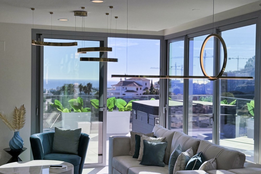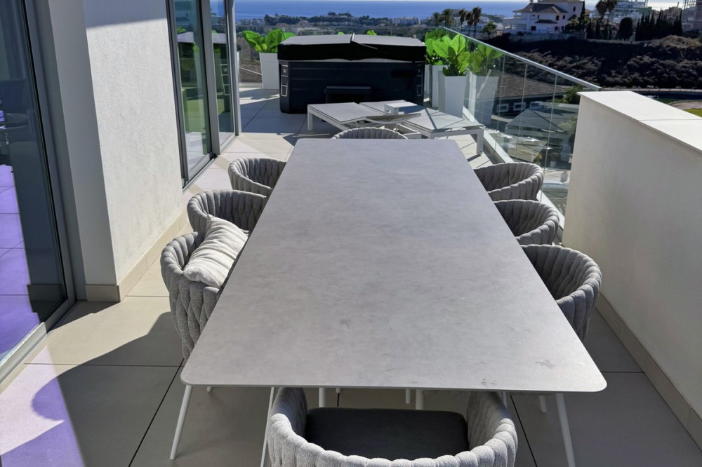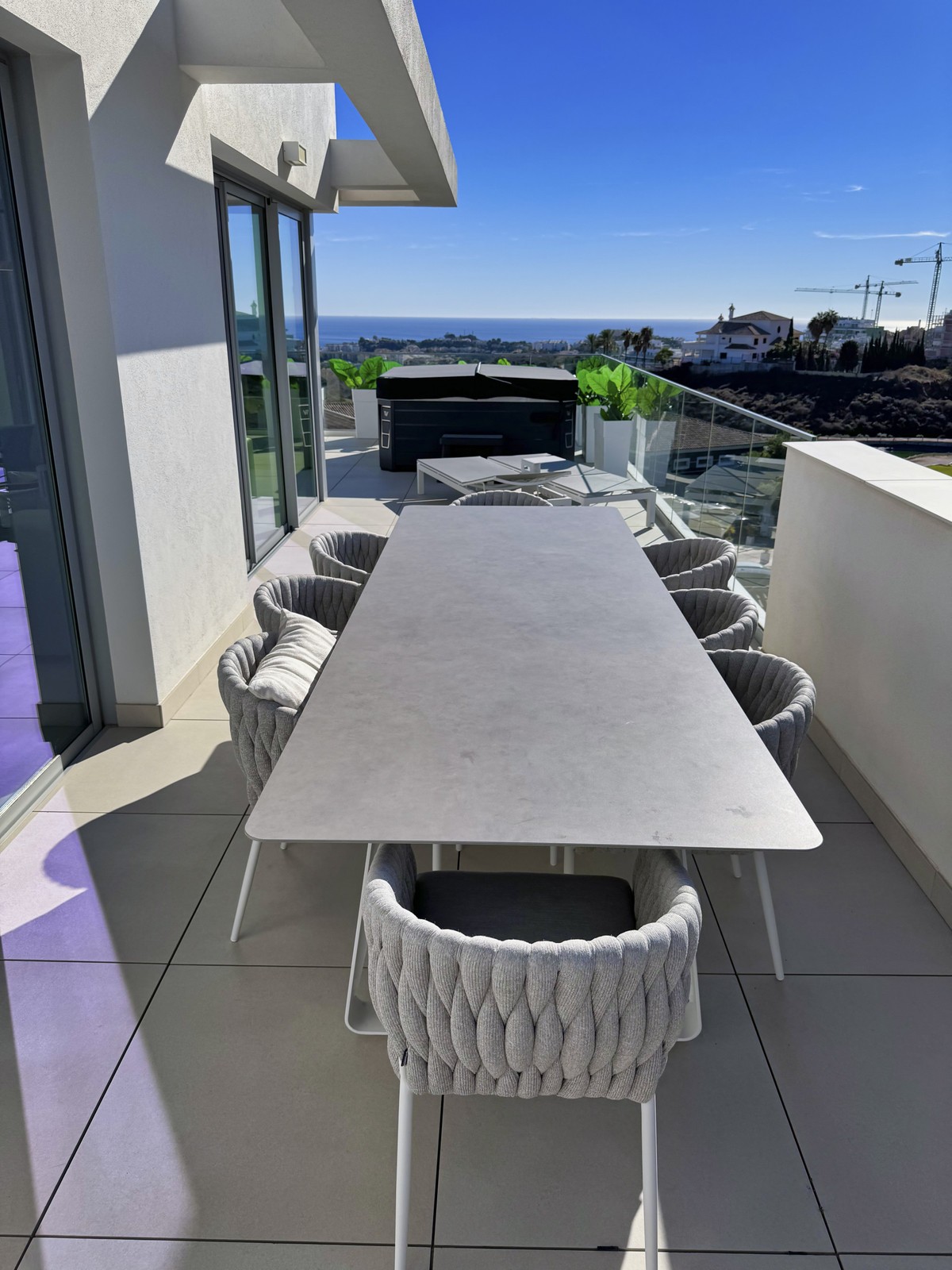 - Spectacular penthouse with solarium with panoramic views of the sea facing the Calanova golf course. The property is located in the highest portal of the complex, it enjoys the best views and privacy. The penthouse with a 180m2 terrace and solarium with a lounge area, outdoor dining room from which to enjoy the best views. From the terrace you can access the solarium, the area with the most privacy and where you can set up an outdoor kitchen area with a chill out area. It has a living-dining room, an equipped open-plan kitchen, 2 bedrooms with 2 en-suite bathrooms and a guest toilet. 2 parking spaces are included with direct elevator access from the property, and a large storage room. The penthouse is designed using the best construction materials and the most modern technology on the market. It has hot/cold air conditioning controlled by the best Air Zone home automation control system, underfloor heating throughout the interior area, LED lighting, designer kitchen with NEFF appliances, dressing areas in the bedrooms and large porcelain floors. This amazing urbanization has the best common areas on the Costa del Sol, owners can enjoy an HD Home Cinema with the latest image and sound technology, gym, Premium wine cellar, social club, business centre and a complete SPA which includes a thermal area, Jacuzzi, sauna, Turkish bath and hydro massage showers. For those who like life outside, they can enjoy 2 outdoor pools, one of them infinity type with panoramic views of the sea; the other with a bar area and beach edge. It is a closed complex with a concierge service and security control with 24-hour surveillance cameras.