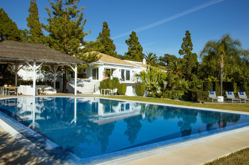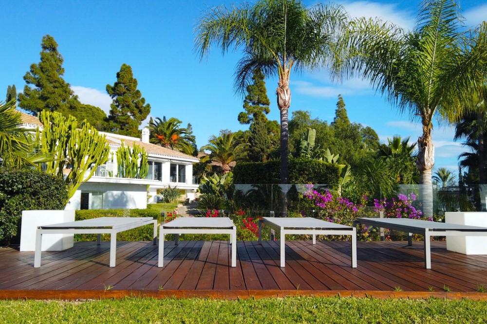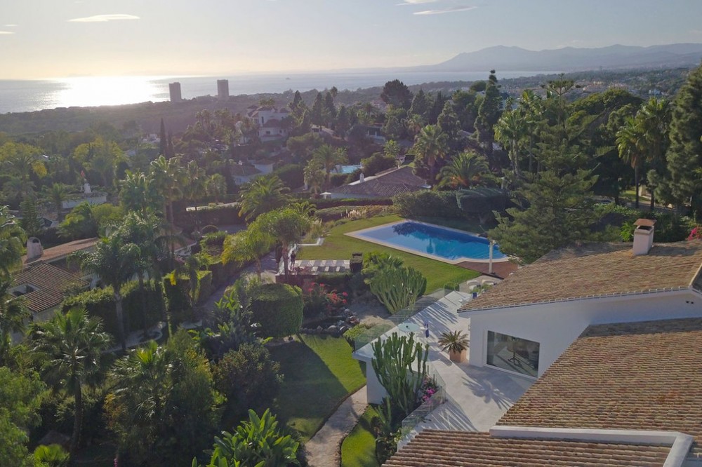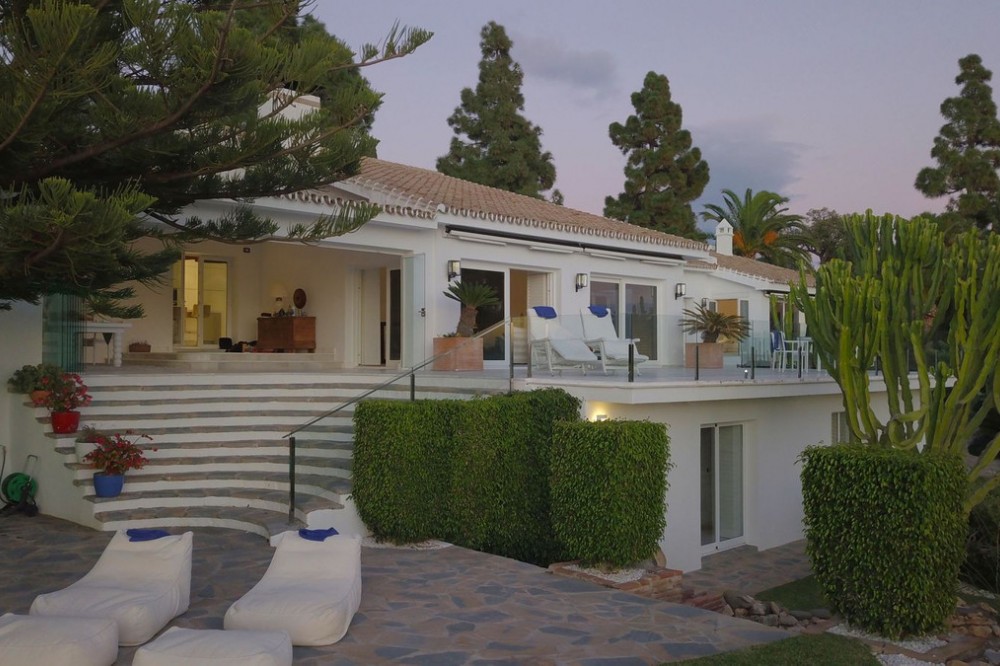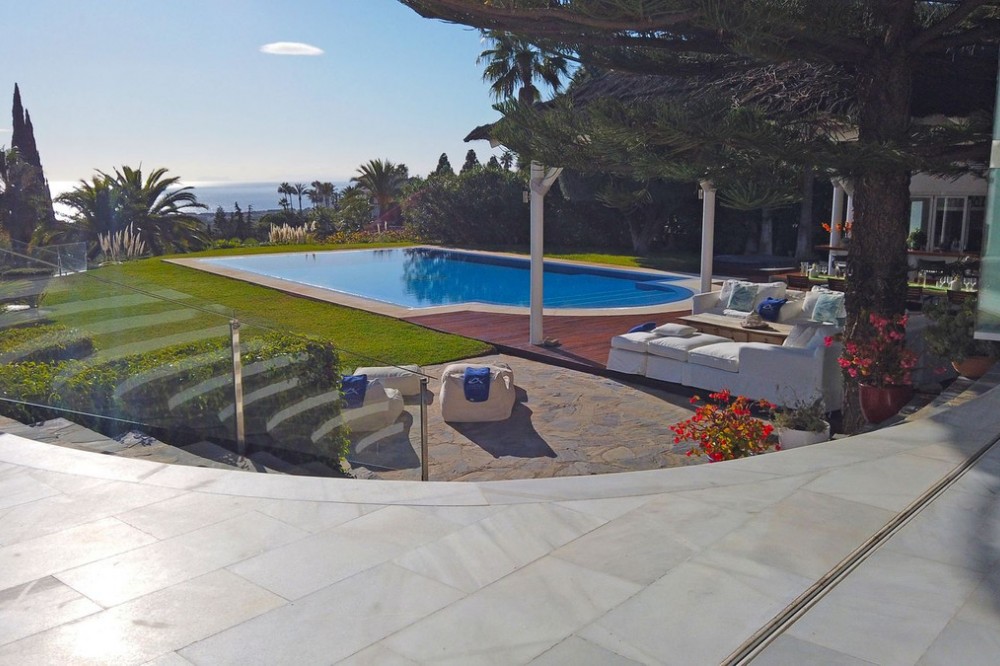 - INVESTORS DREAM Luxury villa set in beautiful tropical gardens with amazing sea views from everywhere. One of east Marbella finest villa, this 7 bedroom 9 bathroom luxury villa has everything you could want, large bright airy rooms all with great views of the gardens then out to sea, beautiful established tropical gardens with a fantastic pool and poolside area. The 12 meter by 7 meter heated, salt water pool is enhanced with a very large bali style bar/kitchen and seating area, sauna and large jacuzzi all with outstanding sea views, a great area for entertaining. The villa has an Ibiza style to it, very big comfortable rooms flowing into each other, all the bedrooms are well thought out with great light and views with the master bedroom taking your breath away, large glass doors leading out to an amazing rap around terrace. The villa is in the middle of one of the best resorts in Marbella, Hacienda Las Chapas with its 24 hour guards, manicured street and great communal areas. Even though this beautiful villa is central to the whole resort, no part of the villa or gardens is overlooked.