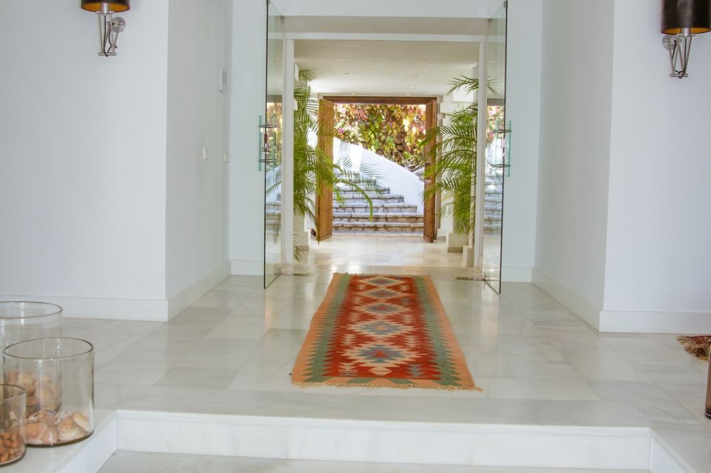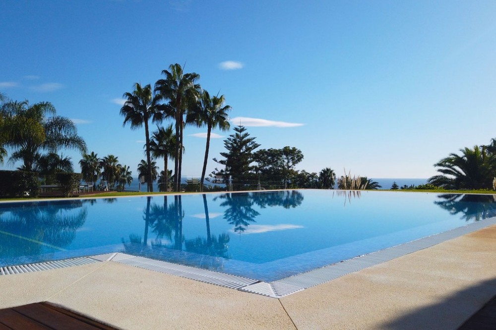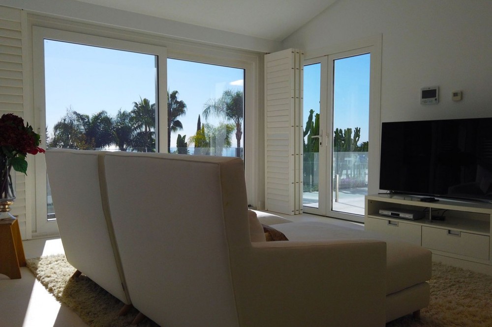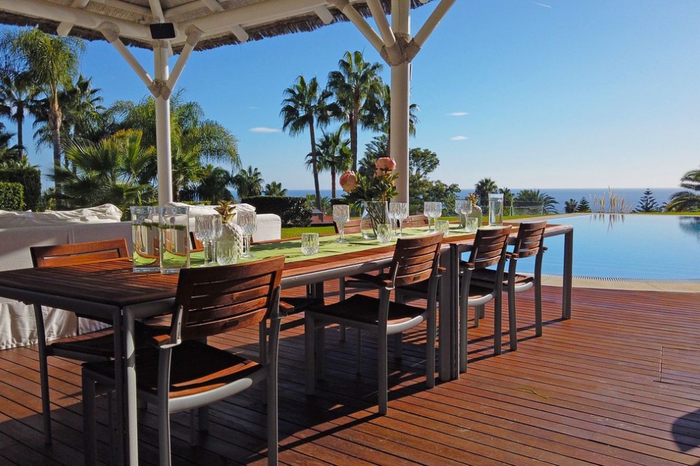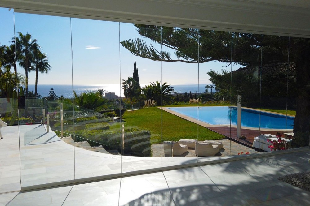 - INVESTORS DREAM Luxury villa set in beautiful tropical gardens with amazing sea views from everywhere. One of east Marbella finest villa, this 7 bedroom 9 bathroom luxury villa has everything you could want, large bright airy rooms all with great views of the gardens then out to sea, beautiful established tropical gardens with a fantastic pool and poolside area. The 12 meter by 7 meter heated, salt water pool is enhanced with a very large bali style bar/kitchen and seating area, sauna and large jacuzzi all with outstanding sea views, a great area for entertaining. The villa has an Ibiza style to it, very big comfortable rooms flowing into each other, all the bedrooms are well thought out with great light and views with the master bedroom taking your breath away, large glass doors leading out to an amazing rap around terrace. The villa is in the middle of one of the best resorts in Marbella, Hacienda Las Chapas with its 24 hour guards, manicured street and great communal areas. Even though this beautiful villa is central to the whole resort, no part of the villa or gardens is overlooked.
