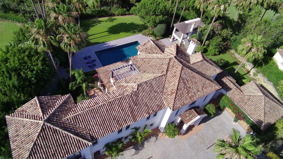 - Exquisite 6-Bedroom Classical Villa in an Idyllic Setting, Situated on the Frontline of Almenara Golf with Breathtaking Panoramic Views of Almenara and San Roque Club Golf Courses. This immaculately maintained villa spans three floors, showcasing a blend of timeless elegance and modern sophistication. Awe-inspiring features of this remarkable property include: - Grand cobblestone driveway, boasting ample space for multiple vehicles, complemented by a carport accommodating two cars and a two-car garage. - Six luxuriously appointed bedrooms. - A delightful social room, exquisitely furnished with a top-tier bar, pool table, darts, and an inviting lounge area, offering the perfect ambiance for entertaining guests. - Expansive home cinema - Recently renovated heated exterior pool with beautiful tiling and lighting effects. - A splendid poolhouse with two levels, thoughtfully designed to facilitate outdoor gatherings, complete with a barbecue area. - Private terraces accompany the three main bedrooms on the top floor, affording breathtaking panoramic views and en suite bathrooms. - Adorned with a flourishing orchard, with avocados and an array of fruit trees. - Sprawling across an impressive 3422 square meters, the villa encompasses a generous plot, offering ample space for various outdoor activities. - Immaculate marble flooring. - Hot/cold air conditioning and underfloor heating, spanning the entirety of the villa. Nestled within the highly coveted Sotogrande F-Zone, this exceptional property offers a truly enviable lifestyle, characterized by tranquility and luxury. Despite its secluded charm, the villa is conveniently located within a short drive from an array of amenities, golf courses and recreational activities. The prestigious Sotogrande International School is also within close proximity. Experience the epitome of refined living in this extraordinary villa, where timeless elegance meets contemporary opulence.