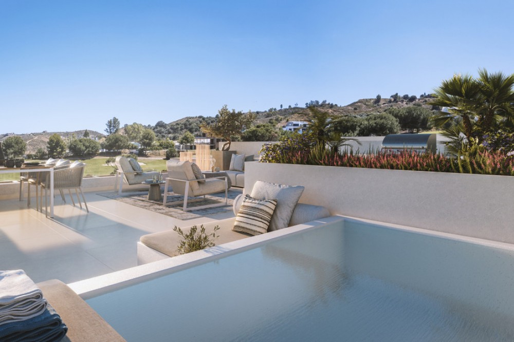 - New Development: Prices from €1,100,000 to €1,100,000. [Bedrooms: 3] [Bathrooms: 3] [Built size: 150m2]. Exclusive Branded Residence comprising of 58 incredible 2 and 3 bedroom frontline golf homes to be built to the highest specification overlooking the renowned La Cala Resort Golf course. Reaching the pinnacle of contemporary design, these exceptional properties are perfect as a family home, a rental investment or somewhere in between. This residential first development means future owners will have full access to extensive array of hotel like facilities at their command, ranging from private chefs, fulltime concierge, cleaning, laundry, pre-arrival shopping all on demand. For clients looking for a robust class leading investment, there is also a world beating rental programme available fully managed. The modern and sleek design of these townhouses has been expertly undertaken with the importance of light and space at the top of the wish list. The contemporary open plan layout has been designed to blend seamlessly with floor to ceiling windows leading to the expansive private terraces and solariums. These private outdoor spaces have been created to maximise the enviable front line golf views appreciated from the development. Two and three bedroom units ensure there is a variation in layouts, with many of the homes benefitting from a huge 11M wide living space and terrace. Over 70% of the units have private swimming pools included as standard and also benefit from large gardens and expansive rooftop solariums with outdoor kitchens. Working with our experienced interior design partners our bespoke furniture packages have been created to compliment the bright and airy interiors. Overlooking the 5th and 6th Holes of La Cala South course, the complex brings a new level of luxury to the area befitting of its outstanding surroundings. Nestled at the foothills of the Sierra de Mijas national park and just 7 minutes from the bustling beach front town of La Cala de Mijas, La Cala Golf offers a unique blend of stunning natural vistas surrounded by modern amenities and fantastic local restaurants and bars. Tastefully designed by renowned Spanish Architects, the development is uncompromising in providing outstanding views to be enjoyed from expansive living spaces usually reserved for much larger homes. Residences such as these offer homeowners a much elevated ownership experience, as they offer the facility for owners to dip in and out of hotel level servicing at their leisure, whether this be filling the fridge for your arrival, daily cleaning on demand whilst your there or you need a tee time booked, world class concierge facilities are at your fingertips. This is all part of being part of the world renowned residences portfolio cementing our passionate pursuit of the luxurious brand standards that one would expect with a global 5* hotel brand. There will be state of the art fitness facilities onsite not to mention special rates to golf courses in the area. Furthermore, special access to the facilities at our sister resorts on the Costa del Sol ensure that your new home is the gift that keeps on giving.