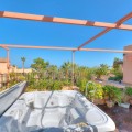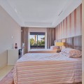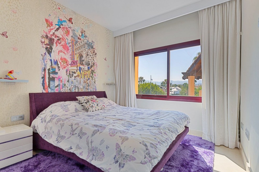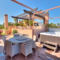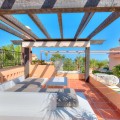 - This breathtaking refurbished duplex penthouse offers a stunning beachside retreat, just steps from the wonderful promenade and beaches of San Pedro de Alcántara. The residence is bathed in natural sunlight throughout the day and features mesmerizing views of the lush communal gardens and the Mediterranean Sea. On the upper level, you'll discover the impressive master suite radiating elegance and sophistication. With high beamed ceilings, the master suite boasts a modern bathroom complete with a luxurious bath, double sink, and a spacious shower that doubles as a Hammam, offering a spa-like retreat within your home. The master suite gracefully extends onto two expansive terraces: one featuring a barbecue, kitchenette with a sink, dishwasher, wine fridge, ample storage, and a relaxing jacuzzi; and the other offering a partially covered large sitting area, perfect for al fresco dining. Recently upgraded to the highest standards of modern luxury, the property welcomes you with a partially renovated kitchen, equipped with top-of-the-line appliances and an integrated utility room, perfect for seamless daily living. The spacious living room and one of the guest bedrooms open onto the main-level terrace, providing a serene setting to enjoy the verdant garden views. This property also offers a convenient parking space and storage room in the underground communal garage, ensuring both practicality and security. The community is a tranquil haven, featuring extensive gardens with serene ponds, a large pool, and the added assurance of 24-hour surveillance. Offering unmatched luxury and convenience, this penthouse provides an exceptional living experience near the beach, with all amenities within easy walking distance. Whether you desire a permanent residence or a dreamy vacation retreat, this property ensures a lifestyle of elegance and sophistication on the beautiful Costa del Sol.