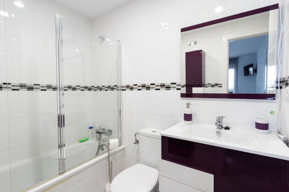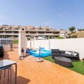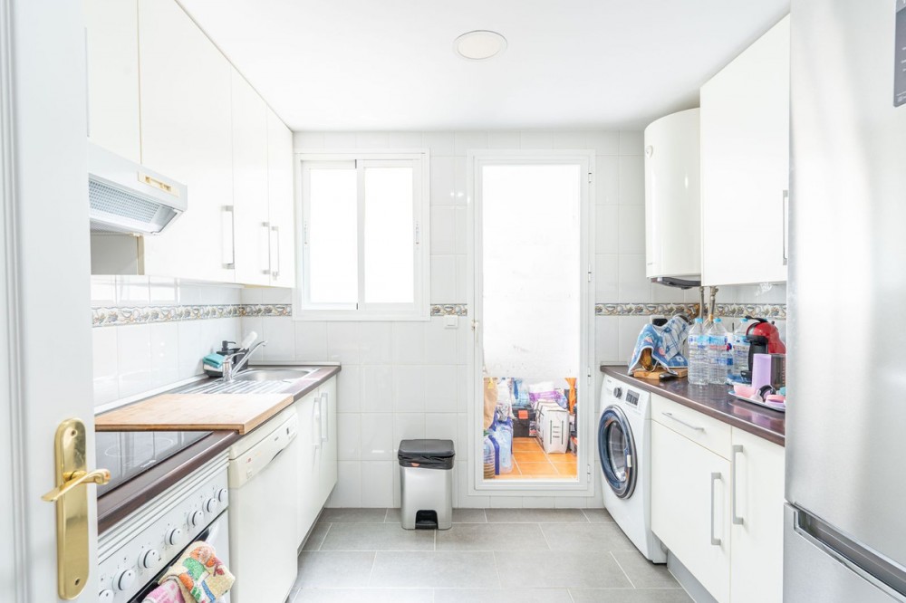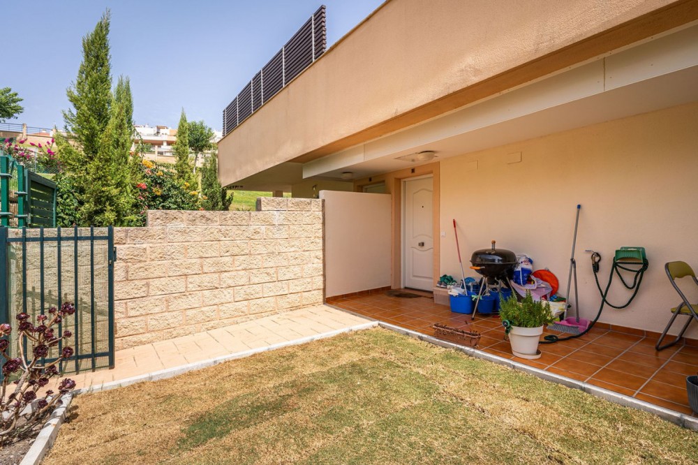 - Beautiful ground floor apartment with incredible panoramic sea views. The house has an outdoor garden where you can sunbathe, install a plastic pool, or spend some time with your family and/or friends having a drink. Then we have an entrance that leads to the independent kitchen, which includes a separate laundry room, which provides you with more space and comfort. We go to a very spacious living room with lots of light, with direct access to the covered terrace, with impressive views of the entire bay, where you can relax having a drink, talking, reading, while you watch the sea. And on that same terrace you have stairs that take you to a Solarium, where you can spend time lying down, relaxing, while you observe the incredible views of the sea. It is followed by 3 bedrooms with quite large built-in wardrobes, one of them with an en-suite bathroom for greater comfort and privacy. In addition, the house has centralized air conditioning in all rooms. The house has a very comfortable covered garage. And of course with a community pool to take a good bath or sunbathe. The urbanization is located in a very quiet area, without noise, to enjoy greater tranquility. About 10 minutes from the beach by car, and about 7 minutes from supermarkets, shops, and other restaurants offering a variety. It also has good communication with Estepona-Marbella-Málaga, with access to the highway / highway. It has areas to play golf nearby in about 5 minutes. An ideal place to enjoy good weather, leisure and beach.