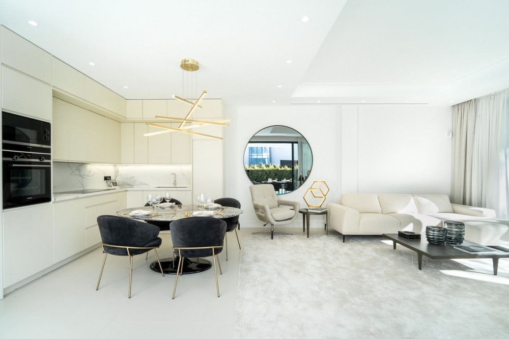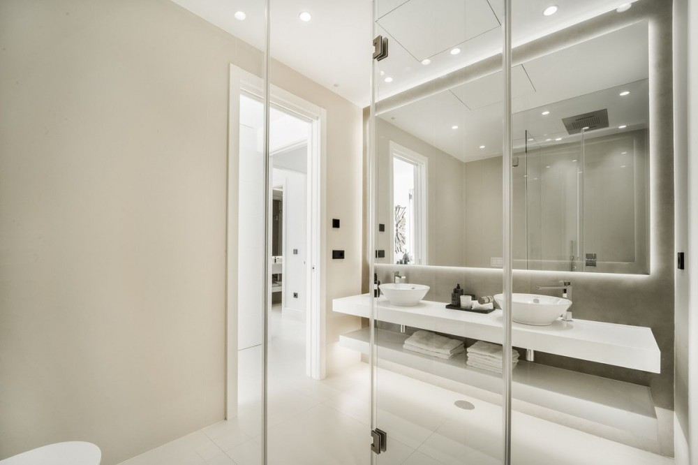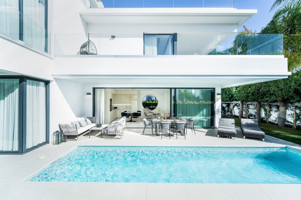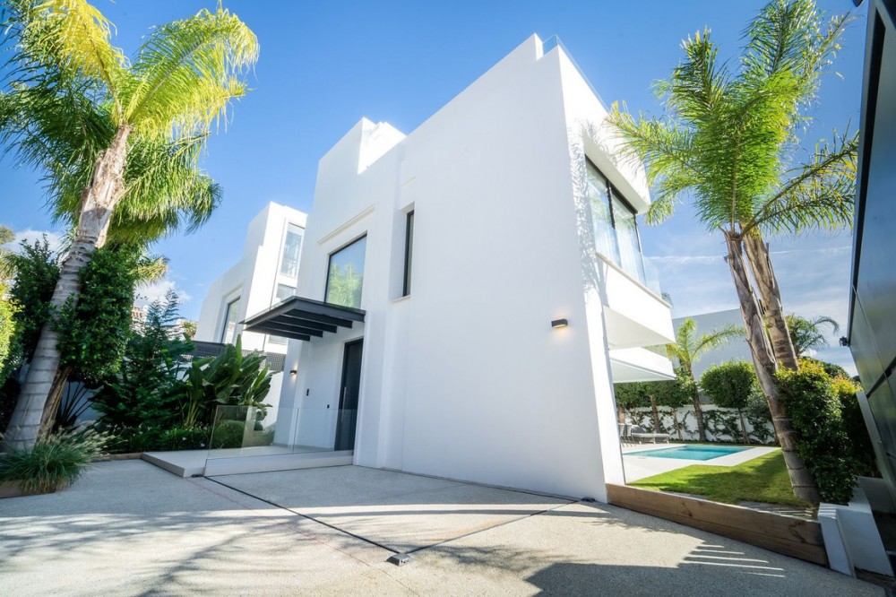 - These marvelous new modern villas for sale are located in one of the most luxurious residential areas in Marbella – Golden Mile, in a secure urbanization Rio Verde, just 100 meters from the beach. The villas combine excellent quality, amazing location and the best price. Each house is spacious, full of light and equipped with everything necessary for a comfortable life. It consists of 4 bedrooms and 5 bathrooms, as well as large terraces on each floor, both covered and uncovered, perfect for barbecue, gatherings with friends or just sunbathing to your heart’s content. A private swimming pool will bring joy to your whole family throughout long Spanish summer. These villas in the Golden Mile are located close to the beach, three minute walk away from Puerto Banus and within a walking distance from the supermarkets. The villas offer beautiful sea views and are the perfect choice both as a holiday residence and as a family home.