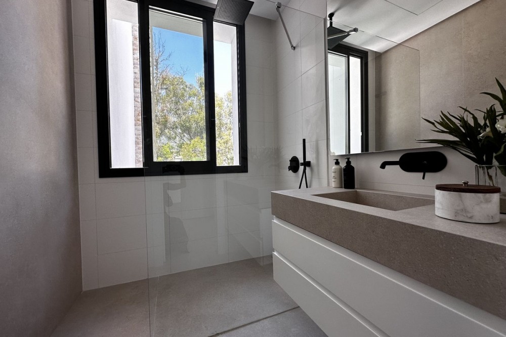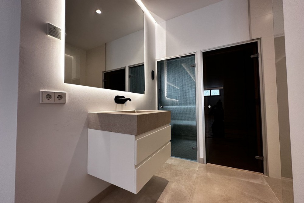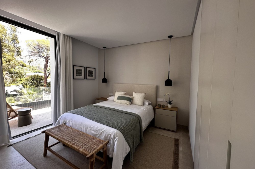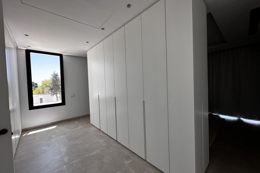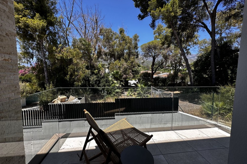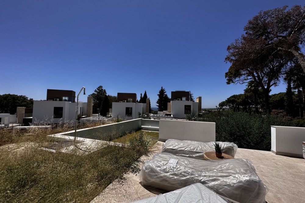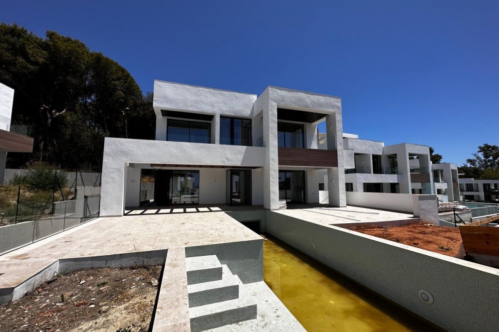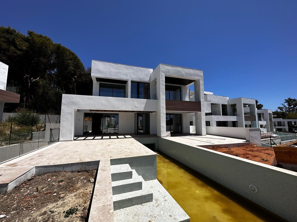 - Modern luxury villa of exceptional qualities is located in a gated community, consisting of only 15 villas, with 24 hour security guards and concierge services situated in a green oasis on the edge of the famous Golden Mile and just a few metres from the beach, a few minutes walk from the historic old town. With a plot of 1000m2, a total living area of 730m2, large terrace of 225m2 and includes 5 bedrooms and 5 bathrooms, a spacious living room, an open plan kitchen equipped with the highest quality furniture and appliances, a private lift connecting each level of the property, cinema, sauna and hammam, under floor heating, a rooftop solarium with beautiful views towards the sea and private garage for 2 cars + 2 parking spaces. Both the garden and pool will be centrally maintained by the community for a carefree lifestyle. Construction of the villa is finished.