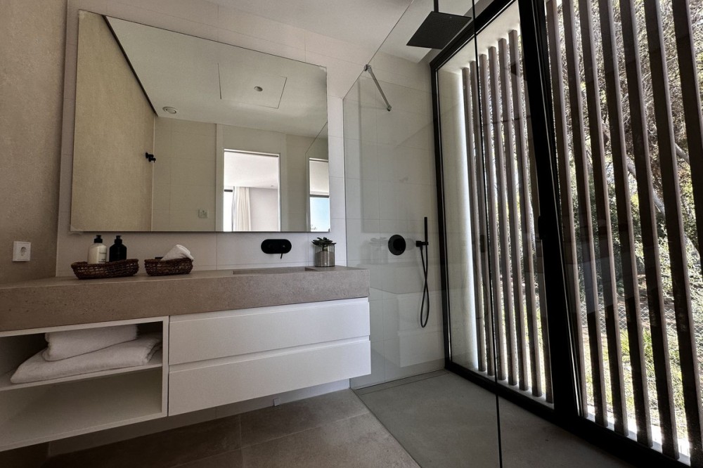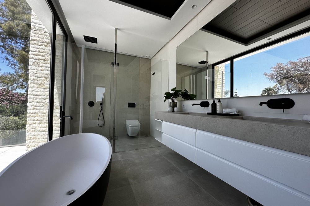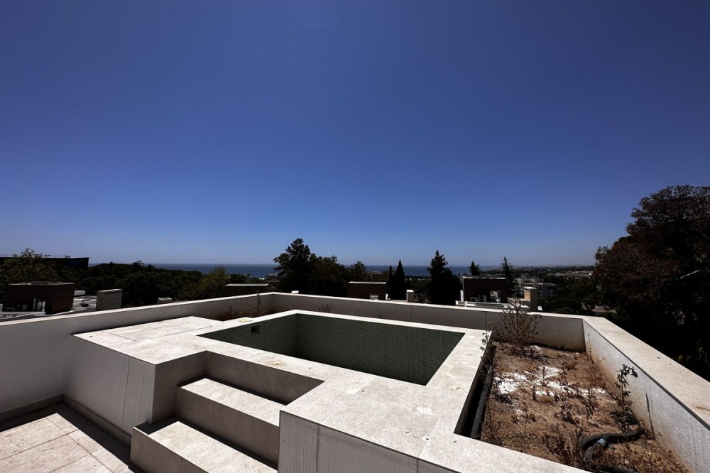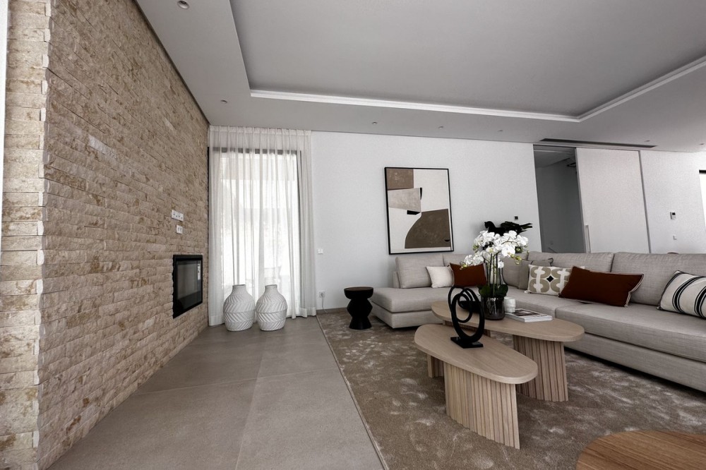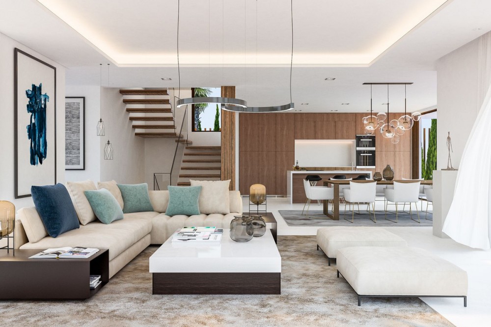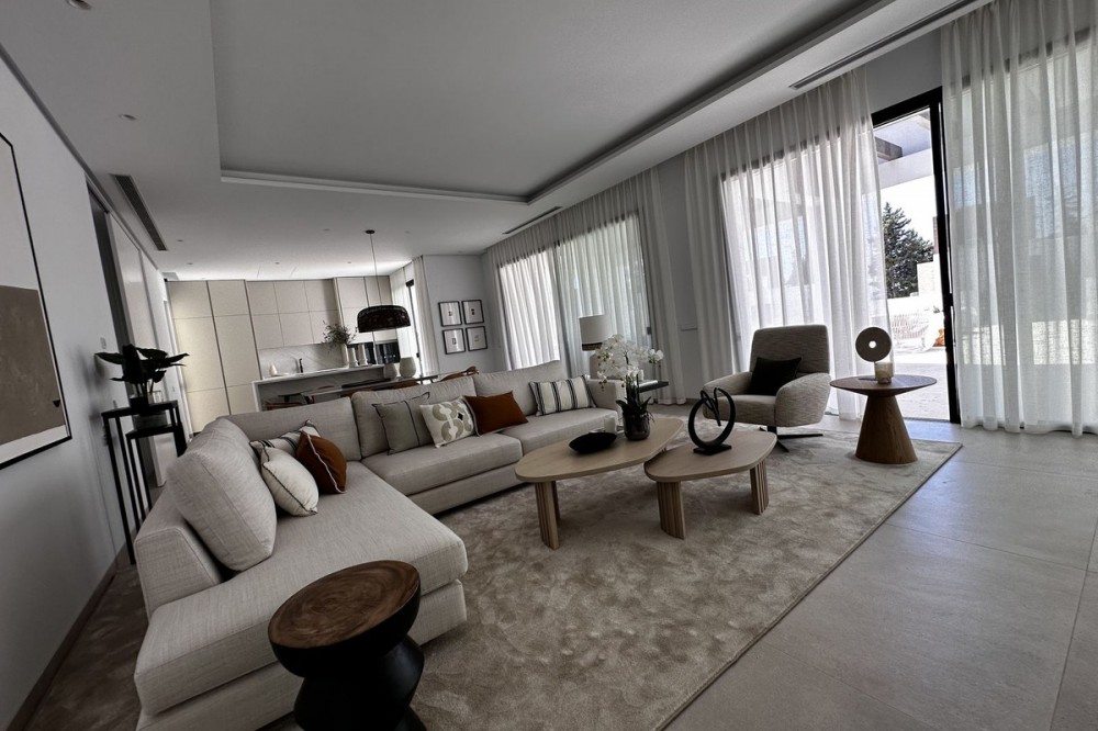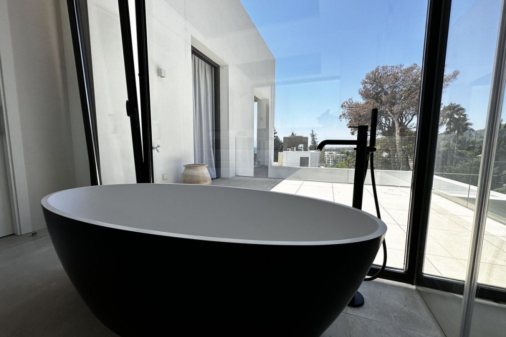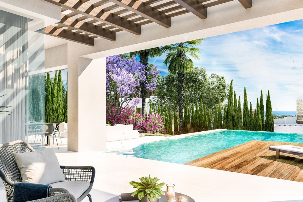 - Modern luxury villa of exceptional qualities is located in a gated community, consisting of only 15 villas, with 24 hour security guards and concierge services situated in a green oasis on the edge of the famous Golden Mile and just a few metres from the beach, a few minutes walk from the historic old town. With a plot of 1000m2, a total living area of 730m2, large terrace of 225m2 and includes 5 bedrooms and 5 bathrooms, a spacious living room, an open plan kitchen equipped with the highest quality furniture and appliances, a private lift connecting each level of the property, cinema, sauna and hammam, under floor heating, a rooftop solarium with beautiful views towards the sea and private garage for 2 cars + 2 parking spaces. Both the garden and pool will be centrally maintained by the community for a carefree lifestyle. Construction of the villa is finished.