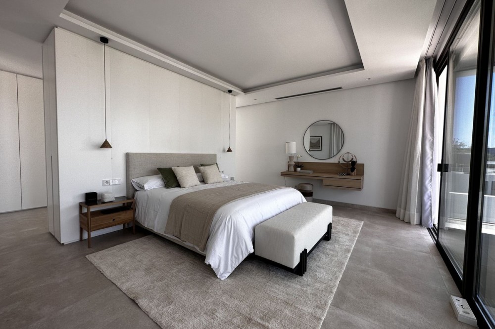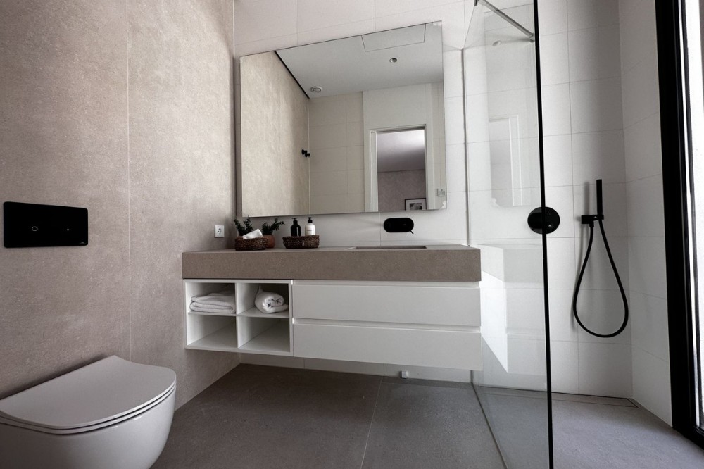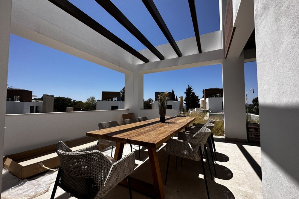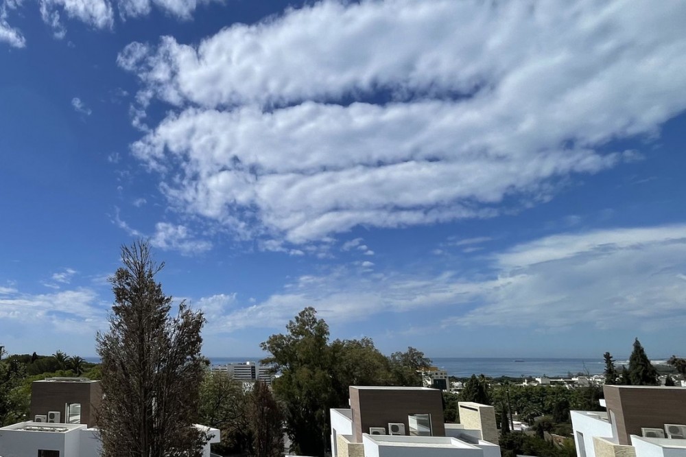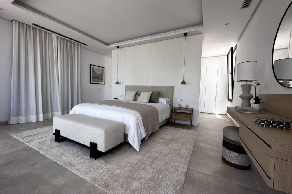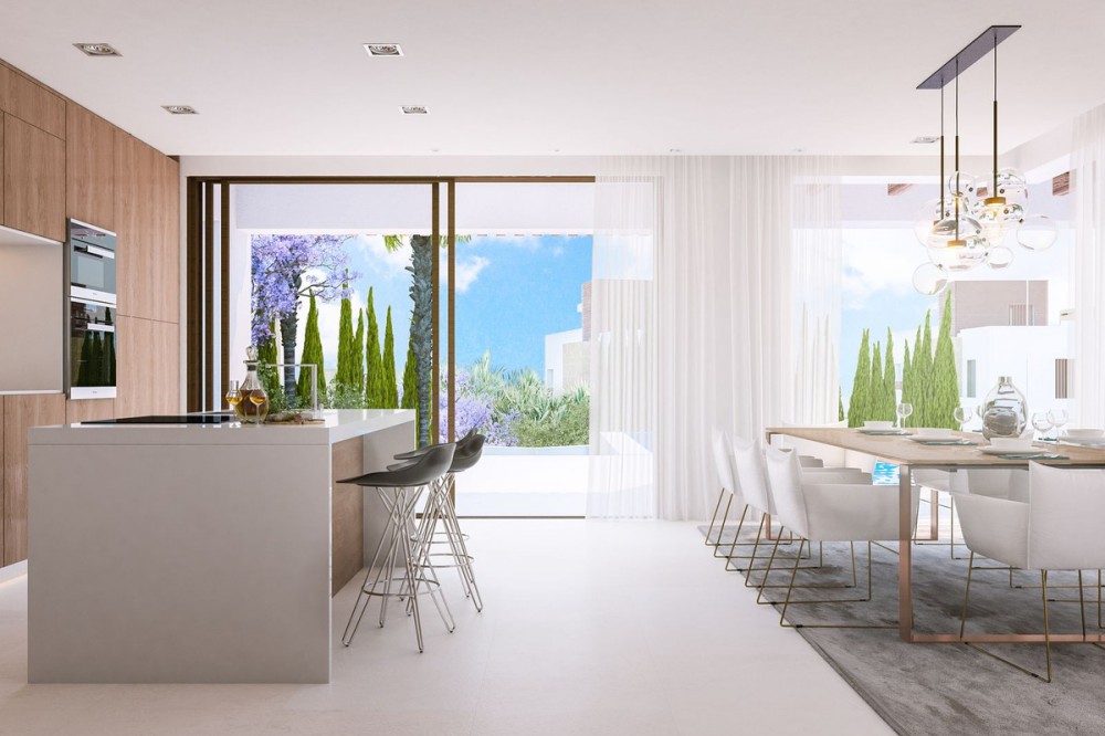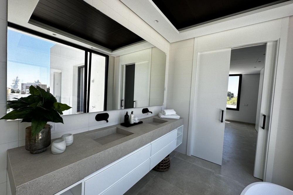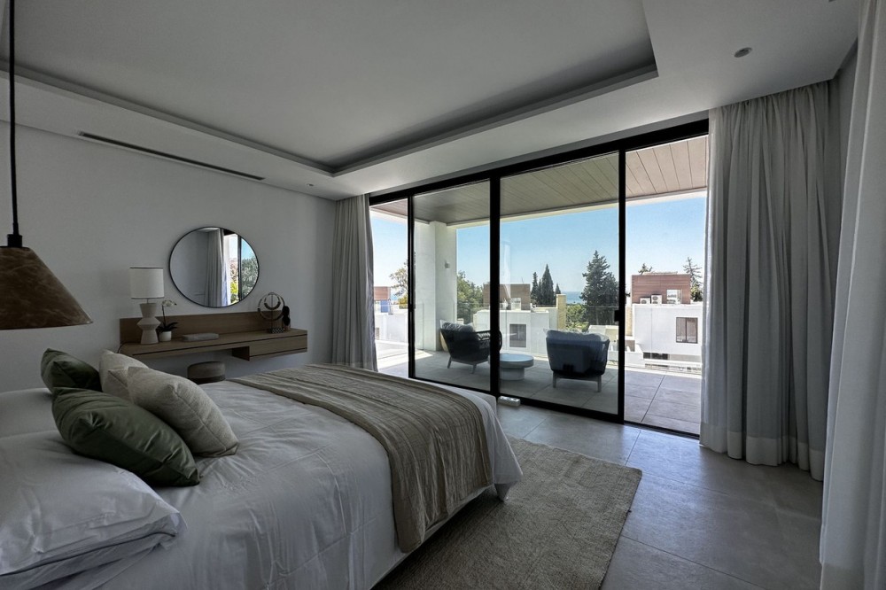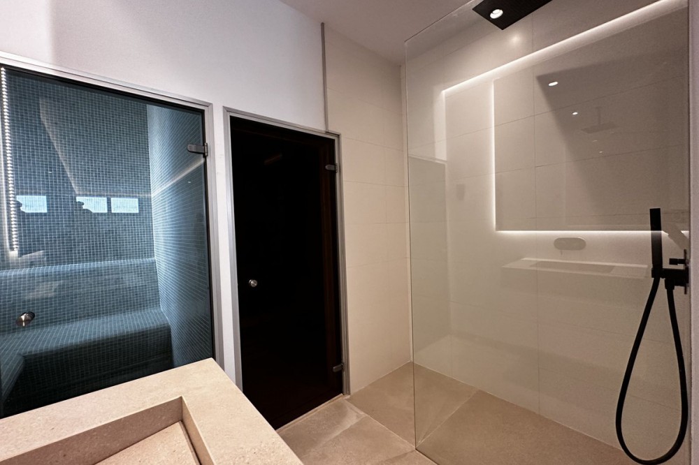 - Modern luxury villa of exceptional qualities is located in a gated community, consisting of only 15 villas, with 24 hour security guards and concierge services situated in a green oasis on the edge of the famous Golden Mile and just a few metres from the beach, a few minutes walk from the historic old town. With a plot of 1000m2, a total living area of 730m2, large terrace of 225m2 and includes 5 bedrooms and 5 bathrooms, a spacious living room, an open plan kitchen equipped with the highest quality furniture and appliances, a private lift connecting each level of the property, cinema, sauna and hammam, under floor heating, a rooftop solarium with beautiful views towards the sea and private garage for 2 cars + 2 parking spaces. Both the garden and pool will be centrally maintained by the community for a carefree lifestyle. Construction of the villa is finished.