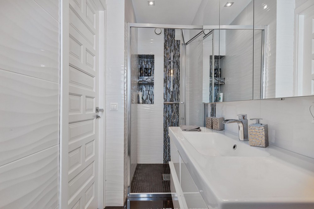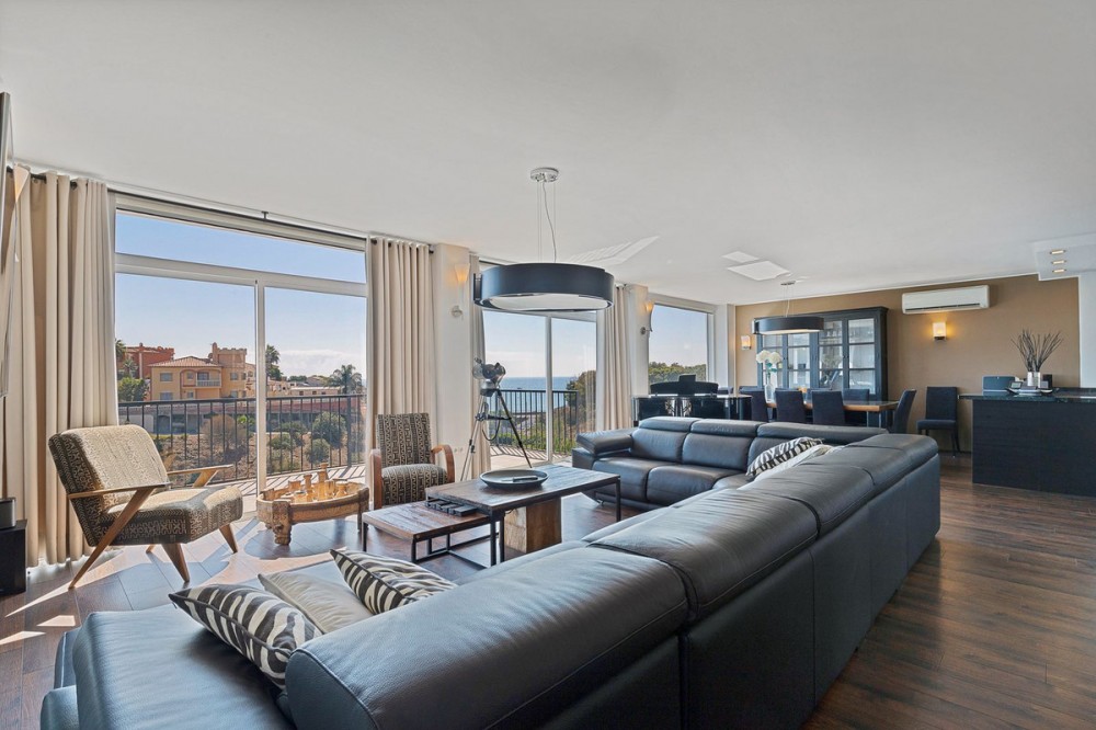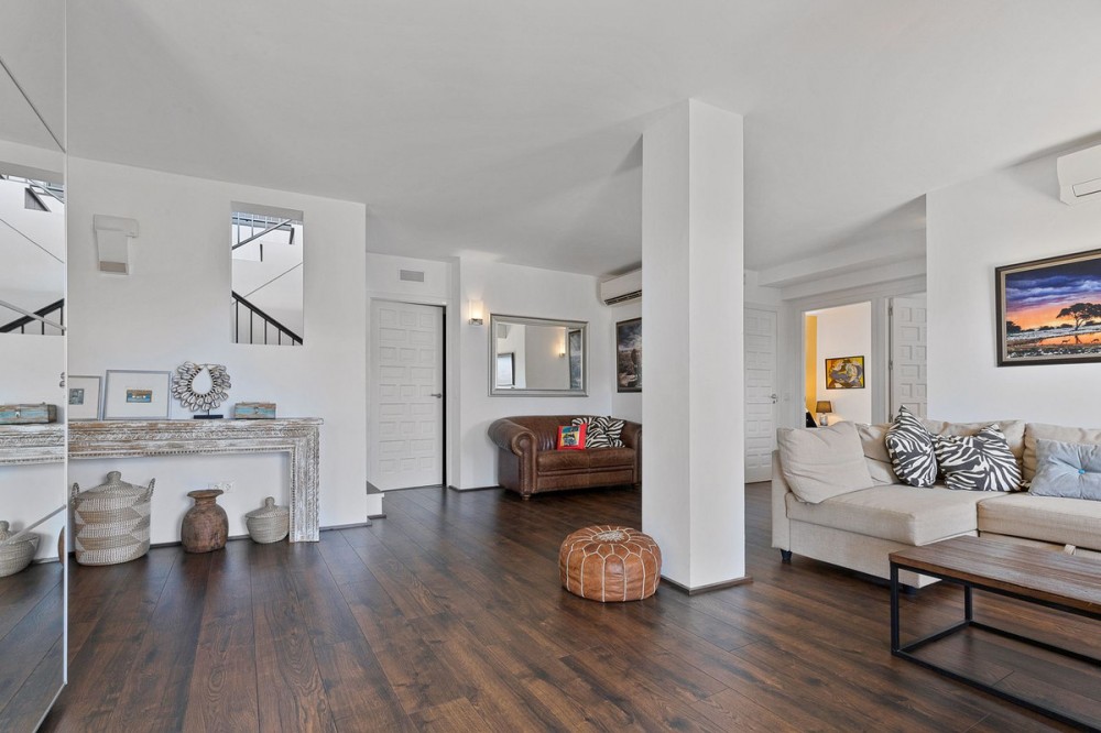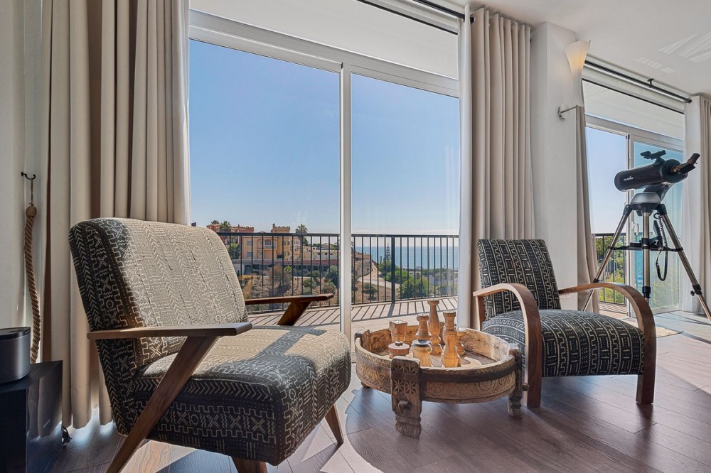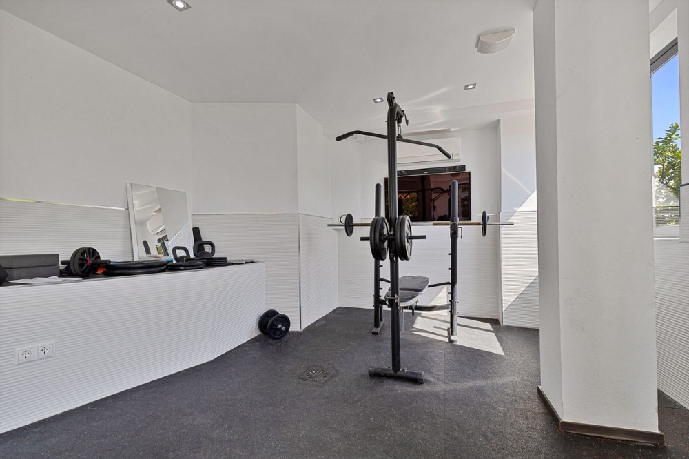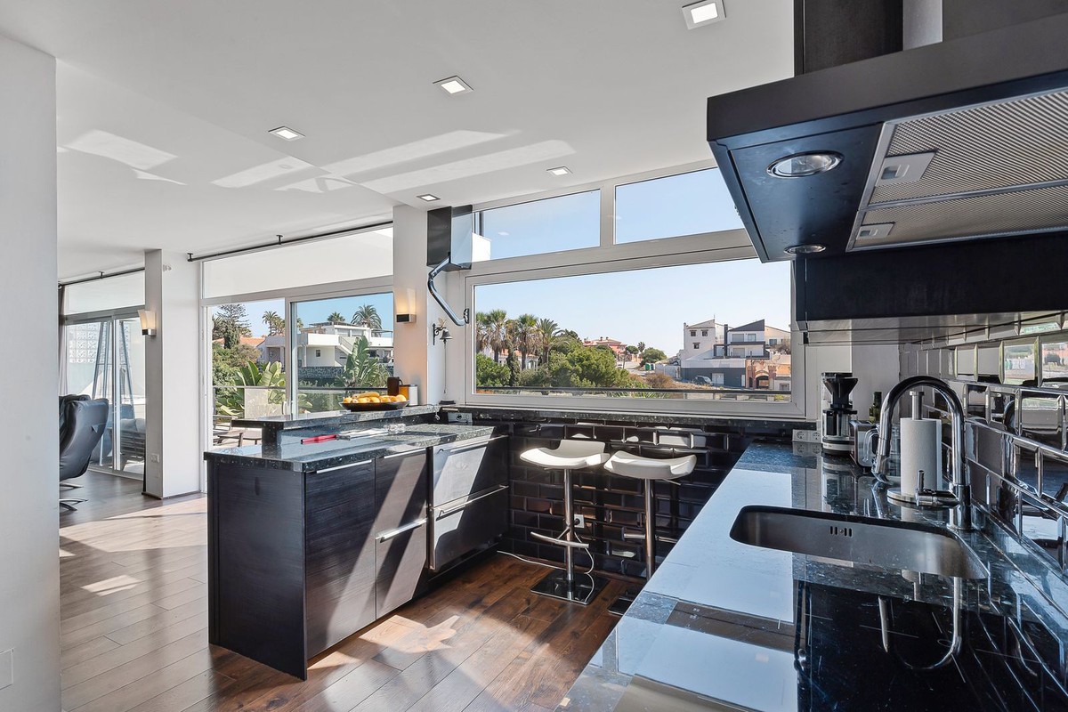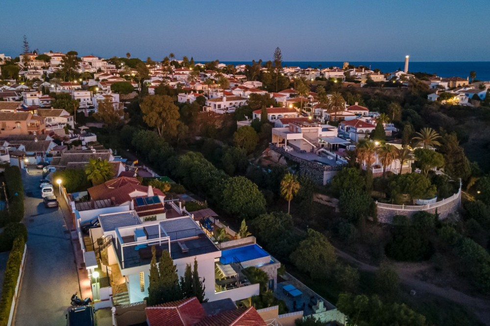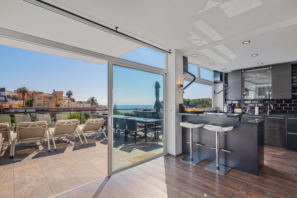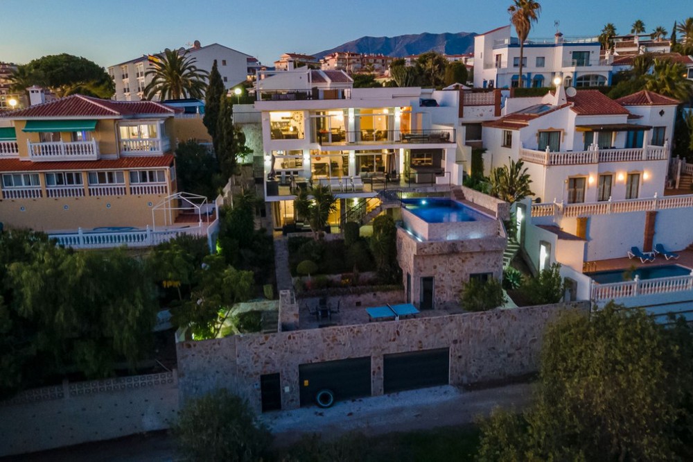 - Welcome to Villa Perla in El Faro this unique villa offers everything you could wish for in modern luxury living. The villa has been expanded and completely renovated during the years 2016-2018. The technical and constructional characteristics of the house are unparalleled in Spain. All rooms have insulated floors and stylish laminate, wet rooms have tile and underfloor heating, and the outer walls have insulation and double masonry, which ensures excellent energy efficiency. All windows and doors have thermal glass and anti-theft glass The house has an efficient mechanical ventilation system built by a Finnish company with inlet and outlet air with heat recovery. Three separate ventilation machines distribute air to a residential building, a gym and a garage. In addition, the house is connected to the natural gas network, so the domestic water and the swimming pool are heated inexpensively. In the upstairs living room, you can enjoy beautiful evenings by the gas fireplace connected to the gas network. Each room has its own separate air heat pump for cooling and heating. In addition, the living room has electric sun blinds on the inside of the window panes. Villa Perla also offers good opportunities for relaxation in the swimming pool and hot tub on the pool floor with salt water. The swimming pool also has a countercurrent device. The sauna has Helo sauna automation and a timed digital heater. The kitchen/bar on the pool floor has a bar window that opens up electrically in the direction of the terrace. The security of the house is top class thanks to electronic locking, burglar alarm equipment and camera surveillance. The lift doors in the garage and on the upper level are practical and easy to use. The apartment house has space and comfort for the whole family; 6 bedrooms, 6 bathrooms, 3 wc, 2 kitchens, 2 living rooms, utility room, storage room for linen and lockers, study with access through a secret door and a gym with air conditioning and mechanical supply/exhaust air. The sauna has two outdoor showers and a toilet. The garage can accommodate two cars and three motorcycles. The exit next to the garage leads to El Faro beach, which is less than 200 meters away, with restaurants. The property is sold with movables; two fully equipped kitchens, dining tables, living room furniture, TV chairs, bar furniture, sun loungers, outdoor furniture and all rooms have double beds (14 beds in total) and a sofa bed. In addition, the store includes two large TVs, gym equipment. Contact us, we will be happy to present this great property.