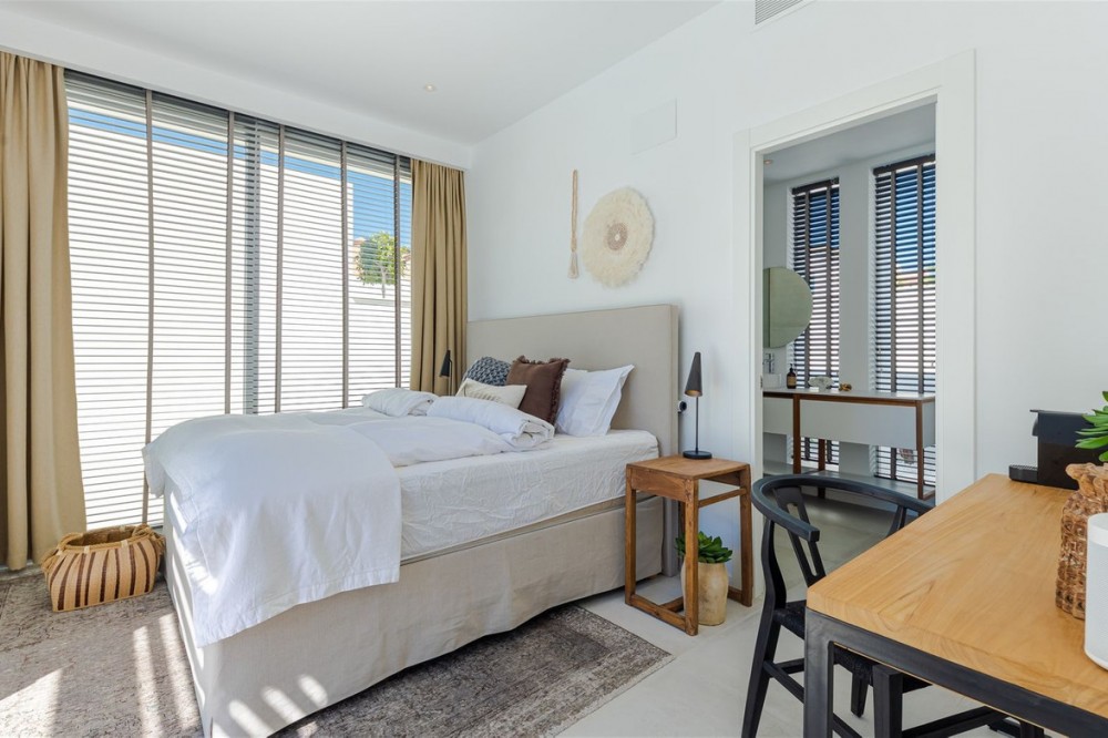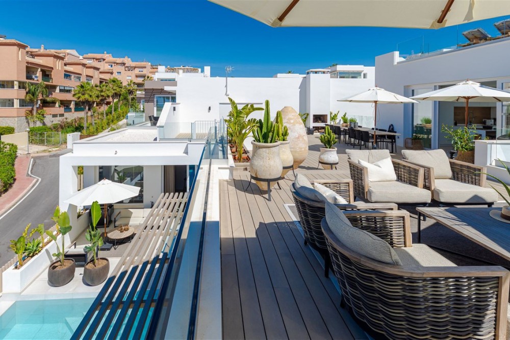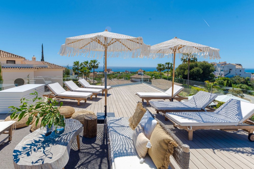 - 9 BEDROOM SOUTH-WEST FACING LUXURIOUS VILLAS WITH 2 HEATED SWIMMING POOLS, CINEMA ROOM, GYM AND WINE BODEGA CLOSE TO THE BEACH. This unique contemporary 9-bedroom property consists of TWO SEPARATE UNITS which are adjacent to each other on two adjoining plots. The properties could easily be joined together by installation of a lift or staircase if desired. Situated in a luxury, secure gated community, just 1.2 km (a 15 minute walk) from the beach, shops and restaurants in Riviera del Sol and Calahonda. This new development of 12 low-rise villas has been constructed in a contemporary style using very high-end materials. With a combined build size of 476 m2 these two properties consist of two lounges, two fully-equipped open-plan modern kitchens, two guest bathrooms and two large laundry rooms. All nine bedrooms (three in one property and six in the other) have ample fitted wardrobe space and ensuite bathrooms with underfloor heating. Nine of the bathrooms have walk-in showers, sink, and toilet and 1 bathroom has bathtub and shower. Most of the bedrooms have a semi-private outdoor space and are also equipped with a flat-screen TV. The owner has recently installed a gym with state-of-the-art equipment, a comfortable home cinema and a wine bodega with temperature control system. There is a Sonos home sound system providing excellent quality sound both inside and outside of the properties. High ceilings and large heat-resistant windows make the properties feel very spacious and bright allowing for the seamless integration of indoor and outdoor living spaces. Along with the two 8 x 4 metre heated saltwater swimming pools (with counter-current and electric cover) are a generous 89 m2 of terrace/porch areas and 2 huge roof solariums of 76 m2 and 141 m2 with glass balustrade and impressive 360 degree views over the sea and coastline. The total plot size is 977 m2. The current owners' interior design skills have transformed this property into a stunning and inviting space, perfect for daily living, as a holiday home or high rental-income property (currently rents for 12,000 Euros per week in high season). All interior and exterior designer furnishings are included in the asking price. There is gated covered parking for four vehicles and an additional two open parking spaces directly in front of the properties. Both properties are equipped throughout with air zone air-conditioning to ensure comfortable air quality and temperatures all year around, 1000 litre water reserve, water treatment system, UV resistant security glass, alarm system, safe, ample fitted wardrobe space, heated floors in ensuite bathrooms, high quality porcelain stoneware floor tiles (interior and exterior), 2 gas barbecues and video entry phone. Riviera del Sol sits on the Costa del Sol in Southern Spain midway between Marbella and Fuengirola. It is situated only a few minutes from the AP7 motorway access and the A7 national coastal road (formerly the N-340), allowing easy access to Malaga airport in 25 minutes and Marbella in 15 minutes. Riviera del Sol is a mixed residential and holiday area offering all the facilities and services needed to enjoy life comfortably. MUST BE SEEN TO APPRECIATE THE EXCELLENT QUALITIES AND POTENTIAL! VILLA 6 - 190M2 BUILD, 40M2 TERRACES, 76M2 SOLARIUM, 446M2 PLOT HALLWAY 3 BEDROOMS + 3 ENSUITE BATHROOMS GUEST BATHROOM UTILITY ROOM LOUNGE + OPEN PLAN KITCHEN (BUILT APART FROM BEDROOMS) 8 X 4 SWIMMING POOL SHARED COVERED PARKING FOR 4 CARS 1 OPEN PARKING SPACE VILLA 7 - 286M2 BUILD, 49M2 TERRACES, 141M2 SOLARIUM, 531M2 PLOT 6 BEDROOMS + 6 ENSUITE BATHROOMS (2 BEDROOMS ON LOWER FLOOR HAVE SEPARATE LOCK UP ENTRANCES) GUEST TOILET LOUNGE + OPEN PLAN KITCHEN UTILITY ROOM GYM WINE BODEGA CINEMA ROOM 8 X 4 SWIMMING POOL SHARED COVERED PARKING FOR 4 CARS 1 OPEN PARKING SPACE
