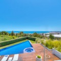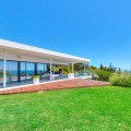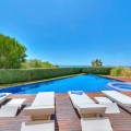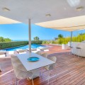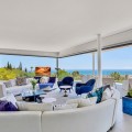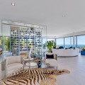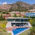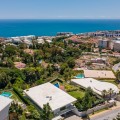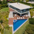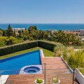 - Contemporary designer villa with breathtaking views towards the sea. The villa comprises of two floors with main entrance on the upper level. From the moment you step through the front door, you are struck by the fantastic view thanks to the floor-to-ceiling glass doors along the whole front side of the house. The upper floor is characterized by an open floor plan that houses a kitchen island, integrated kitchen cabinets, dining area and sofa group. In the middle sits a glass wine cabinet. On this floor is also the master bedroom with bathroom en-suite and private dressing room. Outside the large glass doors is a lovely covered terrace that leads out to a wooden deck and lawn. From the wooden deck, a three-meter-wide staircase leads down to the 67 m2 pool with Jacuzzi. The villa's two floors are connected by the specially designed staircase, which is the jewel of the house. On the lower level there are four bedrooms, each with an en-suite bathroom with glass walls, a guest toilet, a TV-room with a small kitchen and a fireplace, a laundry room and a large double garage. Three of the four bedrooms and the TV-room have access to the wooden deck next to the pool where, in addition to space for sun loungers and a dining table, there is an outdoor kitchen, barbecue and toilet, all protected by roll-up canvas roofs. The villa is equipped with air conditioning, under floor heating, alarms, security cameras, home automation, etc. The villa is located on one of the best plots in the exclusive Reserva del Higueron urbanization on the border between Fuengirola and Benalmadena only 15 minutes from Malaga International Airport. In the area there is the 5-star Hotel Hilton, sports club with gym, spa, padel and tennis courts and a Michelin restaurant.