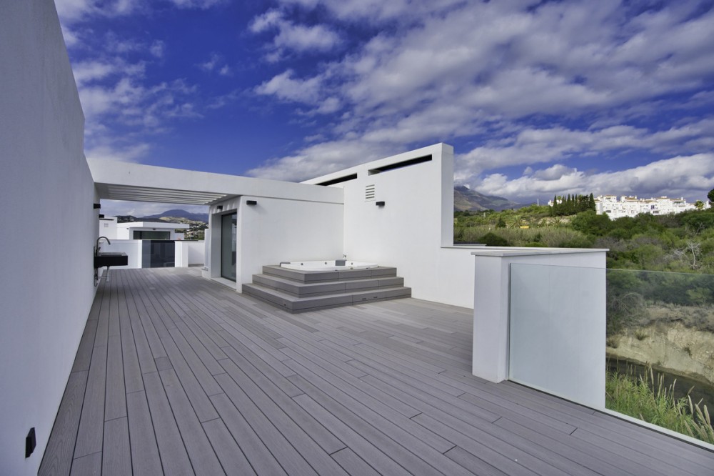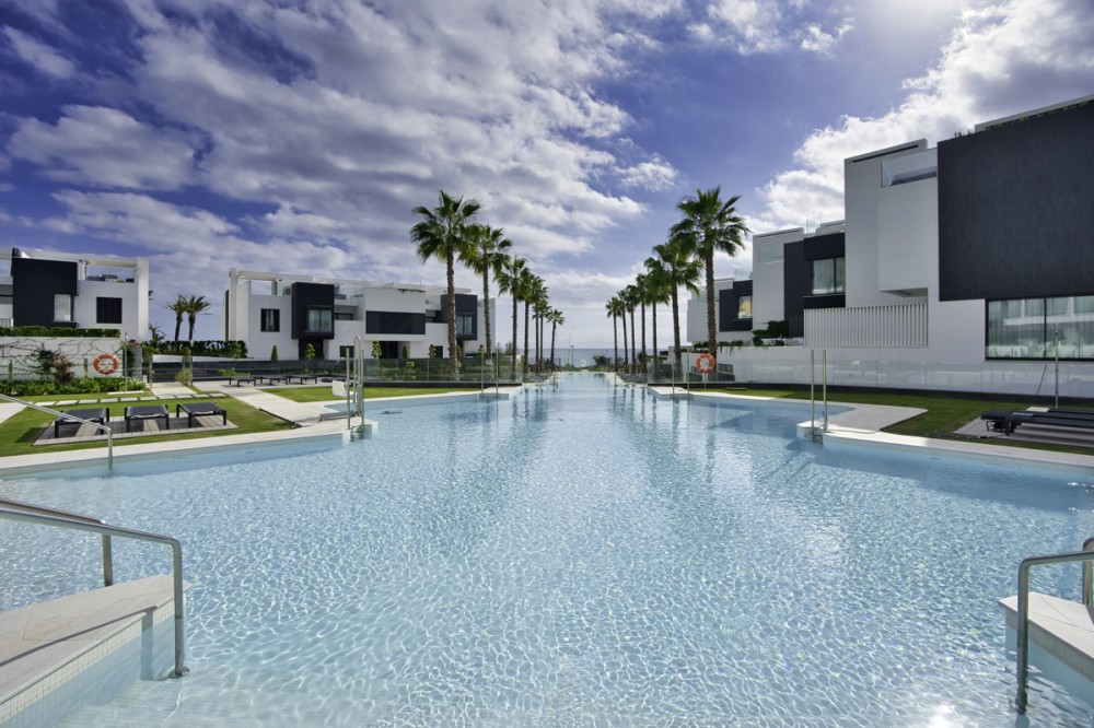 - Semi-Detached House, Estepona, Costa del Sol. 5 Bedrooms, 4 Bathrooms, Built 321 m², Terrace 69 m², Garden/Plot 120 m². Setting : Beachfront, Close To Port, Close To Shops, Close To Town, Close To Schools, Urbanisation, Front Line Beach Complex. Orientation : East, South East, South West, West. Condition : Excellent, New Construction. Pool : Communal. Climate Control : Air Conditioning, Hot A/C, Cold A/C, Central Heating, Fireplace, U/F Heating, U/F/H Bathrooms. Views : Sea, Mountain. Features : Covered Terrace, Fitted Wardrobes, Near Transport, Private Terrace, Solarium, ADSL / WIFI, Gym, Games Room, Storage Room, Utility Room, Ensuite Bathroom, Jacuzzi, Barbeque, Double Glazing, Domotics, 24 Hour Reception, Staff Accommodation, Basement. Furniture : Not Furnished. Kitchen : Fully Fitted. Garden : Private. Security : Gated Complex, Entry Phone, 24 Hour Security. Parking : Underground, Garage, More Than One. Utilities : Electricity, Drinkable Water. Category : Contemporary.