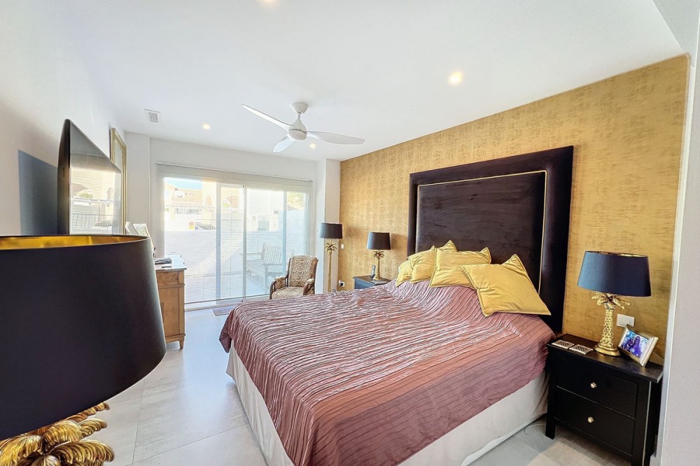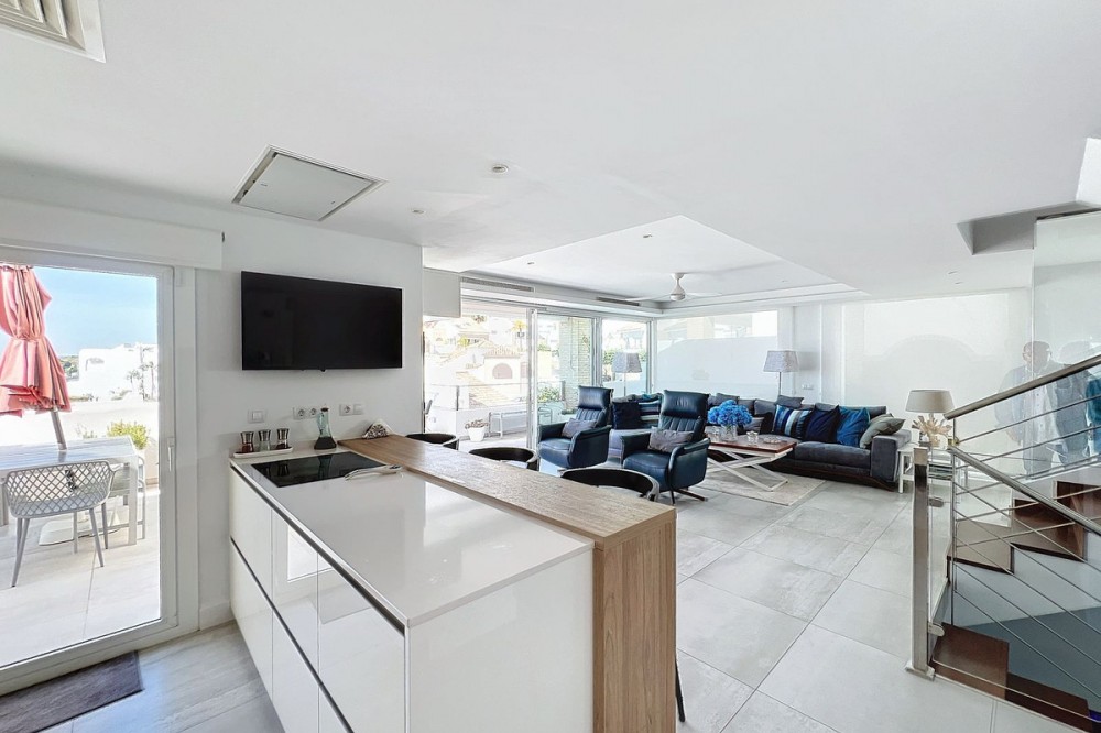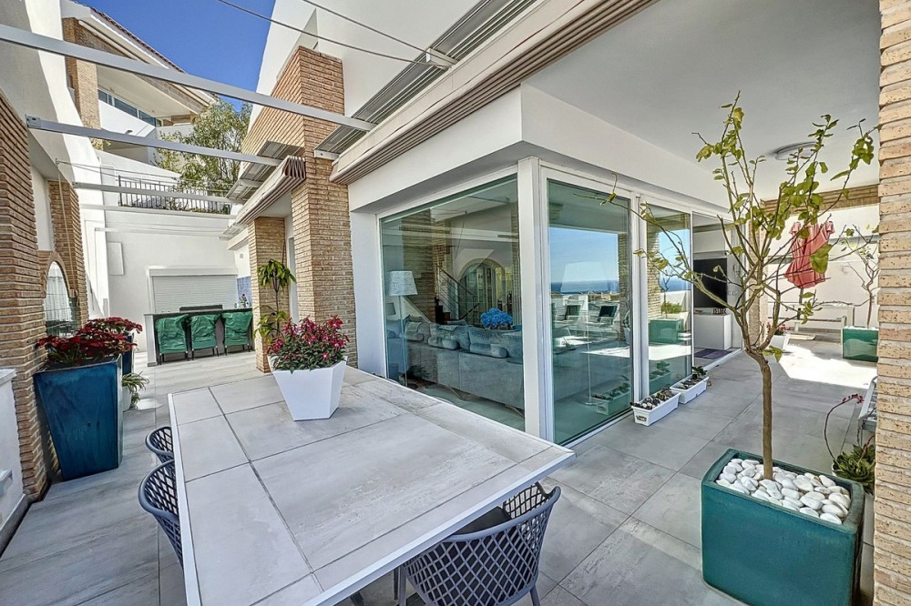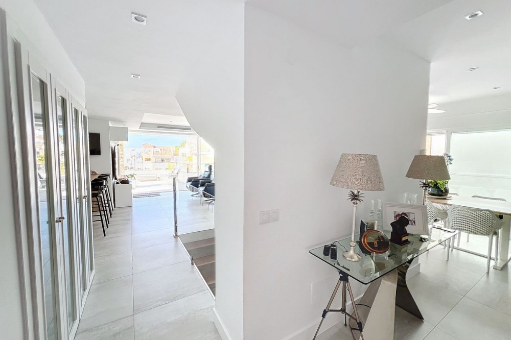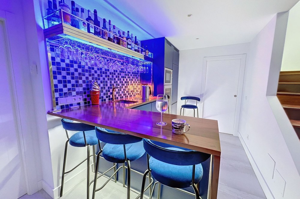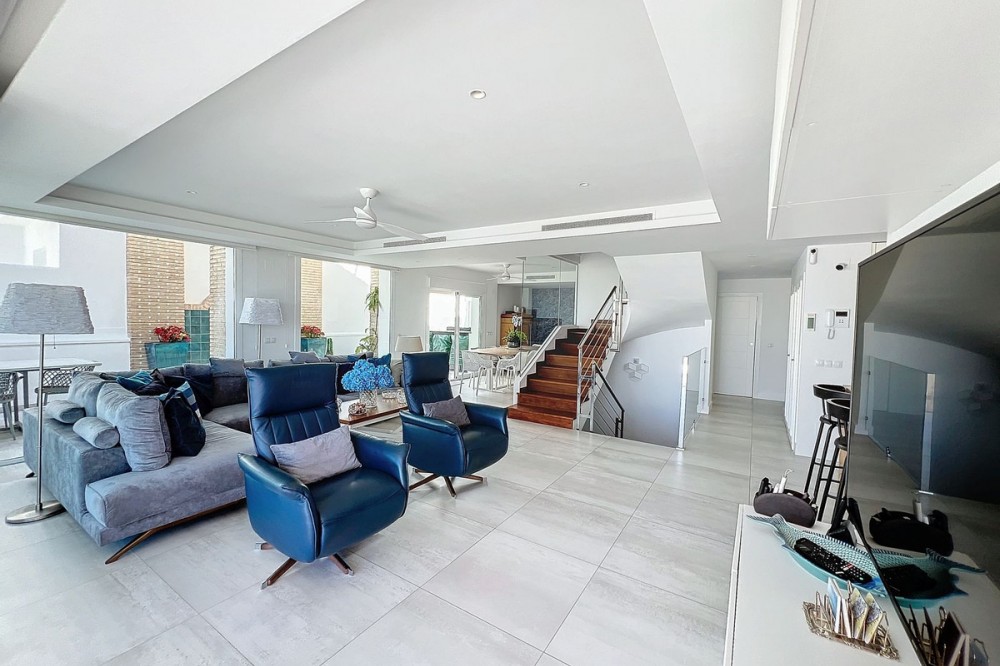 - Stunning Contemporary Villa in Big Blue Villas, Benalmádena – Coastal Luxury at Its Best Nestled in the prestigious Big Blue Villas community in Benalmádena, this beautifully renovated villa defines modern coastal living. Spanning three levels, the home offers 3 spacious bedrooms, 3 sleek bathrooms, plus an additional guest toilet – ensuring abundant space and privacy for all. On the ground floor, you’ll be greeted by a stylish open-plan living area, featuring a stunning LED-lit bar that sets the perfect ambiance for entertaining, alongside a projector TV for an immersive movie experience. Double doors open out to the terrace, extending your living space and seamlessly blending indoor and outdoor living. The master bedroom, located on this level, is a true retreat, offering a luxurious en-suite bathroom and a large walk-in dressing room. A guest bedroom with its own en-suite ensures comfort and privacy for visitors. On the first floor, you’ll find a chic lounge area that flows effortlessly into a modern, fully-equipped open-plan kitchen and dining space. A utility room adds to the convenience. The expansive terrace offers panoramic sea views, creating the ultimate backdrop for relaxation or hosting guests, complete with a built-in bar for alfresco entertaining. The top floor is home to another en-suite guest bedroom, featuring its own private terrace – the perfect spot for unwinding with breathtaking views. Outside, the beautifully landscaped gardens provide a peaceful escape, while the communal pool and well-equipped gym offer fantastic opportunities for leisure and fitness. A dedicated BBQ area ensures you can enjoy the outdoors year-round, and with multiple terraces, private parking, and direct beach access, this villa provides the perfect blend of convenience and luxury living. The villa also boasts an elevator for easy access to all three levels, adding to the comfort and accessibility. For those looking for a fully furnished home, the villa is available in option with a range of high-end furniture and appliances, including 5 fridges, 3 dishwashers, 2 washing machines, 2 tumble dryers, and 3 TVs – for the price of €100K. With easy access to the beach and all nearby amenities, this villa offers an unparalleled living experience in one of the most sought-after locations on the Costa del Sol.