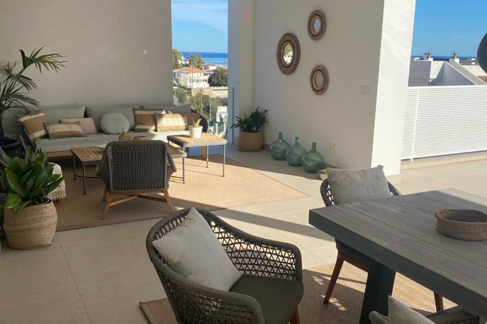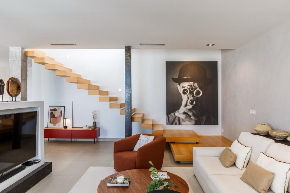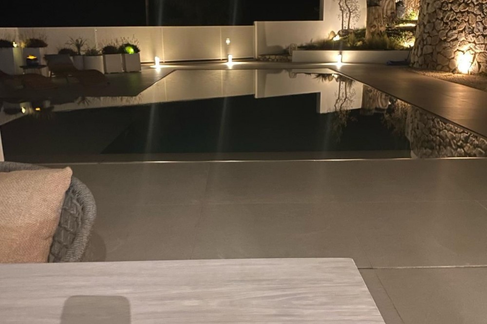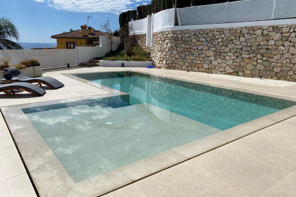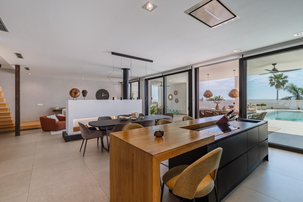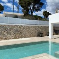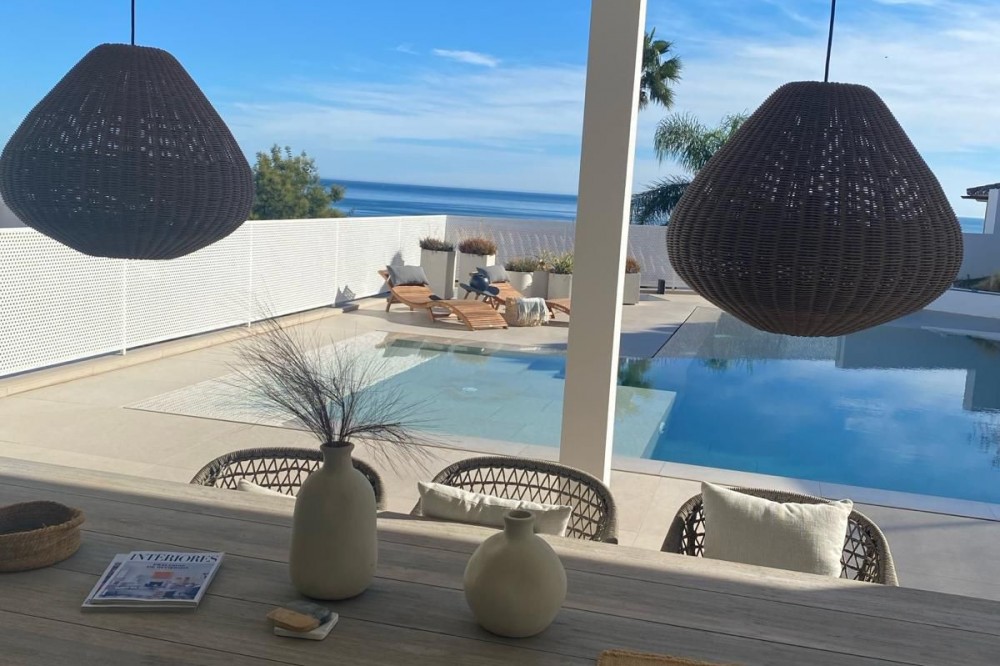 - The plot has 1.374 m2, totally fenced with walls and fences and perimeter lighting. The house has 330 m2, distributed in four bedrooms (three of them en suite), five bathrooms, open plan living room and kitchen, pantry and a large hall. All this is on one floor, except for the master bedroom (about 60 m2) which is on the second floor. This room has a large dressing room, hydroplus bathtub, a large worktop with two washbasins, where two large shower cubicles (double shower plus toilet and bidet) are located to the right and left. The house is one and a half years old, so it is brand new and freshly decorated. Most important installations: solar sanitary water, aerotermia for underfloor heating and fan coil with independent thermostats in all the rooms, double plasterboard with acoustic insulation in all the interior, alarm, fireplace, security glass, swimming pool with saline chlorinator, covered porch of 4x14 metres, independent machine room, and parking area for more than ten vehicles inside the property. The orientation is magnificent, south and the views are spectacular, just a minute walk to the beach.