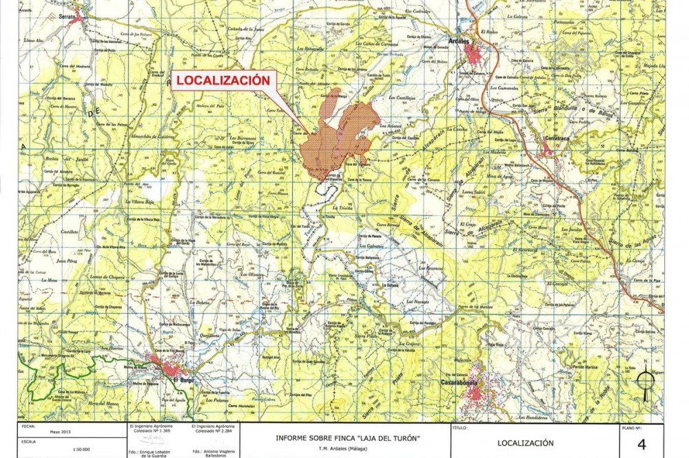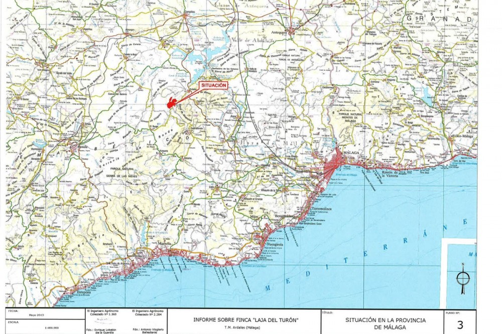 - Impressive country estate close to Málaga, possibility to build..Rural property of 313 hectares (3.130.000 sqm or 773,44 acres) located in the Municipality or Ardales in Málaga Province. ..It has buildings of more than 2,500 m2 built, within a Non-Developable Land without special protection. It is possible, therefore, to develop transformation projects in it, allowing the construction of between 10 and 15 independent villas, a hotel and/or a large equestrian center. The entire area of the land is currently used for rainfed cereal cultivation (190 ha) and olive groves (80 ha), with the rest being used for forest and pasture. The estate is also an authorised hunting area in operation...The land is now aimed for cereal (1.900.000 sqm) and olive grove (800.000 sqm), leaving a wide area to free spaces of grassy scrubland mature trees hills. Besides that, the property is a running hunting ground, fully authorized. It is actually zoned as a rural (non-urban) area under no special limitations. Due to the lack of any special urban constraints, the plot may be subject to urban activities or transformation...The estate is located at the bottom (but out) of the Sierra de las Nieves, a Nature Reserve legally protected as a National Park —one of the 17 existing in Spain—, a place of a unique beauty and very rare natural conditions: it is even possible to see wild mountain goats on the fields —not to mention the extraordinary play of boars and deers actually hunted in the existing hunting ground of the estate. A Spanish firs colony, the southernmost of Europe, spreads out just a few meters away from the boundaries. By the other side of the land, to the West, the property is surrounded by a governmental mountain of public use —entitled to the Agencia Andaluza del Agua—, colonized by a magnificent Mediterranean pine forest, fully protected and publicly open without any restriction, an area that truly extents the possibilities of beneficial use and enjoyment of the plot, in an extraordinary manner. In any case, the estate is outside the territory subject to restrictions as a result of the National Park, and is therefore not affected by those restrictions...The estate has a very addecuate location regarding the infrastructures of the area: just 10 minutes away from the town of Ardales and, from there, 30 minutes far from the Málaga Airport by the new Málaga-Sevilla highway (fully approved and partially built through the first 30 kms. stretch), 20 minutes away to the high-speed train Santa Ana Station (AVE), in Antequera, and 1 hour from Marbella...Through the very estate, it runs the Turón river, the most important tributary of the main Málaga dam (pantano del Guadalhorce), a very stable watercourse, with a significant water level, which provides its habitat to the wild mustelids that can be seen on its banks, an important river of limpid waters that runs among ponds, small lakes and noisy waterfalls, shaping an alluring nature gully, crowned by rugged rock formations that give its name to the estate (\"La Laja del Turón\"), rock walls that are one of the preferred destinations for the climbing sport in Málaga province...In the estate, there is a very large farmhouse, in a good state of conservation and in full farming service: it is equipped with two service dwellings, of moderated dimensions, several well connected farm buildings, of about 2.500 m2, with a detached box stalls building for housing horses. The plot is provided with another two former farms wrecks, quite distant to each other. All of the buildings are legally subject to reconstruction, that will allow the execution of any kind of farm or ranch, with its complementary farm facilities. ..Location coordinates of the estate in Google Earth are as follows:..36 ° 50'40.47 \".N 4 ° 53'44.17\" O.