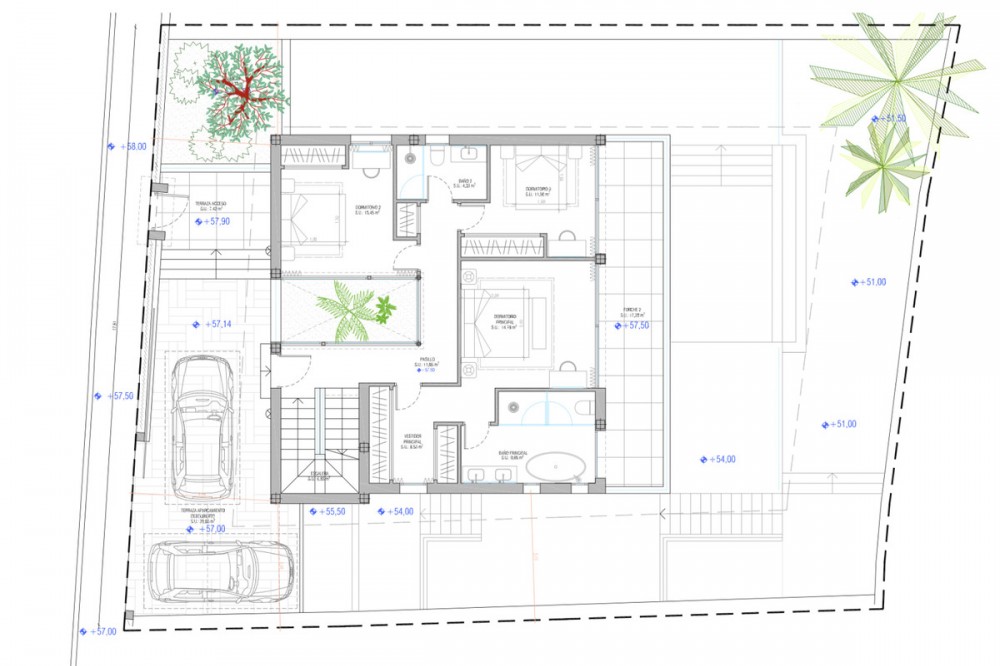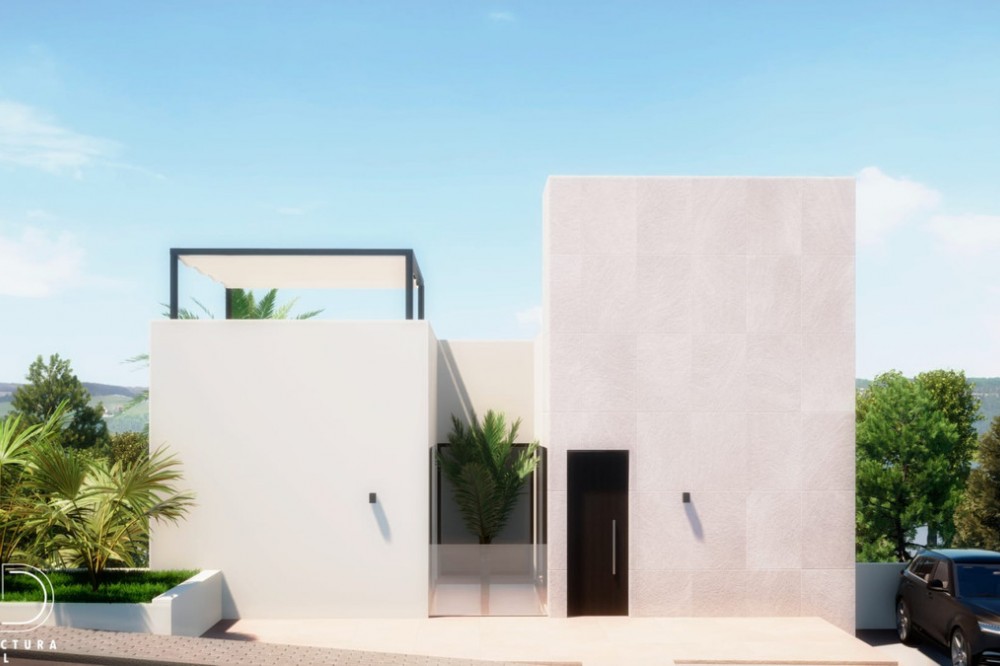 - Modern villa under construction – ready by the end of next year Construction has already started on this 5-bedroom, 4-bathroom villa, and the building process will take around 14 months. Realistically, the home will be completed by the end of next year. The design combines clean Scandinavian lines with modern comfort, creating a practical and stylish home. On the ground floor you’ll find a bright open-plan living room with kitchen and dining area, one bedroom, and a bathroom. From here you walk straight out to the terrace, pool, and outdoor lounge/dining area. The first floor offers two bedrooms sharing a bathroom, plus the master bedroom with ensuite and walk-in wardrobe. Both the master and one bedroom open onto a covered terrace. This level also has an extra entrance and a parking space. The rooftop solarium comes with panoramic views, an outdoor kitchen and bar, and plenty of space for dining or relaxing. The basement includes a gym, a fifth bedroom (or storage), bathroom, and spa area with jacuzzi, steam room, and sauna. Parking is provided for up to three cars.