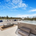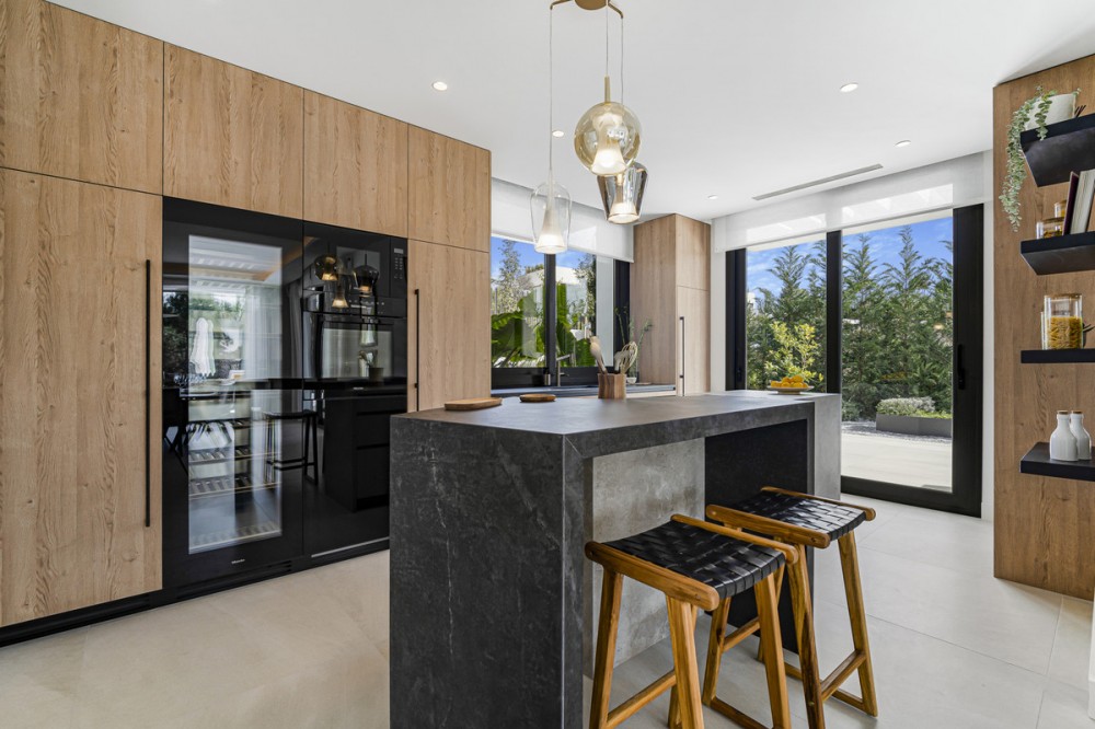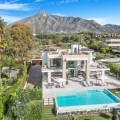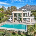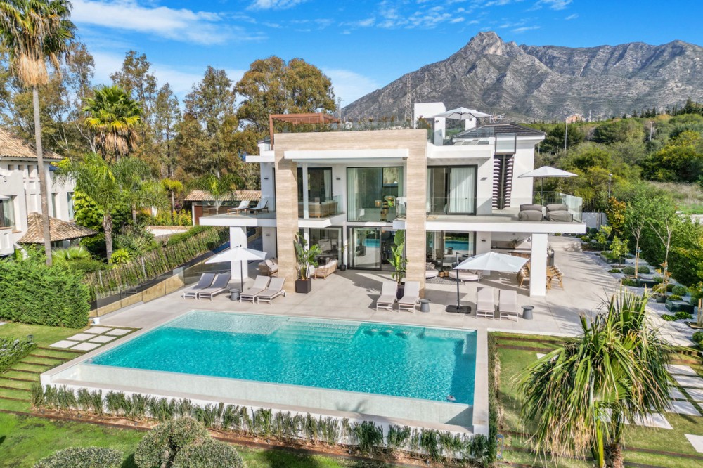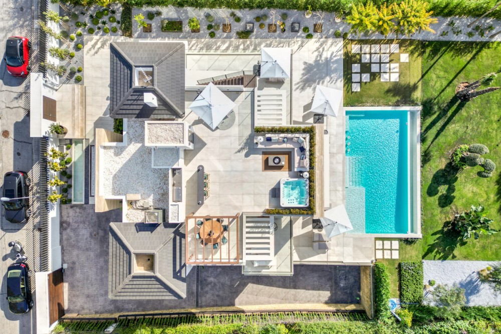 - Discover this brand-new, six-bedroom south-facing villa, situated in the prestigious gated community of Lomas del Marques, just above the renowned Puente Romano Resort on Marbella’s Golden Mile. Ideally located within walking distance to the beach and just minutes from both Puerto Banús and Marbella Town, this exquisite property combines modern luxury with unparalleled convenience. Set on a meticulously landscaped private plot, the villa features a heated swimming pool surrounded by lush greenery, creating an idyllic outdoor retreat. The ground floor offers an open-plan living and dining area that seamlessly connects to the garden, a state-of-the-art kitchen with premium appliances, and a stylish guest suite. On the first floor, you’ll find two elegant guest suites and a luxurious master suite, complete with a walk-in wardrobe and a private terrace. From this level, you can access a spacious solarium, boasting breathtaking sea views and equipped with a jacuzzi and outdoor kitchen, perfect for entertaining or unwinding in style. The lower level of the villa is designed for relaxation and entertainment, with a lounge area, bar, pool table, and two additional guest suites. This floor also provides access to a private garage with space for three cars, including electric car chargers. Additional features include hot and cold air-conditioning, built-in wardrobes, a comprehensive alarm system with security cameras, and an elevator connecting all levels of the property. Whether you’re looking for a dream family home or a high-yield rental investment, this remarkable villa—complete with a touristic license—is perfectly suited for year-round living. With its prime location and impeccable design, this property truly stands out as one of Marbella’s finest offerings.