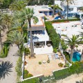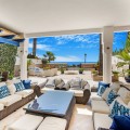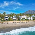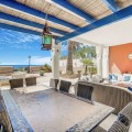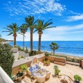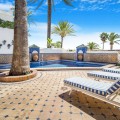 - Nestled in the heart of the Golden Mile, this exquisite Moorish-style 5 bedroom villa is one of only a few houses that can truly claim to be frontline beach. With direct access straight onto the sand, there is nothing separating you from the shoreline and the breathtaking views of the Mediterranean sea. Located a mere five-minute stroll from the renowned Puente Romano, this gem of a home offers 676 m2 of unique living space with stunning vine covered walkways and patios sheltering chic guest bedrooms all decorated in a classical and elegant traditional style, each with its own entrance and en-suite facilities. The main house offers a lovely spacious blue and white classical kitchen, as well as a generous dining area and lounge from where you can access the first of many patios. From here you can watch the sunset in style from a blend of covered and open relaxation areas for those seeking shade from the summer sun. Alternatively, enjoy the cooler evenings in front of a log fire in the spacious family room with an impressive vaulted ceiling. From here double doors lead you to a charming walled patio, featuring a private pool and lounging area. On the first floor the wide staircase leads you to the spacious master suite and dressing room, boasting captivating views and access to an additional terrace with solarium. One additional bedroom can also be found on the first floor, all maintaining the beautiful English style that permeates throughout the property. This home is a true gem, ideal for families who cherish being near the sea. The property offers a blend of charm, opulence and the luxury of coastal living.