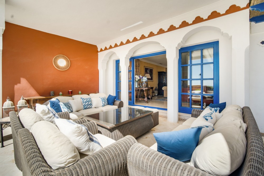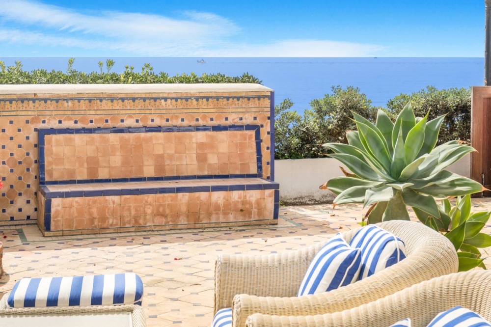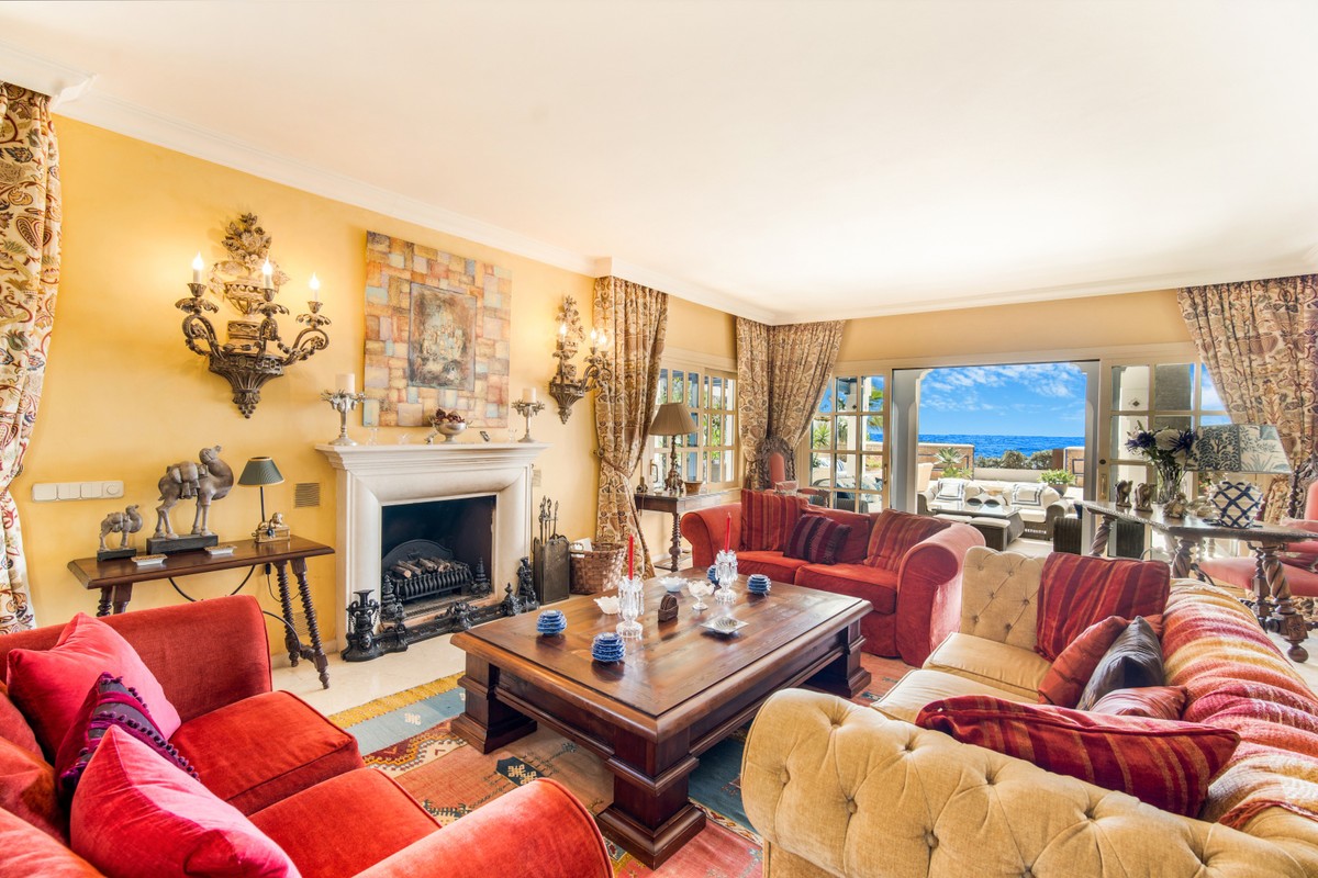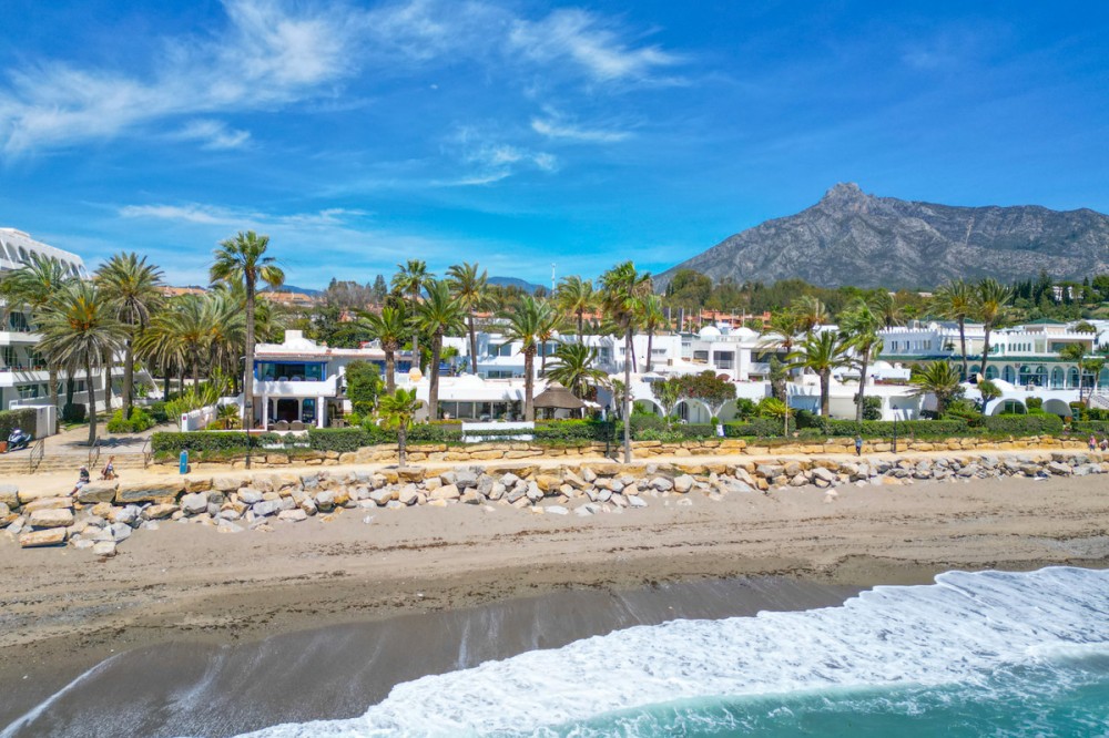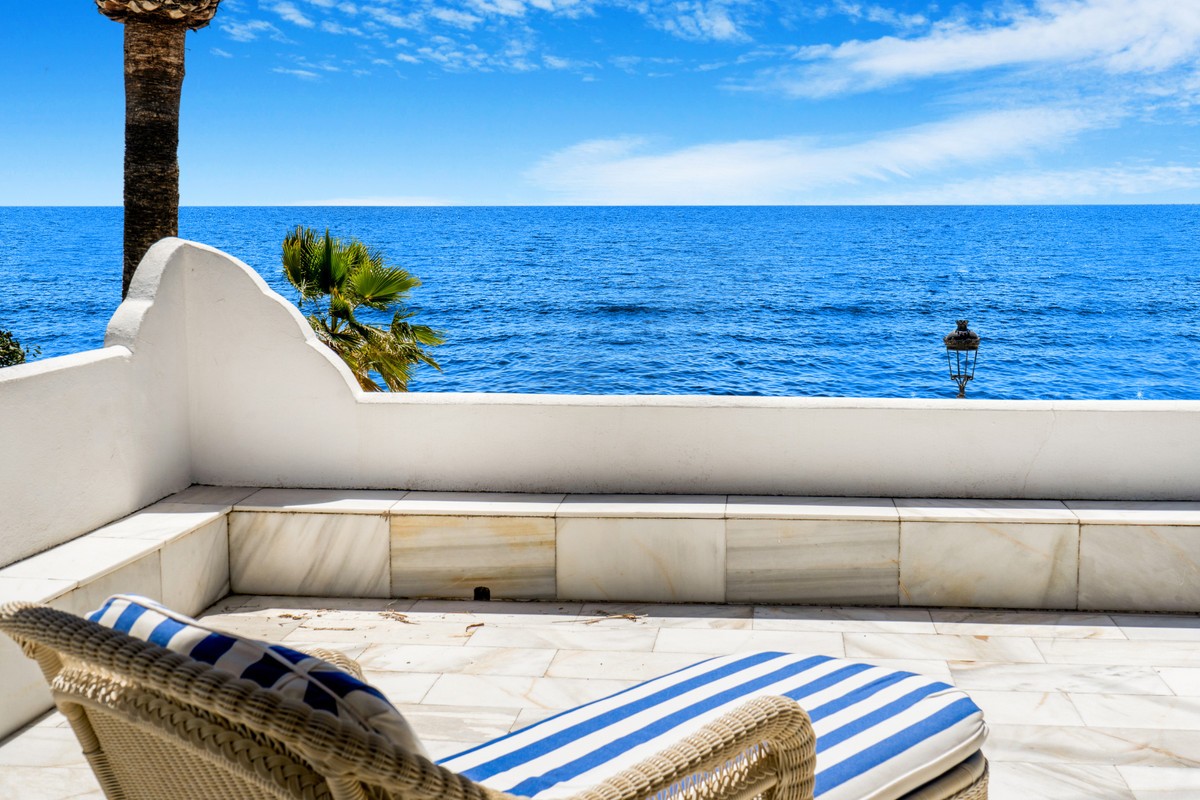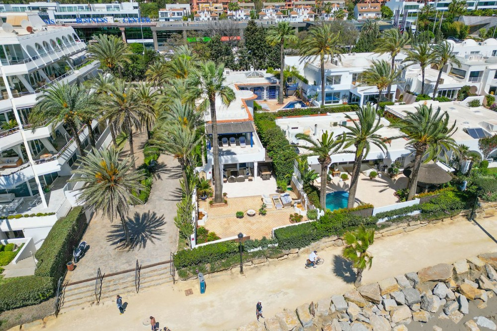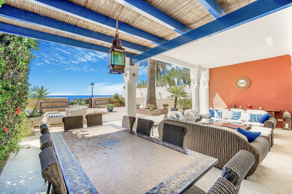 - Nestled in the heart of the Golden Mile, this exquisite Moorish-style 5 bedroom villa is one of only a few houses that can truly claim to be frontline beach. With direct access straight onto the sand, there is nothing separating you from the shoreline and the breathtaking views of the Mediterranean sea. Located a mere five-minute stroll from the renowned Puente Romano, this gem of a home offers 676 m2 of unique living space with stunning vine covered walkways and patios sheltering chic guest bedrooms all decorated in a classical and elegant traditional style, each with its own entrance and en-suite facilities. The main house offers a lovely spacious blue and white classical kitchen, as well as a generous dining area and lounge from where you can access the first of many patios. From here you can watch the sunset in style from a blend of covered and open relaxation areas for those seeking shade from the summer sun. Alternatively, enjoy the cooler evenings in front of a log fire in the spacious family room with an impressive vaulted ceiling. From here double doors lead you to a charming walled patio, featuring a private pool and lounging area. On the first floor the wide staircase leads you to the spacious master suite and dressing room, boasting captivating views and access to an additional terrace with solarium. One additional bedroom can also be found on the first floor, all maintaining the beautiful English style that permeates throughout the property. This home is a true gem, ideal for families who cherish being near the sea. The property offers a blend of charm, opulence and the luxury of coastal living.