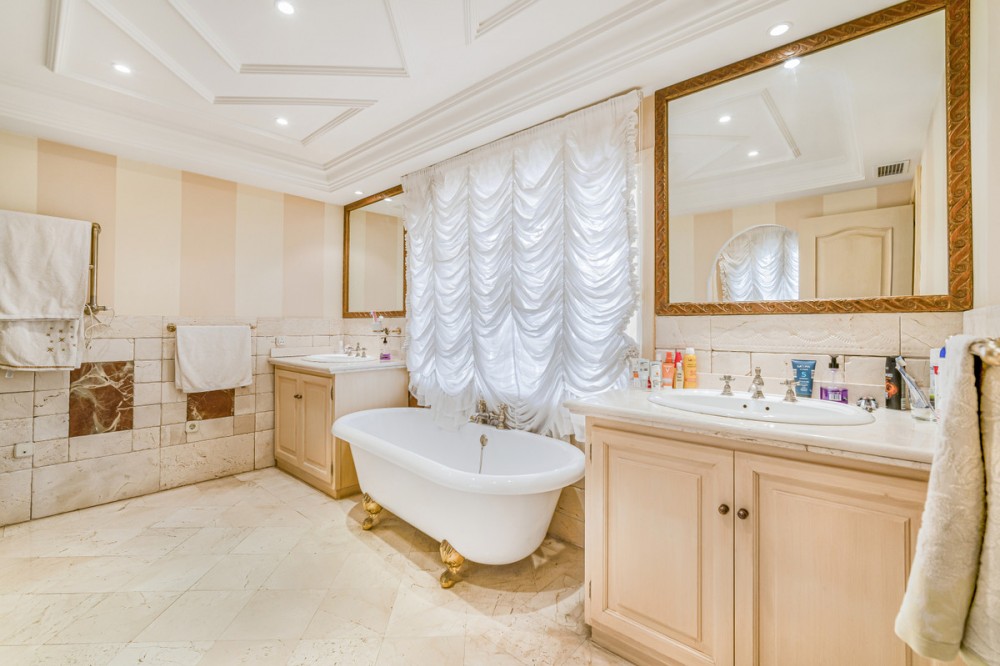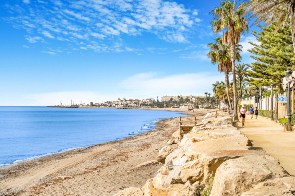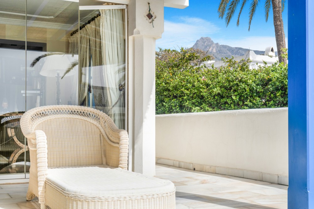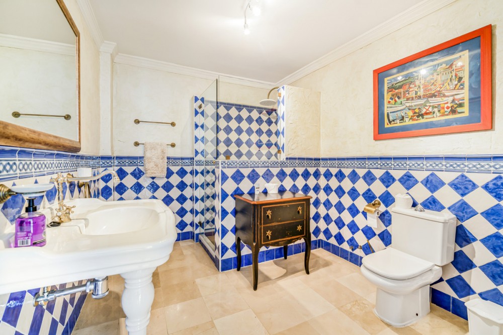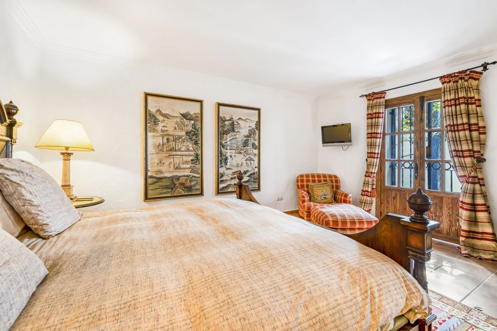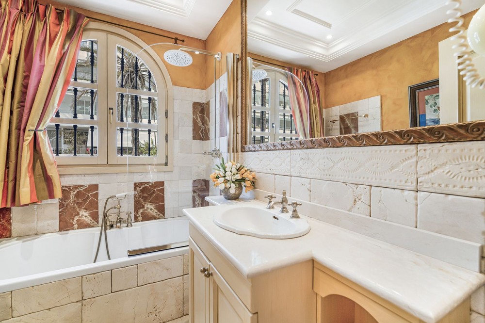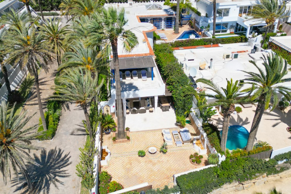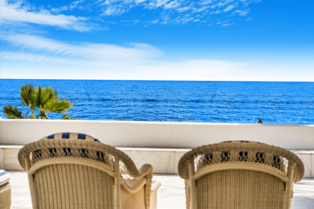 - Nestled in the heart of the Golden Mile, this exquisite Moorish-style 5 bedroom villa is one of only a few houses that can truly claim to be frontline beach. With direct access straight onto the sand, there is nothing separating you from the shoreline and the breathtaking views of the Mediterranean sea. Located a mere five-minute stroll from the renowned Puente Romano, this gem of a home offers 676 m2 of unique living space with stunning vine covered walkways and patios sheltering chic guest bedrooms all decorated in a classical and elegant traditional style, each with its own entrance and en-suite facilities. The main house offers a lovely spacious blue and white classical kitchen, as well as a generous dining area and lounge from where you can access the first of many patios. From here you can watch the sunset in style from a blend of covered and open relaxation areas for those seeking shade from the summer sun. Alternatively, enjoy the cooler evenings in front of a log fire in the spacious family room with an impressive vaulted ceiling. From here double doors lead you to a charming walled patio, featuring a private pool and lounging area. On the first floor the wide staircase leads you to the spacious master suite and dressing room, boasting captivating views and access to an additional terrace with solarium. One additional bedroom can also be found on the first floor, all maintaining the beautiful English style that permeates throughout the property. This home is a true gem, ideal for families who cherish being near the sea. The property offers a blend of charm, opulence and the luxury of coastal living.