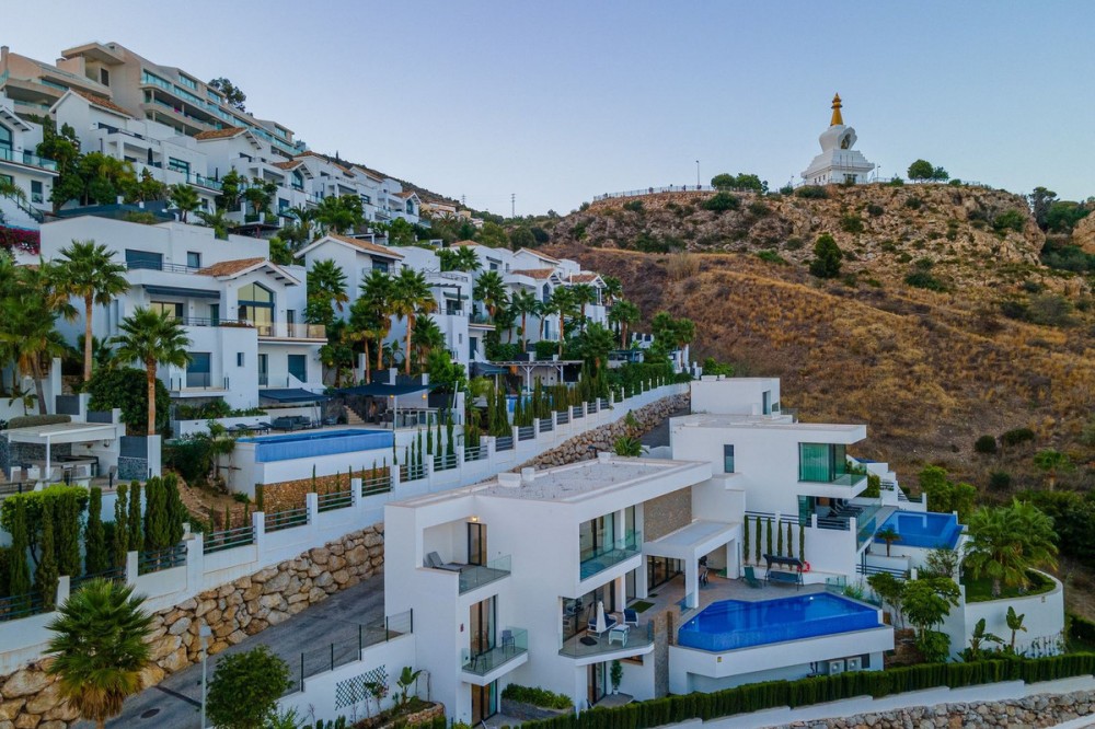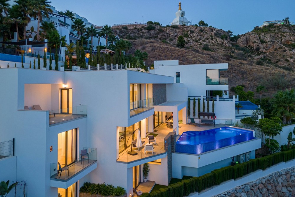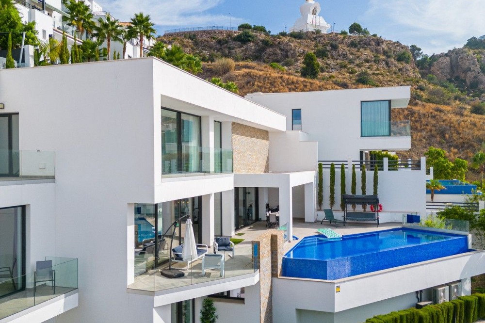 - Concept from the idea comfort of living this villa has it all bright and open spaces with amazing sea views from all living spaces . Cutting edge architecture and luxurious open spaces with fantastic sea view !! MUST SEE !! BUILD BY A DANISH DEVELOPER with proper danish quality!! Best location just outside of Benalmadena Pueblo with absolutely amazing sea views overlooking the cost line. Magical villa not just during the day but also at night time with the glazing coloured lights from the city of fuengirola and surrounding areas . The villa is south / south west facing and offers amazing terrace and garden with private pool with plenty of space for socializing with friends and family !!! The spacious villa is equipped with 4 bedrooms, 5 bathrooms, a fully equipped kitchen and a garage for 2 cars.