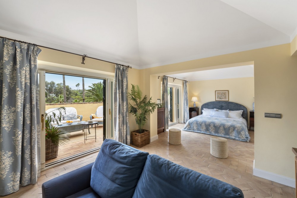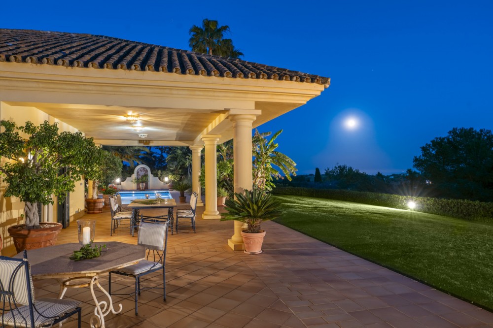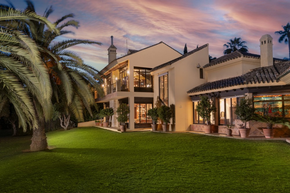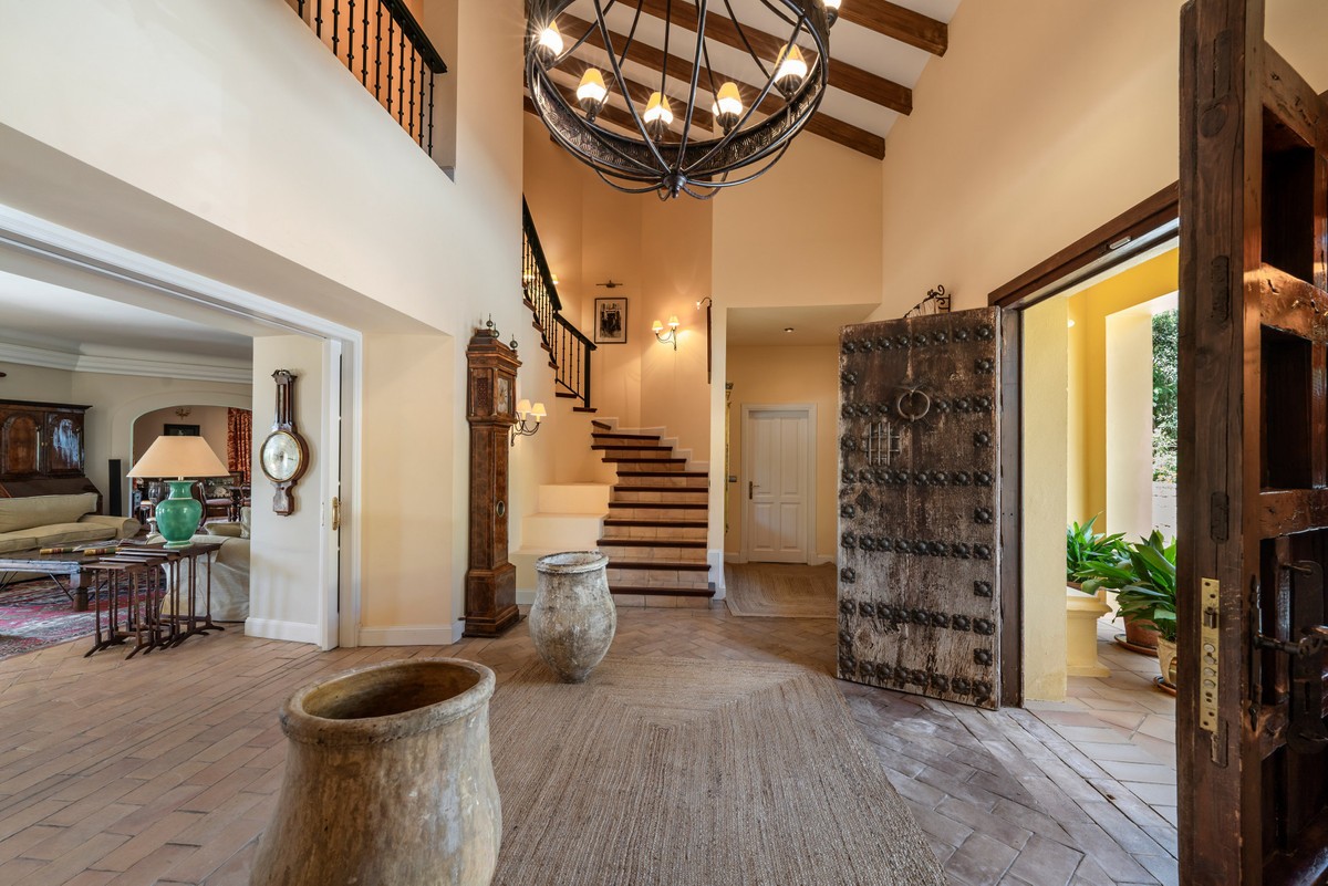 - Discover this property "Casa Serena" located in the exclusive enclave of Sotogrande, strategically located, a few meters from the prestigious golf course of Valderrama, close to the International College , to Hotel SO/Sotogrande, to the Beach Club of the Reserve , to 10minutos Del Real Club de Golf , Trocadero and the beach . With an extension of more than 8,000m2 of land, with panoramic views of the Mediterranean Sea and the golf courses of Almenara and San Roque Club. The property has access by a main avenue and another by a more private street, the latter with a path of adoquines, designed to facilitate both the road and pedestrian access, comfort would be a characteristic to stand out in the day to day, having the ease of being able to circulate through the large facade, with independent entrance and exit. After accessing a double height hall, it serves as a vertebral axis as it separates the common areas, the rest areas and the ground floor from the first. The house develops almost all on one floor which contributes to its comfort and also has three bedrooms on the upper floor, with spectacular views, which together with the other two existing ones would add a total of five. - On the ground floor we find the main living room in two rooms, one of them with fireplace, on the right, the inner dining room for fourteen diners, outdoor dining room, bar area, all connected by wide arches that make the spaces flow and at the same time remain differentiated, all with exit to the outside. - We will continue through the kitchen that has a central island, an informal dining room, which communicates with the outside dining room, designed both for daily functionality and for informal entertainment, annexed pantry area, laundry area, exterior patio and following a wide corridor, we connect with a Recreo Pavilion. **Spaces of Entertainment and Relaxation** In the Recreo Pavilion, we would highlight the large pool room, bar area and home cinema. With an independent wine cellar with temperature regulator. On the upper floor, the magnificent library, with unmatched views of the garden. ideal for social events and meetings. ** Ground floor** The two bedrooms all with en-suite bathrooms and benefit from direct access to the private gardens and porches, offering a personal oasis within the villa. **First Floor:** An elegant hallway leads to three additional bedrooms, each with its own en-suite bathroom. Two of these bedrooms have access to private terraces with stunning sea views and golf courses, while the central bedroom offers a living room with access to a large terrace. **Exterior:** The exterior of the Serena House is equally impressive. A pool hall with covered porch includes a lounge-gym, wardrobes, bathroom and sauna. **Jardines:** The exquisitely cared garden has a variety of palm trees, algarrobos, olive trees, jacarandas and fruit trees such as apples, chirimoyas, quinces, lemons, figs and grapefruits. Each corner of the garden is designed to offer tranquility and natural beauty. **Technology and Modern Comforts** Serena House is equipped with the latest technologies and amenities to ensure a luxurious lifestyle: - Air conditioning in three bedrooms. - Gasoil radiator heating and hot water also fed by diesel. - Gas tanks for comfort. - Domotic system in the games room and library. - Bodega with temperature and humidity regulator Zanotti. - 6000 litre diesel tank and gas tank buried for uninterrupted supply. **Additional details** - Constructed area: 1,230 m2 - Interior: 1.021 m2 - Terraces: 209 m2 - Plot: 8,050 m2 - 5 bedrooms and 8 bathrooms, all with en suite bathrooms and heating. **The Life of Your Dreams in Sotogrande** "Serena House" is not just a house, it's a life experience. Perfect for those looking for the ideal combination of luxury, comfort and exclusivity. Every detail has been designed to offer a full and sophisticated life. Do not miss the opportunity to make this jewel yours in the heart of Sotogrande. For more information or to schedule a visit, please contact us.