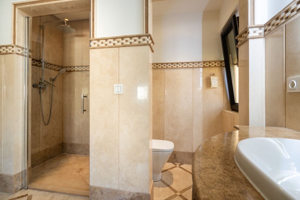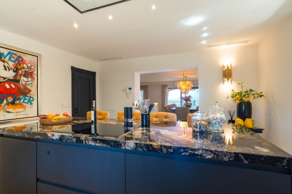 - LUXURIOUS VILLA WITH SEA VIEWS AND TOP FACILITIES WITHIN WALKING DISTANCE OF LA CALA DE MIJAS Discover this fully renovated 5 bedroom, 5 bathroom villa, just a ten-minute walk from the bustling centre of La Cala de Mijas. The villa was built in 2008 and in the last 2 years everything has been completely renovated, with the atmosphere and original character still coming to the fore. This, together with the high-quality finishes, makes this a villa full of comfort that offers everything you could wish for. Enter the villa through an impressive wooden door and walk through the front garden with fountain to the main entrance. The spacious hall with chandelier and high ceiling immediately offers a breathtaking view of the sea. The bright living room, with partly open kitchen with luxury Siemens appliances and cooking island, has a full-length terrace for optimal light and sea views. Also on the ground floor is a separate toilet and a spacious bedroom with walk-in dressing room and en suite bathroom. There is an elevator for easy access to all floors, but of course you can also reach both the basement and the upper floor via the stairs. On the upper floor there are 2 spacious bedrooms, both with a bathroom en suite. Again, there is a beautiful sea view and both bedrooms give access to a large roof terrace. There is also a separate office space on this floor. The basement should certainly not be forgotten and we will explain to you why! The basement is a versatile space with a bar, an indoor swimming pool, a gym, a studio with bathroom, kitchen and private entrance, an office space, a laundry room, bathroom, storage room and a garage with space for 3 cars. In this bar you have your own party location at home! The bar is equipped with a professional beer tap, refrigerators, stained glass windows and a billiards table. Next to this room is the heated indoor swimming pool which is equipped with showers and toilet. The indoor pool has an automatic dehumidifier. In the water installation there is a water descaler for the complete supply of all the water in all rooms. Both the basement and the ground floor give access to the garden of 375m2. This has also recently been redesigned, including fruit trees and a sprinkler system. The beautiful salt water swimming pool, with separate shower, has also been completely re-tiled and in the evening the lighting in both the pool and the fountain creates a beautiful atmosphere. We are talking about a villa that has been completely renovated: • New kitchen and 5 new bathrooms • Completely renewed water pipes and electrical installations • The garden has been redesigned • A total of 7 new plastic sliding doors have been installed • The villa has been completely replastered and painted, inside and out • New electric awnings and underfloor heating throughout the villa Finally; There are electric shutters throughout for extra comfort and the villa also has an advanced alarm and camera system for optimal security. Experience ultimate comfort and luxury in this unique villa. Make an appointment for a viewing today!