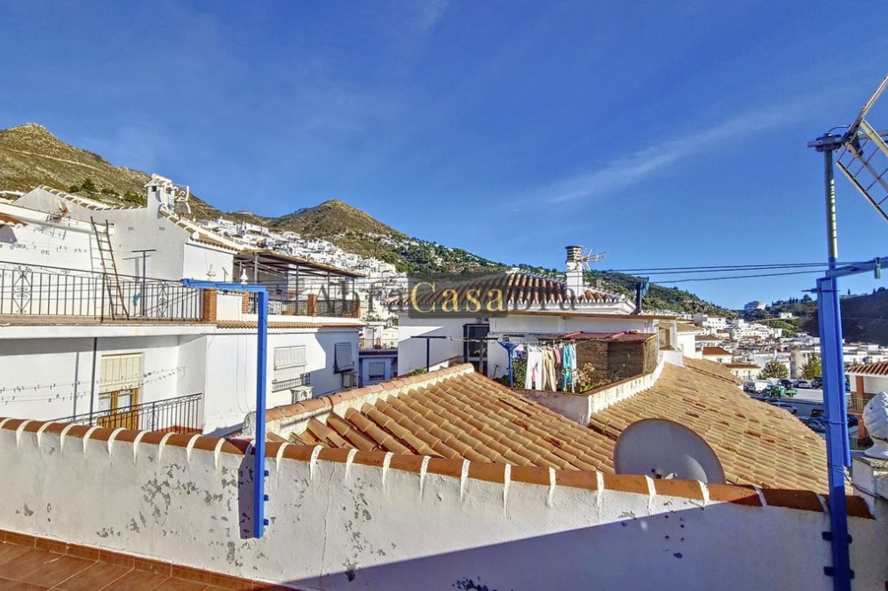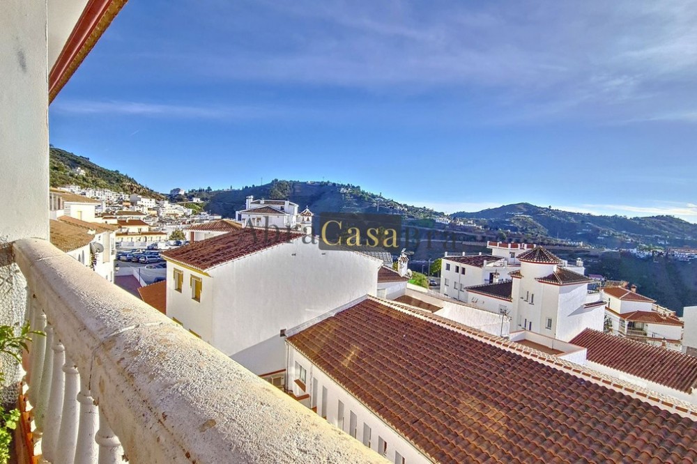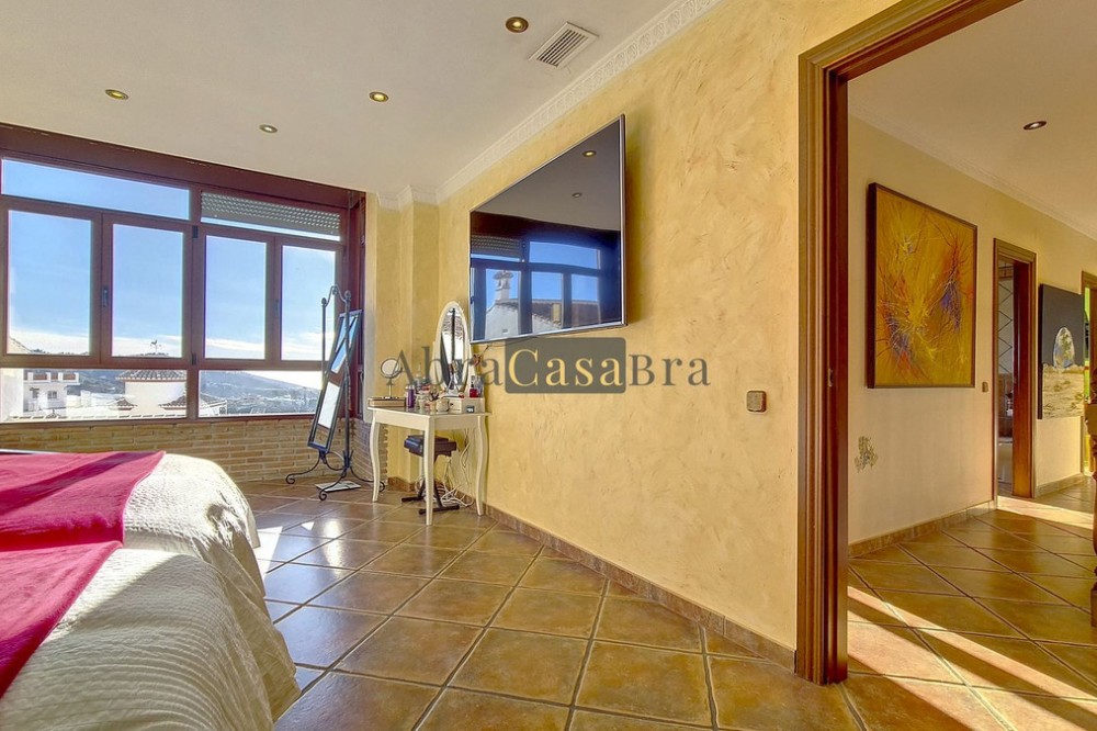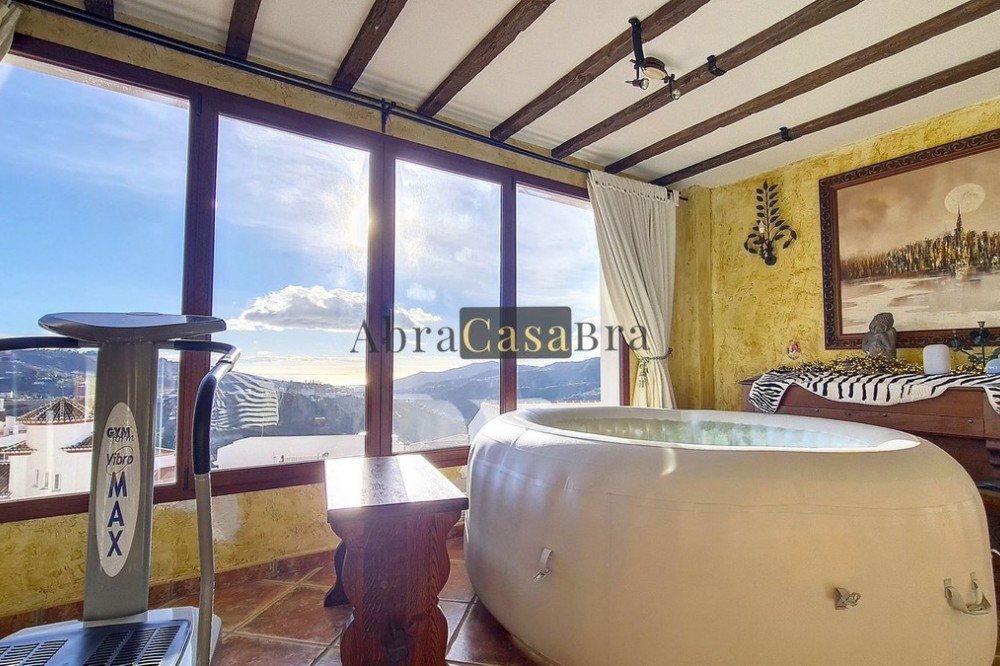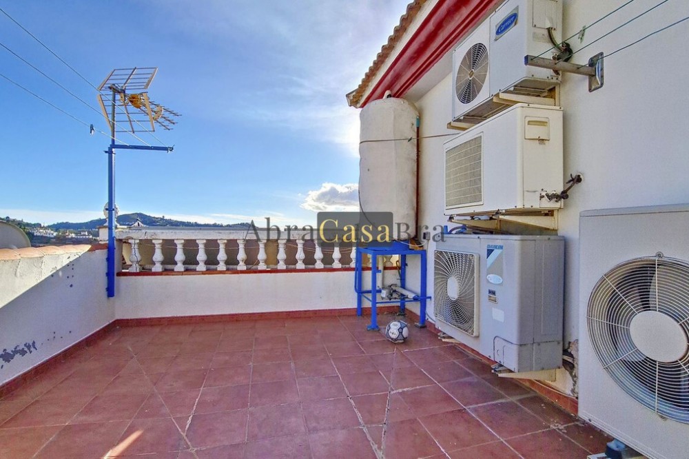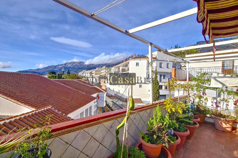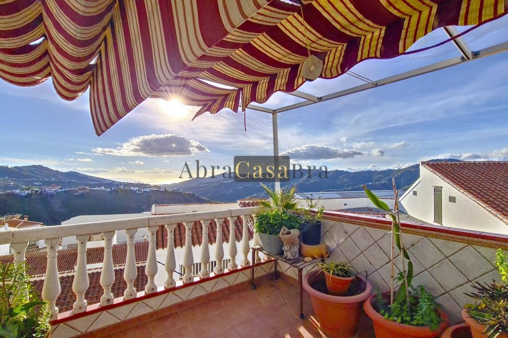 - This amazing townhouse is located in an ideal and quiet location in the heart of the lively white mountain village of Cómpeta in the Axarquia region (Málaga province). The layout of this spacious and bright house is uncluttered and offers many possibilities. It is ideal for use as a family home and/or commercial business. At the back of the townhouse is a very large garage for several cars and a storage room. The 2 roof terraces give breathtaking views of the mountains, the sea and the village. On some days, even the Atlas mountains in Morocco can be clearly seen. The property has fibre-optic internet and there is double glazing. The water is heated via solar panels and there is air conditioning throughout the house. The house is in very good condition and luxury materials have been used. The atmosphere is pleasant. The first thing you notice when you enter is the large hall with the beautiful staircase to the first floor and the open passage to the living/dining area. To the left of the hall is a room currently used as storage, but could easily be transformed into an extra bedroom. The living/dining room with open kitchen is bright and spacious. The modern and spacious kitchen is fully equipped. At the end of the hall is a bathroom with toilet and a room currently used as an office. This area has its own entrance through a glass front. Behind this office is a separate room, currently used as a laundry room, and a balcony. Once you reach the 1st floor, a spacious hall connects the 3 large bedrooms, the large bathroom with bath and a walk-in closet with another separate storage room behind it. The beautiful master bedroom with fitted wardrobes is very spacious gives beautiful views over the mountains with the sea in the distance. It has two double beds. On the 2nd floor, there is a small storage room, a large open room with full-length windows, a guest toilet and access to the 2 roof terraces. The open room is currently used as a gym and there is a jacuzzi (cold/hot). The large roof terrace with phenomenal views has awnings and is an ideal place to spend warm summer evenings with a glass of wine, while the sun slowly disappears behind the mountains. Shops, terraces, schools, public transport.... everything is within walking distance. Make an appointment soon, I will proudly give you a tour of this townhouse, which you must have seen with your own eyes.