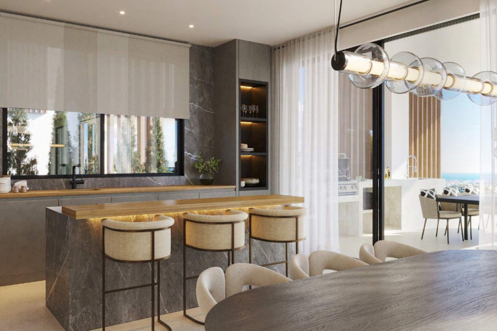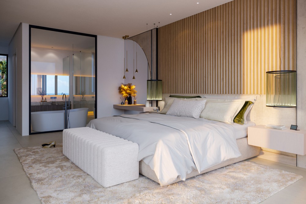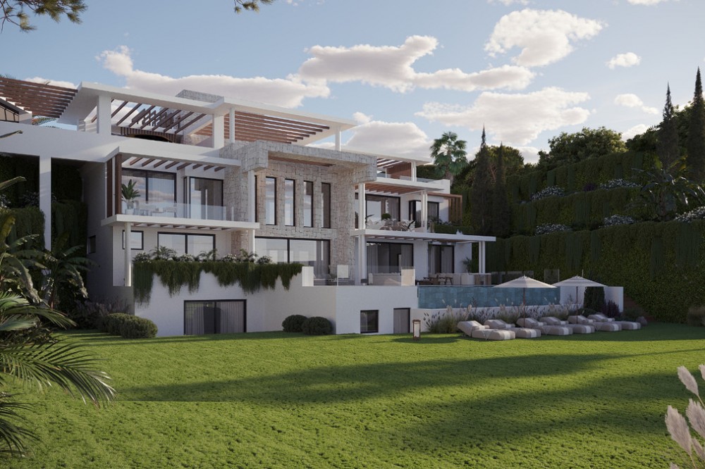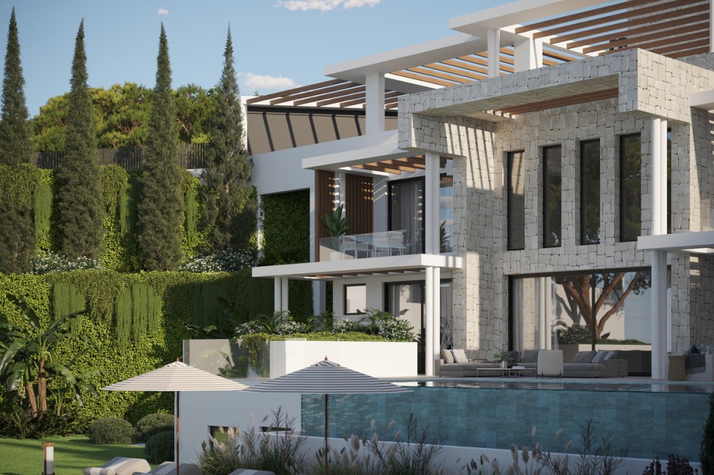 - New Development: Prices from €2,900,000 to €5,100,000. [Bedrooms: 3 - 4] [Bathrooms: 3 - 4] [Built size: 508m2 - 924m2]. An exclusive gated community of just 12 detached villas, masterfully designed by renowned architect Pablo Villarroel, whose 50-year career focuses on harmonising architecture with nature. These exceptional 3 to 6-bedroom homes (built areas from 489 m² to 976 m²) offer the highest standards of design, privacy and comfort. Each villa features a striking open-plan layout with a 6-metre-high ceiling in the main living area, creating a bright and airy space with panoramic sea and mountain views. Floor-to-ceiling Technal windows enhance the connection between indoor and outdoor living, while Modulnova kitchens add a touch of Italian sophistication. Located within walking distance of a sandy beach and local amenities, each property includes a large solarium, private lift, landscaped garden, swimming pool and a naturally lit leisure space. All homes come with underfloor heating throughout and generous plot sizes (1,000–2,000 m²) for maximum privacy. Customisation options include extra en-suite bedrooms, a gym, sauna/hammam or a cinema/games room. These villas are the ideal blend of contemporary luxury and Mediterranean serenity, designed for those who value space, elegance, and an exceptional lifestyle.