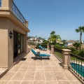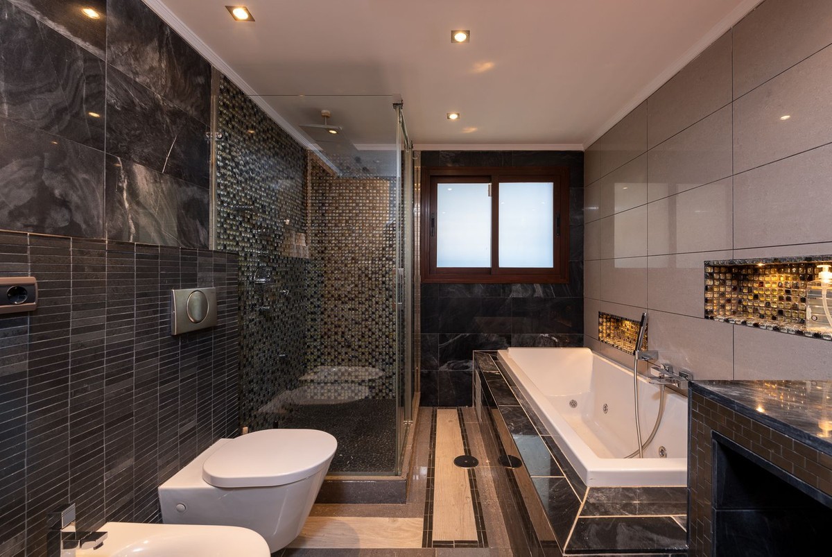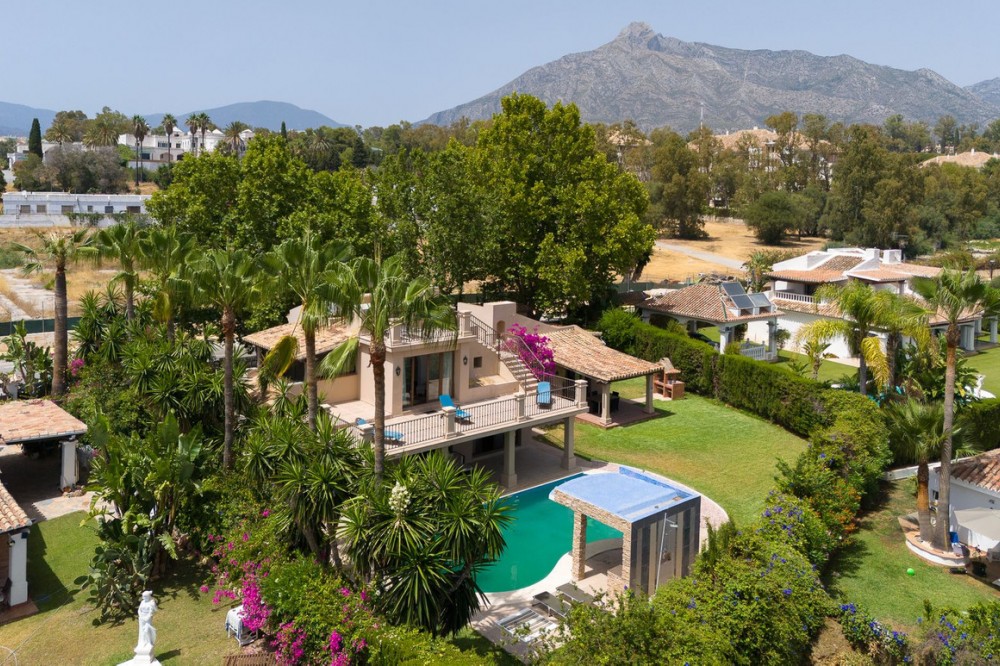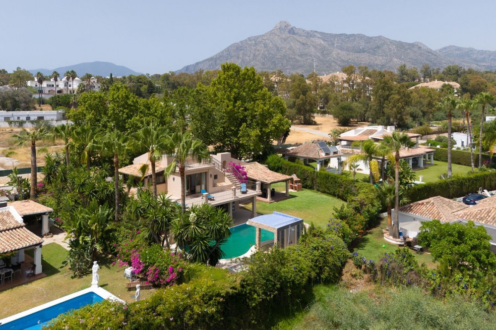 - This private villa, situated in the heart of the prestigious Golden Mile, offers a rare combination of luxury and convenience. Surrounded by some of the most exclusive urbanizations, this residence is just a few minutes' walk from the beach, upscale amenities, boutique stores, gourmet restaurants, and the iconic Puente Romano Hotel. As you enter the villa, you're greeted by a welcoming entrance hall that seamlessly flows into a spacious living room. Adjacent is a fully equipped Bulthaup kitchen with state-of-the-art Gaggenau appliances, perfect for culinary enthusiasts. Both the living room and kitchen have direct access to a charming terrace and a beautifully landscaped garden with a pool, creating an idyllic space for relaxation and entertaining. The first floor also includes a guest toilet, a well-appointed bedroom with an en-suite bathroom and dressing room, and the master suite. The master bedroom is a sanctuary, featuring a cozy fireplace, an en-suite bathroom, a large dressing room, and floor-to-ceiling windows that open onto the terrace and garden, filling the space with natural light. The upper floor is dedicated to another luxurious master bedroom, complete with an en-suite bathroom, an expansive dressing room, and access to a private terrace with stunning sea views. From this terrace, you can ascend to the solarium, where panoramic views of the Mediterranean create the perfect backdrop for enjoying the serene surroundings. There is a possibility of extending by 80m2. The plot is exceptionally private, offering unmatched tranquility despite its central location. This unique property is not only ideal for a family home but also presents significant investment potential, thanks to its high profitability in holiday rentals. Moreover, there is an opportunity to expand the villa by approximately 80 m², as the buildability of the plot has not yet been fully utilized. The villa's location is truly unbeatable, especially as the area is undergoing significant revaluation. The development of four luxury projects nearby, along with recent infrastructure improvements such as new roads, a children's park, a pedestrian area along the river, and a large parking facility, make this property an exceptional investment in a rapidly appreciating neighborhood.