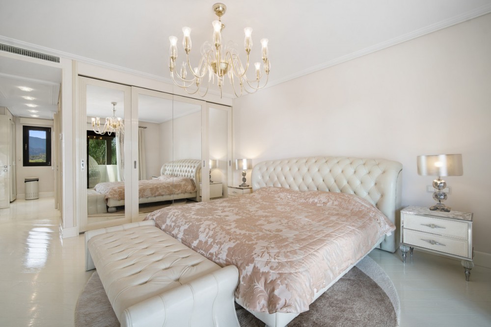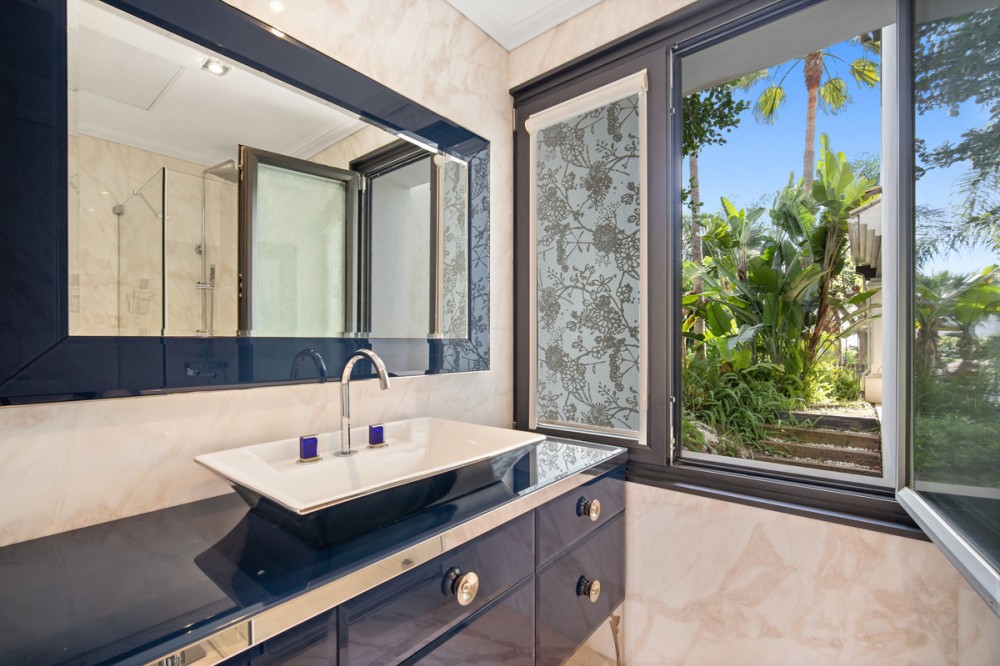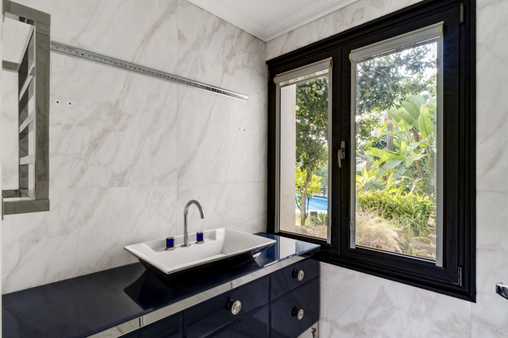 - Renovation Opportunity - six-bedroom south west facing villa, located in Lomas de Magna Marbella, one of the most prestigious complexes on Marbella's Golden Mile. The villa is the perfect renovation project and is situated within a gated community that offers 24-hour security service, two large communal pools, and lush tropical gardens of incredible beauty. It is conveniently located close to all amenities, including supermarkets, shops, restaurants, schools, and golf courses, and is only a five-minute drive from the sea. This incredible property spans three floors. The main floor features an entrance hall, a spacious living room with direct access to a semi-covered terrace that includes tropical gardens with dining spaces and a chill-out area, as well as a private exit to the communal pool. There is also a bright bedroom with an en-suite bathroom, a well-proportioned kitchen, and a guest toilet on this floor. The upper floor has three bedrooms, each with an en-suite bathroom, and a sunny terrace with partial sea views. The basement comprises two additional bedrooms with bathrooms, a games room, a laundry room, a sauna, a hammam, and a garage with enough space for four cars. The house also has its own elevator. Please note that the villa is in need of some renovations and is offered unfurnished, allowing you the opportunity to update and personalize it to your taste. The materials used in its construction and interior decoration are of the highest quality, reflecting the luxury of this property.