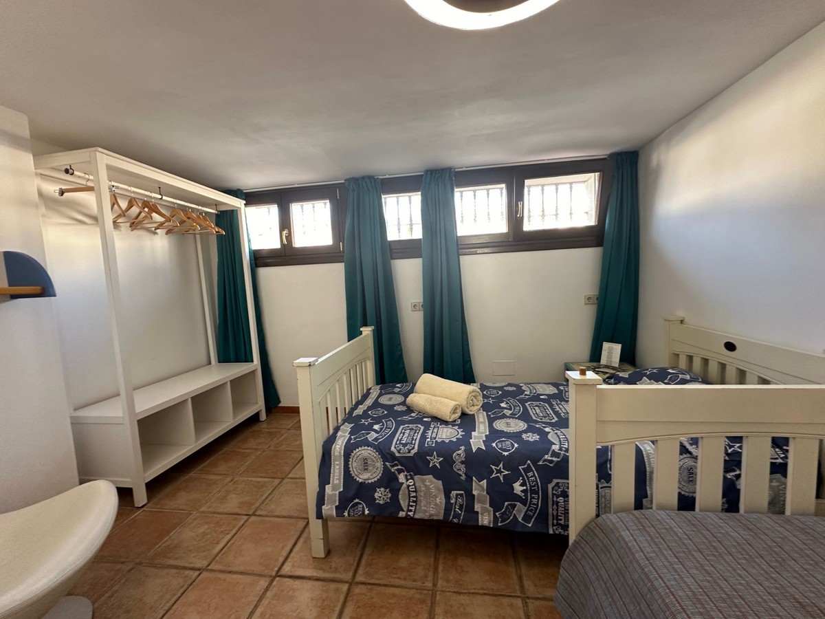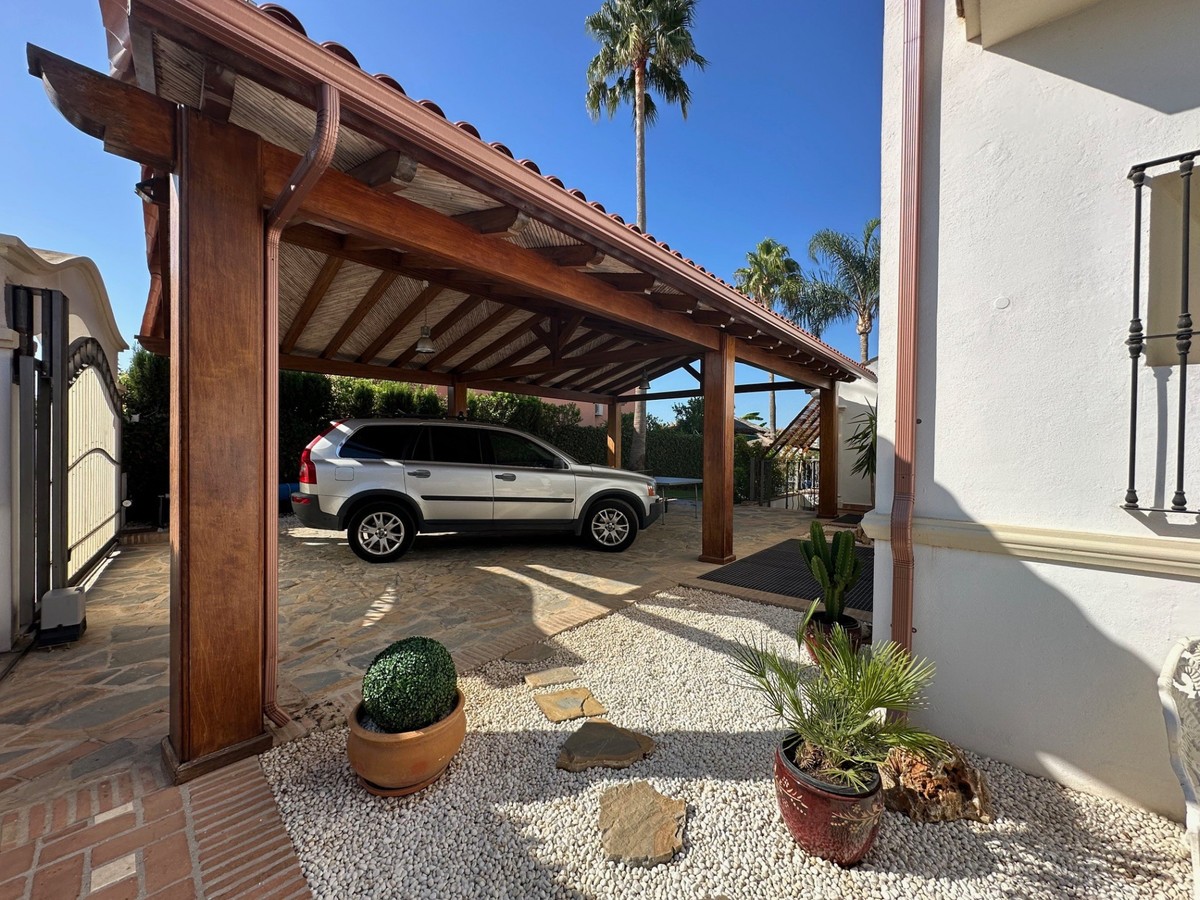 - Beautiful rustic, solidly built house on the sea side of San Pedro de Alcantara. The house consists of an entrance area with an open modern kitchen, living-dining room with exit to a raised terrace with a beautiful view of the greenery. In this entrance area there is a bedroom with bathroom, one suite. In the upper part there are 3 further bedrooms with 2 bathrooms. On the ground floor there are 2 further bedrooms and 1 bathroom. There is also another living room and a storage room. There are 2 carports, a heated swimming pool and a beautiful, well-kept garden around the house. Due to the west-facing location, the house is very bright and sunny. Ideal family home or for renting all year round. The beach or the center of San Pedro are only a few minutes' walk away.