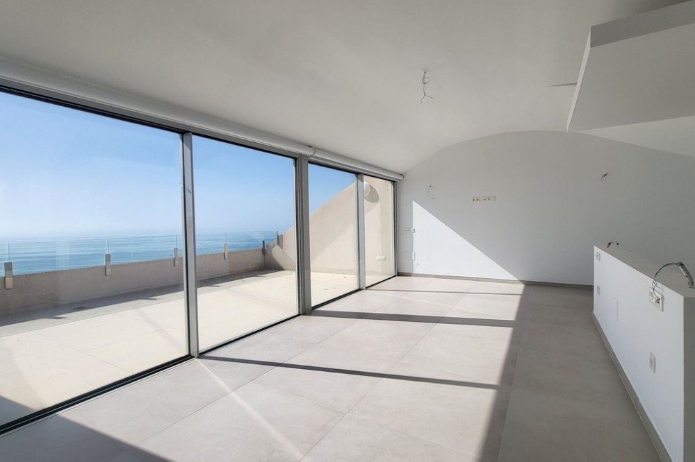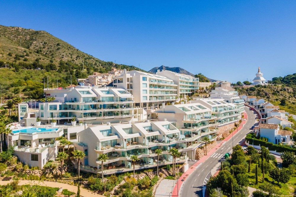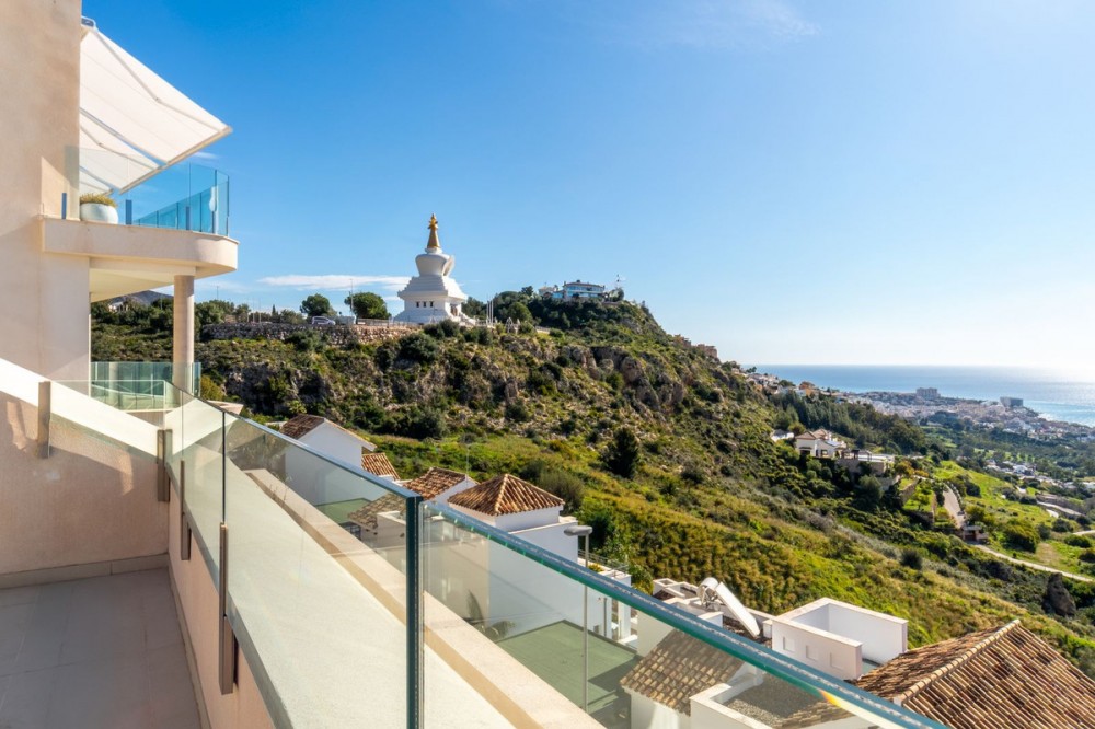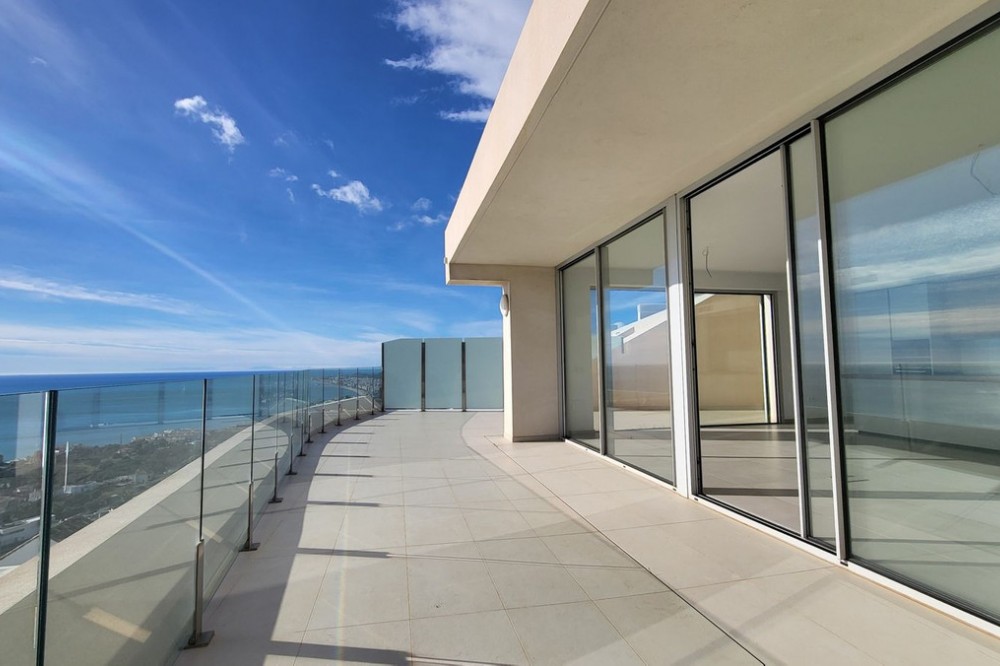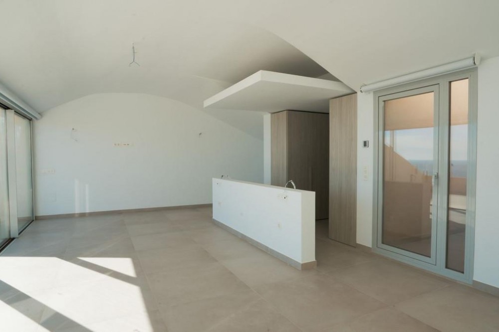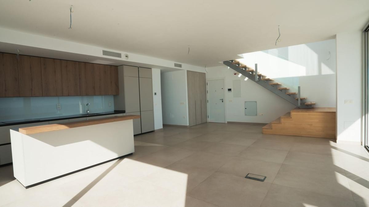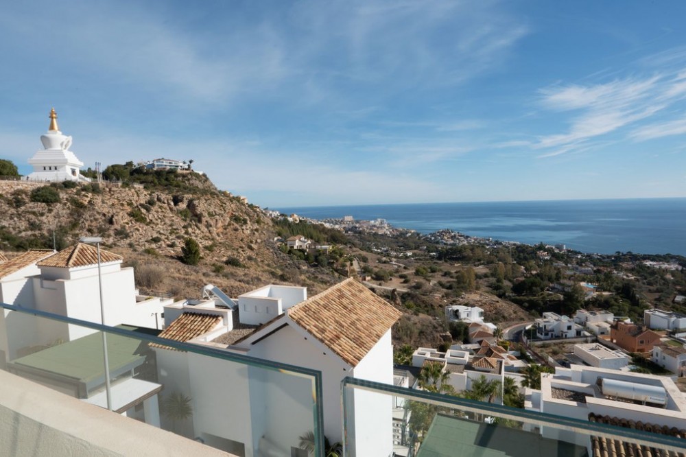 - Brand new south facing penthouse duplex, located in the exclusive urbanization of Stupa Hills. The property consists of hall, 3 bedrooms with built-in wardrobes and electric blinds, bathroom and guest toilet, open plan kitchen fully furnished and equipped with electricial appliances from Siemens. Spacious living-dining room that leads out to a terrace of 65m2 with panoramic sea views, the Fuengirola Bay and of the Buddist Temple. On the top floor is located the main bedroom with walk-in closet, ensuite bathroom and laundry area. The bedroom leads out to a terrace of 21m2 with panoramic sea views. Air conditioning hot and cold with Airzone, video intercom, domotic system, pre-installation alarm system. Includes two parking spaces and one storage room.