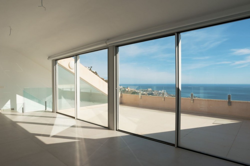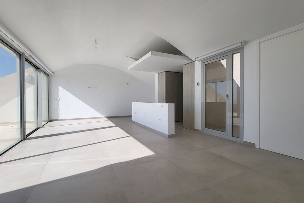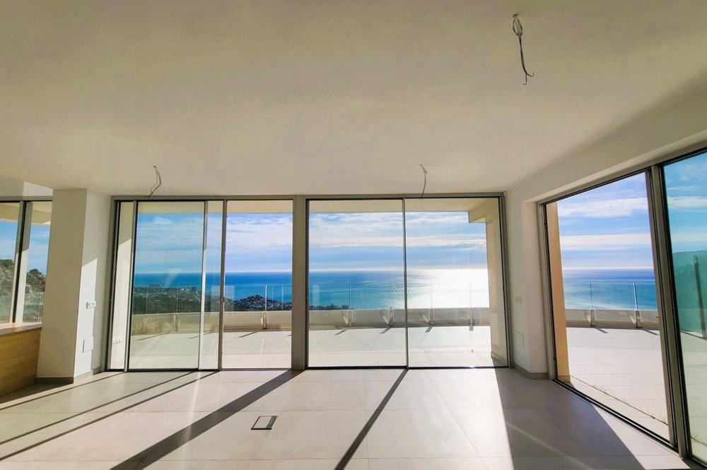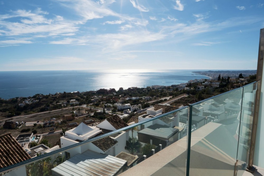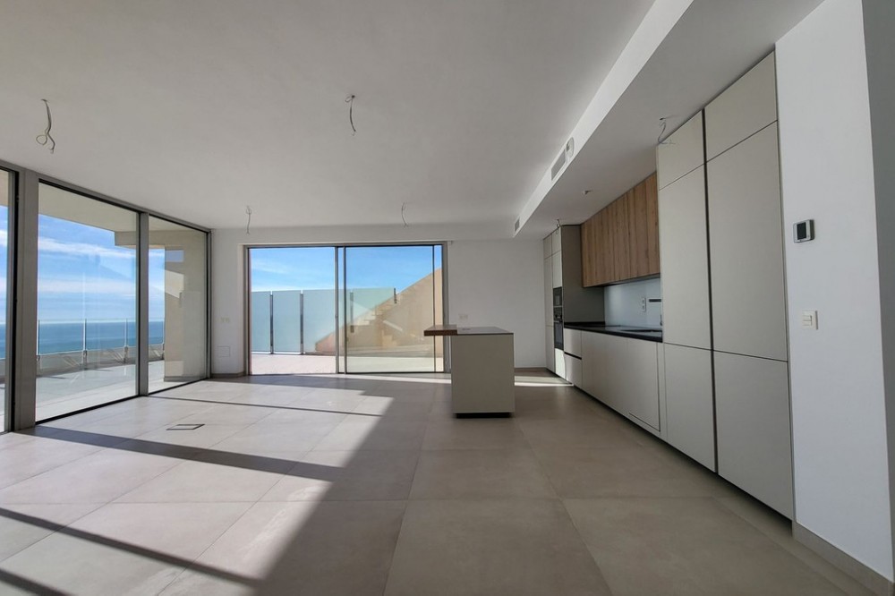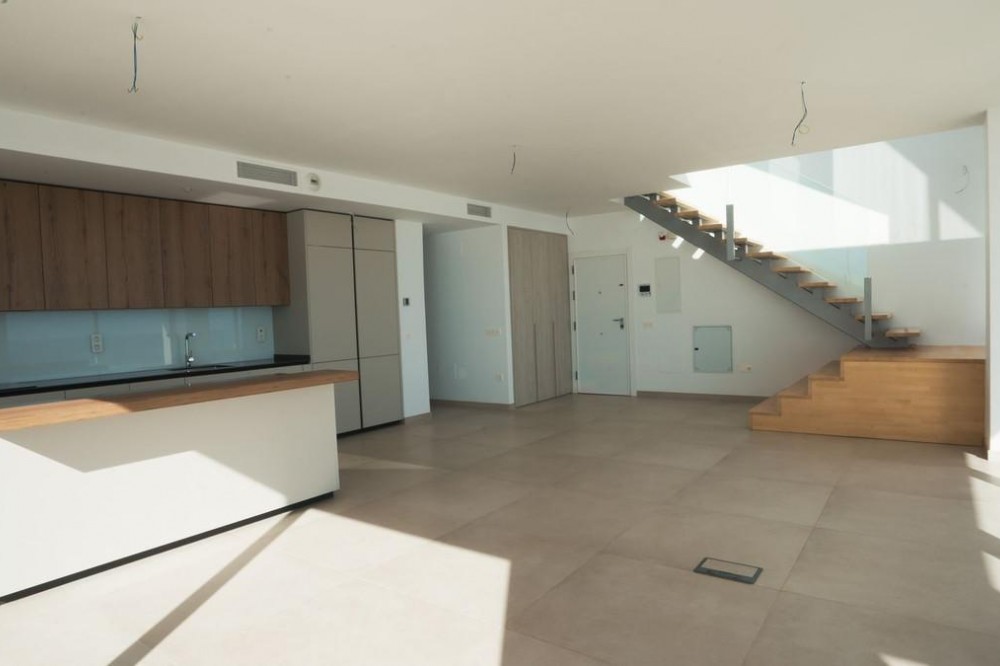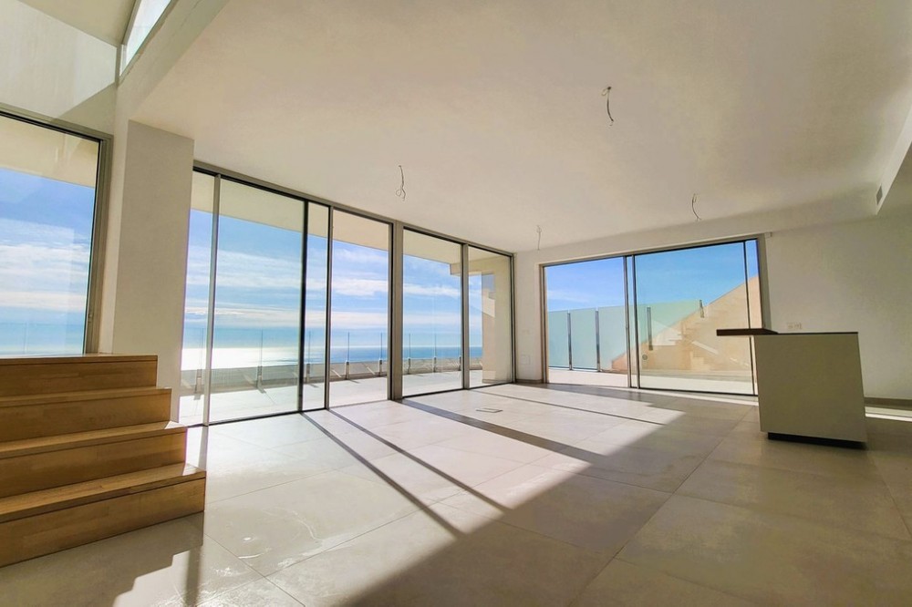 - Brand new south facing penthouse duplex, located in the exclusive urbanization of Stupa Hills. The property consists of hall, 3 bedrooms with built-in wardrobes and electric blinds, bathroom and guest toilet, open plan kitchen fully furnished and equipped with electricial appliances from Siemens. Spacious living-dining room that leads out to a terrace of 65m2 with panoramic sea views, the Fuengirola Bay and of the Buddist Temple. On the top floor is located the main bedroom with walk-in closet, ensuite bathroom and laundry area. The bedroom leads out to a terrace of 21m2 with panoramic sea views. Air conditioning hot and cold with Airzone, video intercom, domotic system, pre-installation alarm system. Includes two parking spaces and one storage room.