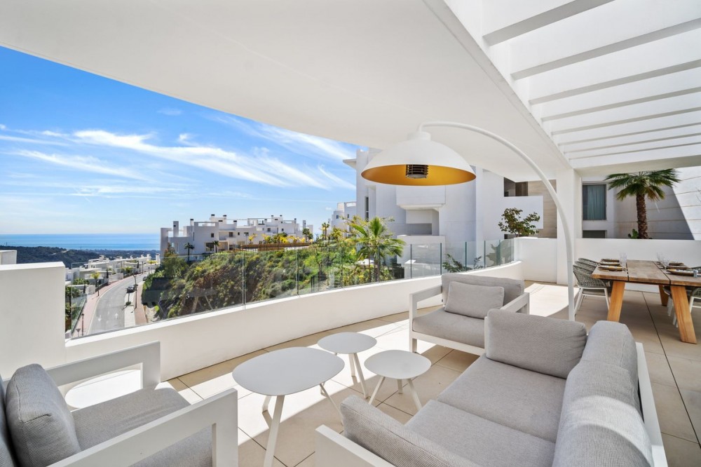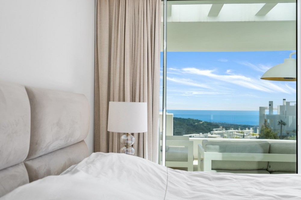 - PALO ALTO, one of the finest projects offering a superior lifestyle with world-class amenities. Las Jacarandas Impressive contemporary flat, with sensational sea and mountain views. Las Jacarandas has two private outdoor pools with children's play areas and gardens. Residents also have full access to all the amenities of Palo Alto including, concierge services, a world-class health club, horse riding, spa and beauty facilities, paddle tennis courts, gym, tennis courts, a social club, a kids club, and endless space to enjoy the natural beauty of Sierra de las Nieves. The flat itself features high quality designer furniture (optional), wooden floors in the bedrooms combined with marble floors in the living area. The large open plan living and dining area with large glass windows to enjoy the views, leads out onto the spacious terrace. The flat has a spacious, bright open plan living/dining room with a beautiful open plan kitchen including top-end appliances, with American fridge integrated microwave and oven, with a separate room off the kitchen with washing machine and tumble dryer leading to the terrace, 3 bedrooms with fitted wardrobes and 2 bathrooms. There is also 24/24 security. The property also has 1 underground parking space. For the best of both worlds, it is only a short drive to La Cañada, a well-known shopping centre behind Marbella with all the shops you can imagine and the centre of Marbella with its amenities, shops, restaurants and bars and the beach.