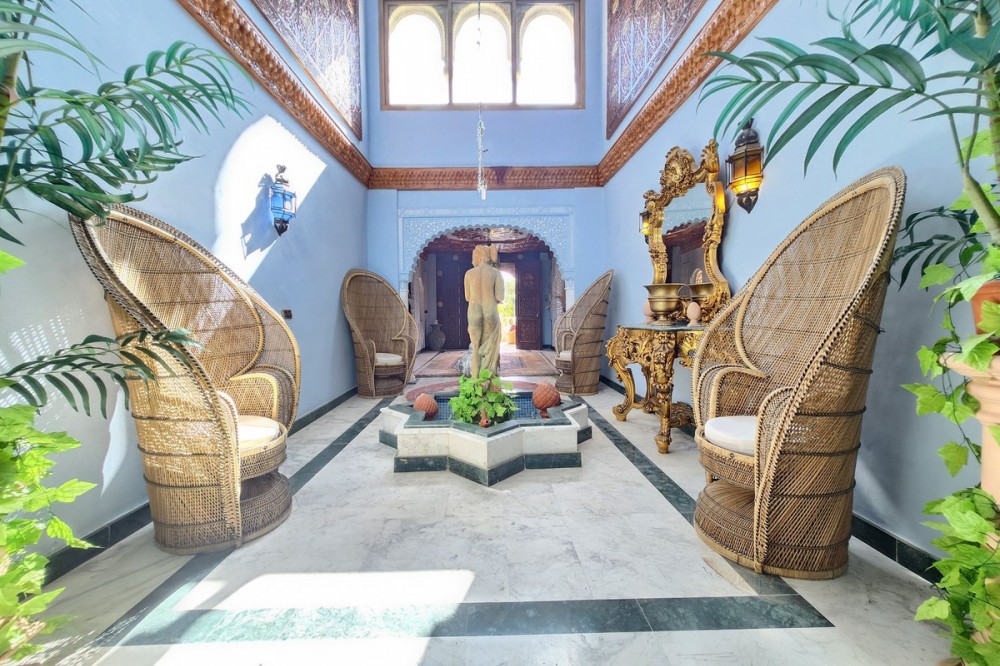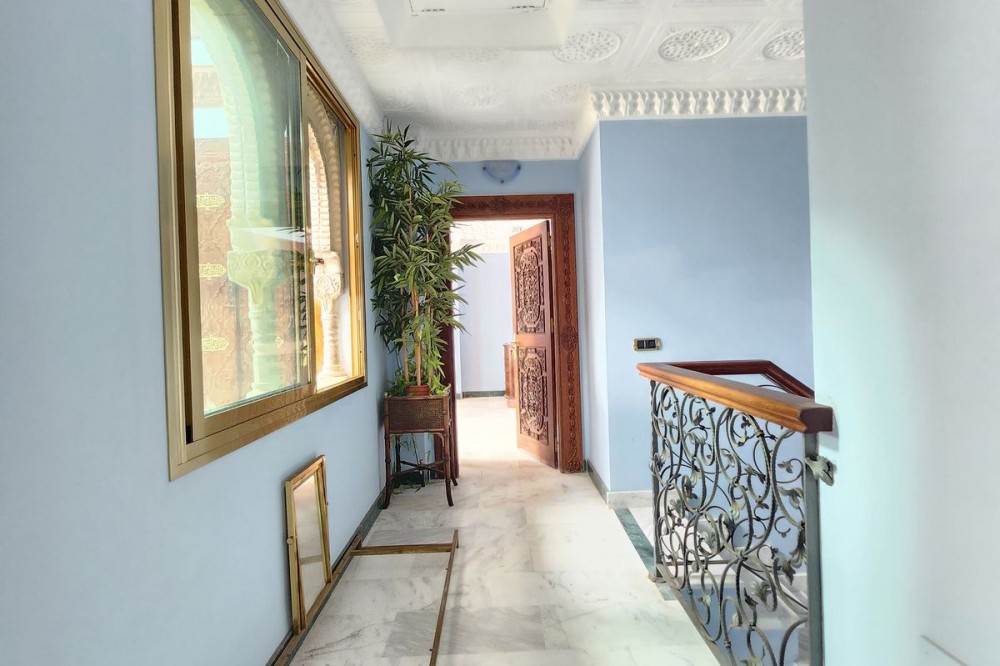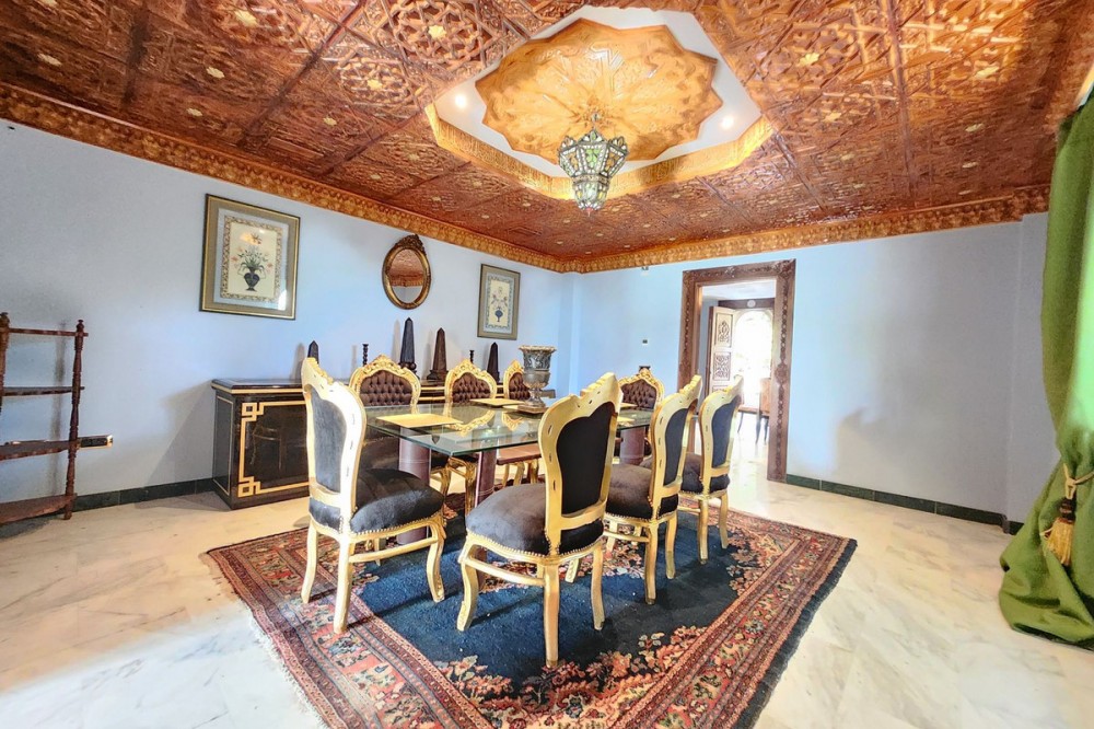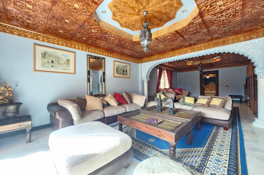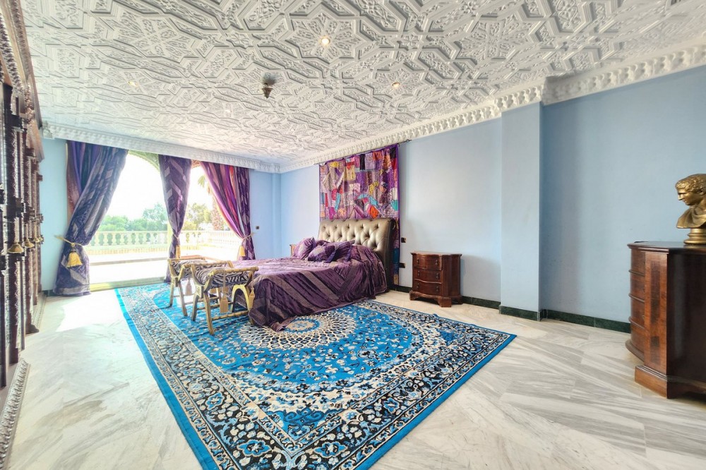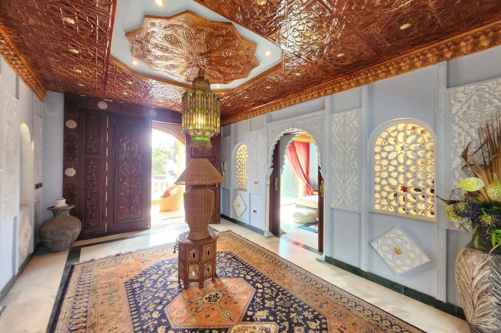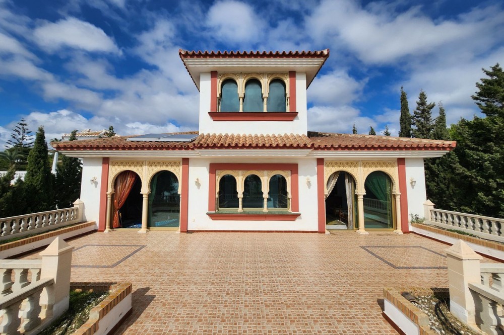 - Stunning Villa in Arabish-Andalusian Palace Style in Cala de Mijas Just 300 meters from the sea, this magnificent villa blends Andalusian Nazarí-modern design, combining luxury and tradition. Its privileged south-facing orientation ensures sunlight throughout the day, illuminating the garden and pool area. The property is accessed through a grand gate and a driveway. The villa is distributed over 3 floors plus a loft, featuring unique architectural details. Upon arrival, a small staircase leads to the pool and the main porch, offering stunning sea views. The entrance is through an impressive double door, hand-carved in mahogany, leading to a majestic 12-meter-high hall with a central patio and a marble fountain, all bathed in natural light coming through the central tower. To the left, a sliding double door opens to a large, bright double living room with sea views and windows overlooking the side garden. The high ceiling is lined with hand-carved mahogany wood, adding an artisanal touch to the space. This floor also includes a bright bedroom with garden views and a marble bathroom, perfectly equipped. On the right side of the hall, another living room with sea views connects to a spacious dining room, which leads to a modern kitchen equipped with high-end appliances and direct access to the rear garden. The upper floor offers three spacious bedrooms, two of them with access to a large terrace with panoramic sea views. The master bedroom features an en-suite bathroom with a jacuzzi and large windows providing abundant natural light. A second full bathroom also includes a jacuzzi and side windows. All carpentry is handcrafted from mahogany, and the windows are double-glazed. The lower floor offers flexible space with four additional bedrooms, perfect for conversion into a cinema room, games room, or even an independent apartment. It also includes a full bathroom and a garage with space for four cars. Located in the exclusive coastal urbanization of **Torrenueva**, this property is in the heart of Mijas' coastal area, just a short distance from the beaches and surrounded by lush forests. This enclave is known for its tranquility, international community, and excellent access to the AP7 motorway and A7 highway, allowing quick access to Málaga airport in 25 minutes, and Marbella or Puerto Banús in less than 15 minutes. Additionally, the nearby Cabopino area offers a charming marina just 10 minutes away. Torrenueva stands out for its excellent range of services, including restaurants, shops, tennis and golf clubs, as well as outdoor activities such as hiking, fishing, and diving. A unique property in an exceptional location, perfect for those seeking luxury, privacy, and proximity to the sea.
