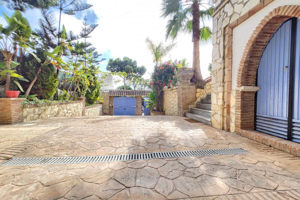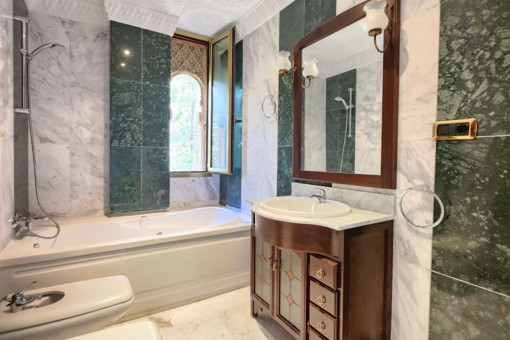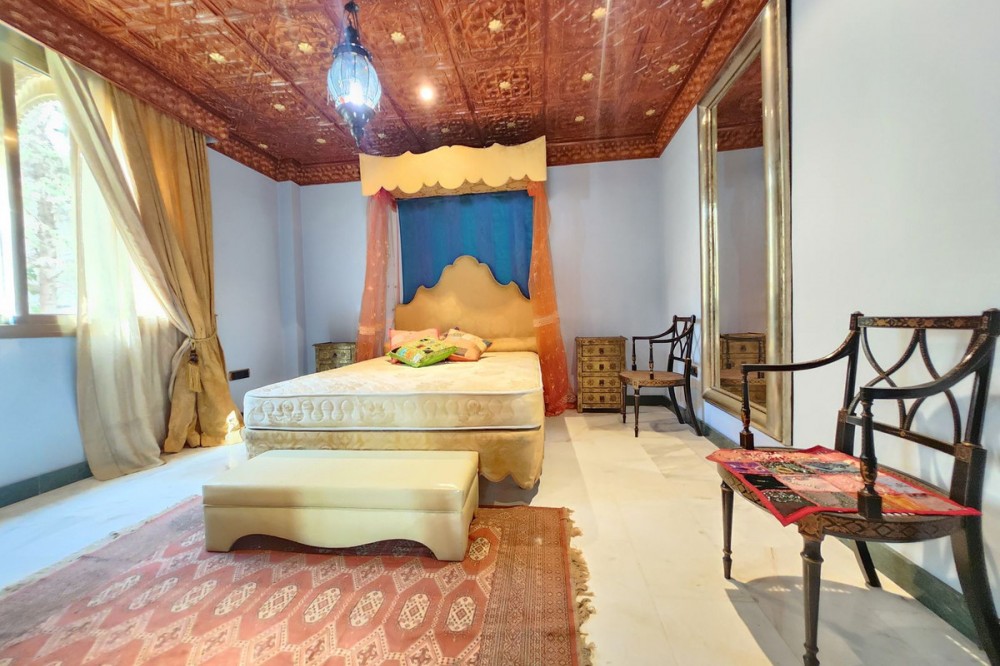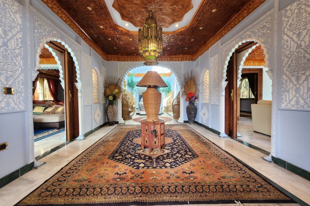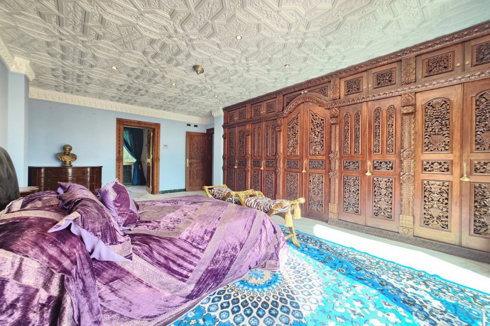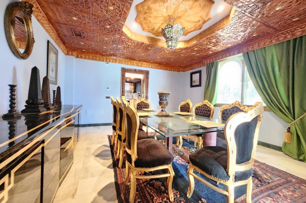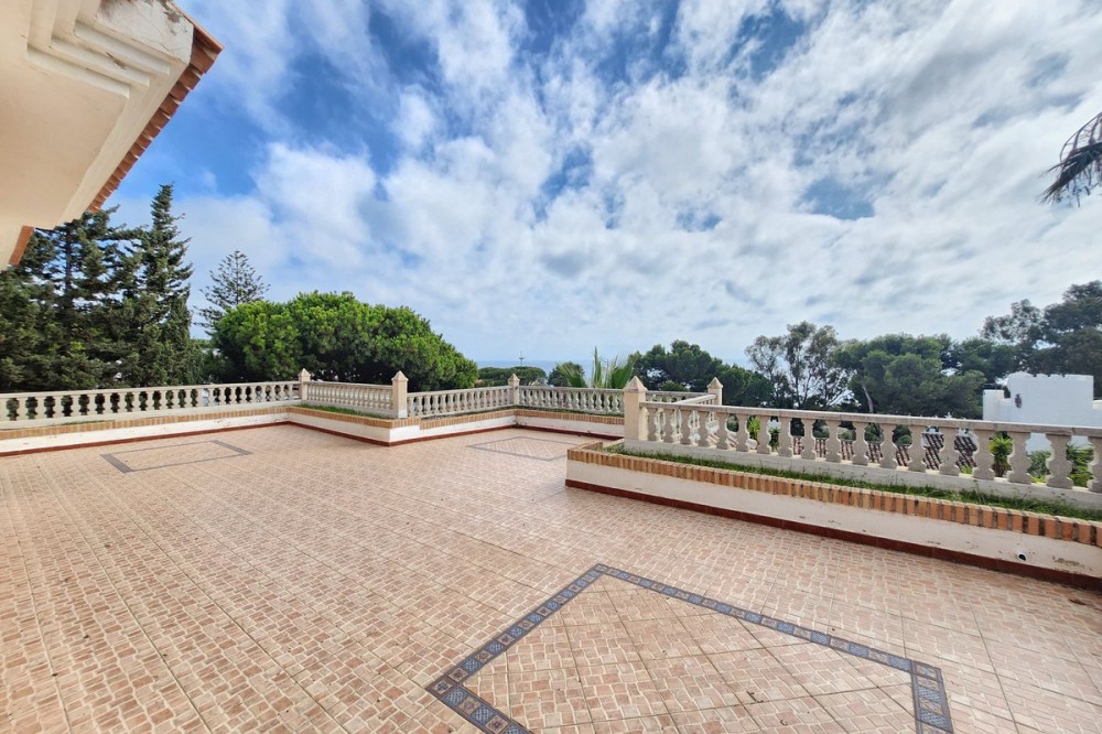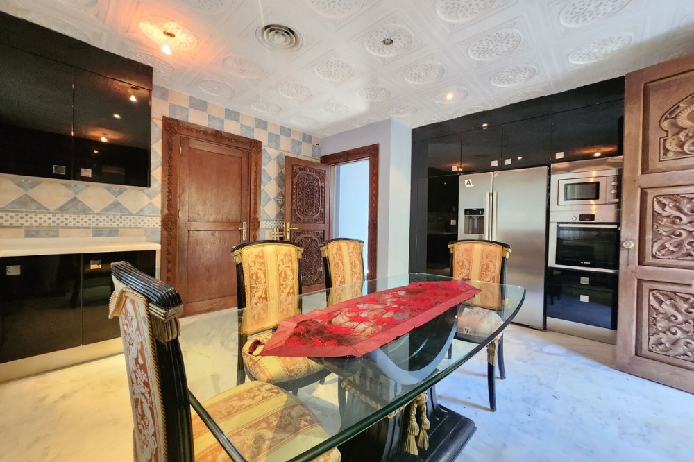 - Stunning Villa in Arabish-Andalusian Palace Style in Cala de Mijas Just 300 meters from the sea, this magnificent villa blends Andalusian Nazarí-modern design, combining luxury and tradition. Its privileged south-facing orientation ensures sunlight throughout the day, illuminating the garden and pool area. The property is accessed through a grand gate and a driveway. The villa is distributed over 3 floors plus a loft, featuring unique architectural details. Upon arrival, a small staircase leads to the pool and the main porch, offering stunning sea views. The entrance is through an impressive double door, hand-carved in mahogany, leading to a majestic 12-meter-high hall with a central patio and a marble fountain, all bathed in natural light coming through the central tower. To the left, a sliding double door opens to a large, bright double living room with sea views and windows overlooking the side garden. The high ceiling is lined with hand-carved mahogany wood, adding an artisanal touch to the space. This floor also includes a bright bedroom with garden views and a marble bathroom, perfectly equipped. On the right side of the hall, another living room with sea views connects to a spacious dining room, which leads to a modern kitchen equipped with high-end appliances and direct access to the rear garden. The upper floor offers three spacious bedrooms, two of them with access to a large terrace with panoramic sea views. The master bedroom features an en-suite bathroom with a jacuzzi and large windows providing abundant natural light. A second full bathroom also includes a jacuzzi and side windows. All carpentry is handcrafted from mahogany, and the windows are double-glazed. The lower floor offers flexible space with four additional bedrooms, perfect for conversion into a cinema room, games room, or even an independent apartment. It also includes a full bathroom and a garage with space for four cars. Located in the exclusive coastal urbanization of **Torrenueva**, this property is in the heart of Mijas' coastal area, just a short distance from the beaches and surrounded by lush forests. This enclave is known for its tranquility, international community, and excellent access to the AP7 motorway and A7 highway, allowing quick access to Málaga airport in 25 minutes, and Marbella or Puerto Banús in less than 15 minutes. Additionally, the nearby Cabopino area offers a charming marina just 10 minutes away. Torrenueva stands out for its excellent range of services, including restaurants, shops, tennis and golf clubs, as well as outdoor activities such as hiking, fishing, and diving. A unique property in an exceptional location, perfect for those seeking luxury, privacy, and proximity to the sea.