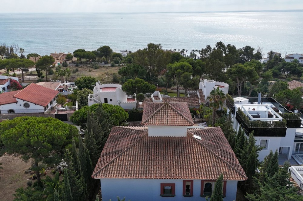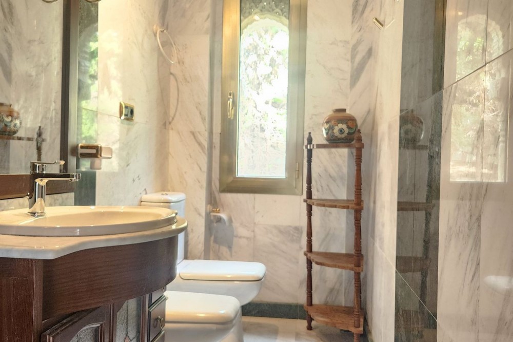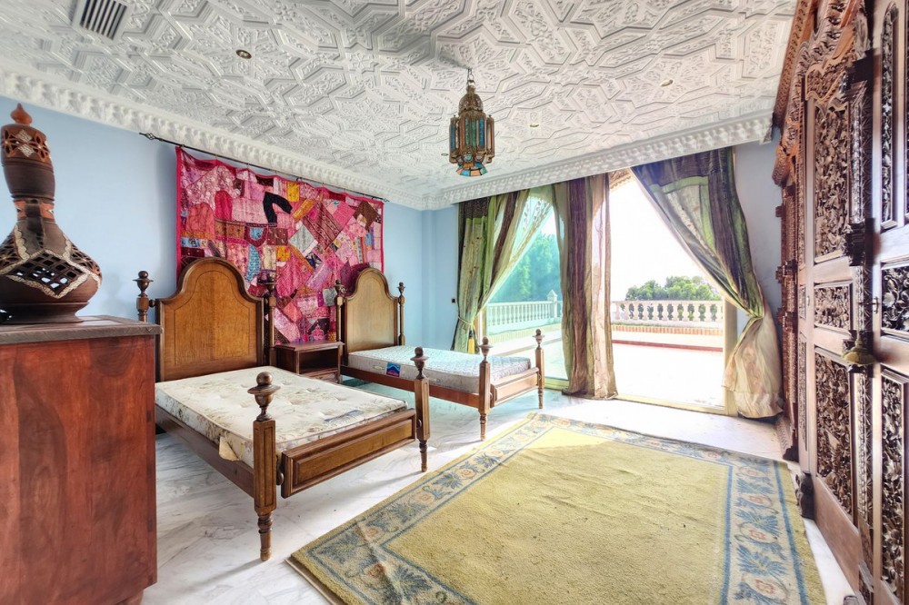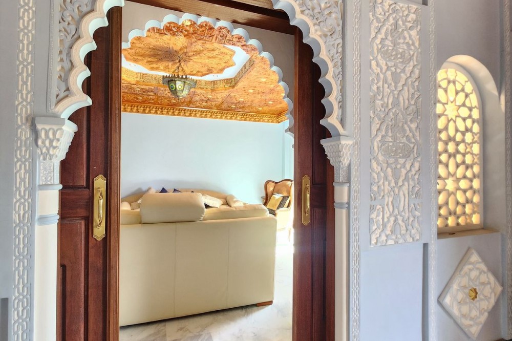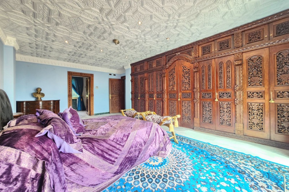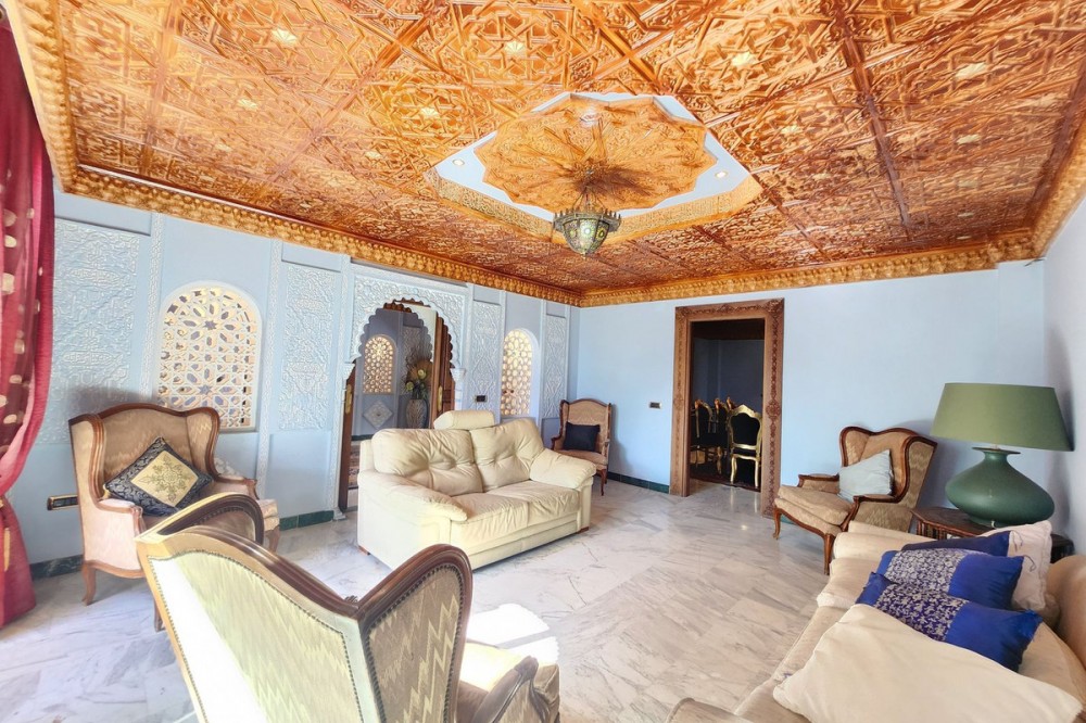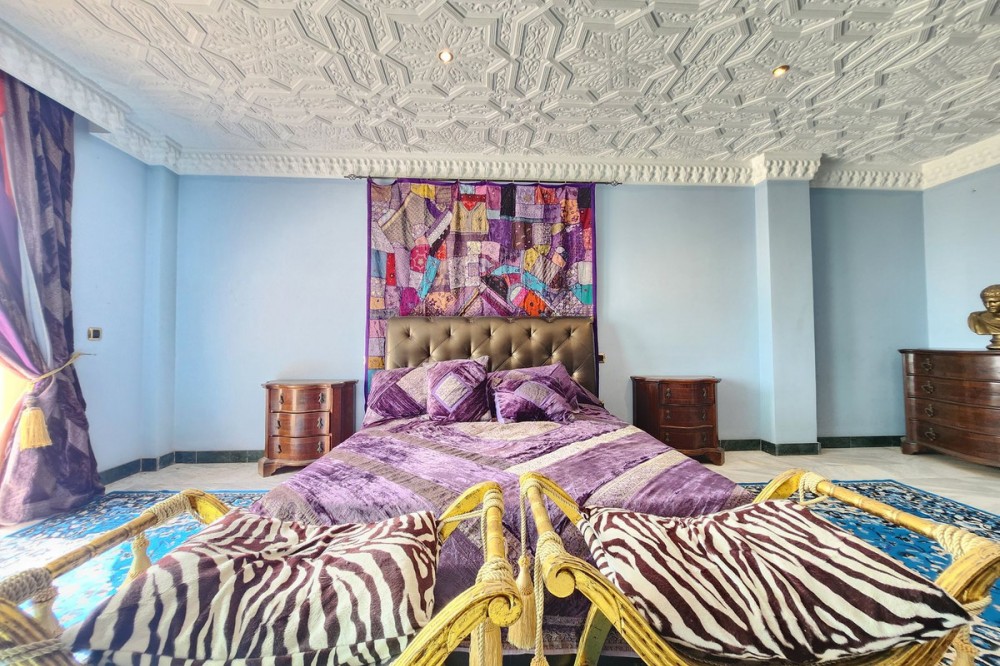 - Stunning Villa in Arabish-Andalusian Palace Style in Cala de Mijas Just 300 meters from the sea, this magnificent villa blends Andalusian Nazarí-modern design, combining luxury and tradition. Its privileged south-facing orientation ensures sunlight throughout the day, illuminating the garden and pool area. The property is accessed through a grand gate and a driveway. The villa is distributed over 3 floors plus a loft, featuring unique architectural details. Upon arrival, a small staircase leads to the pool and the main porch, offering stunning sea views. The entrance is through an impressive double door, hand-carved in mahogany, leading to a majestic 12-meter-high hall with a central patio and a marble fountain, all bathed in natural light coming through the central tower. To the left, a sliding double door opens to a large, bright double living room with sea views and windows overlooking the side garden. The high ceiling is lined with hand-carved mahogany wood, adding an artisanal touch to the space. This floor also includes a bright bedroom with garden views and a marble bathroom, perfectly equipped. On the right side of the hall, another living room with sea views connects to a spacious dining room, which leads to a modern kitchen equipped with high-end appliances and direct access to the rear garden. The upper floor offers three spacious bedrooms, two of them with access to a large terrace with panoramic sea views. The master bedroom features an en-suite bathroom with a jacuzzi and large windows providing abundant natural light. A second full bathroom also includes a jacuzzi and side windows. All carpentry is handcrafted from mahogany, and the windows are double-glazed. The lower floor offers flexible space with four additional bedrooms, perfect for conversion into a cinema room, games room, or even an independent apartment. It also includes a full bathroom and a garage with space for four cars. Located in the exclusive coastal urbanization of **Torrenueva**, this property is in the heart of Mijas' coastal area, just a short distance from the beaches and surrounded by lush forests. This enclave is known for its tranquility, international community, and excellent access to the AP7 motorway and A7 highway, allowing quick access to Málaga airport in 25 minutes, and Marbella or Puerto Banús in less than 15 minutes. Additionally, the nearby Cabopino area offers a charming marina just 10 minutes away. Torrenueva stands out for its excellent range of services, including restaurants, shops, tennis and golf clubs, as well as outdoor activities such as hiking, fishing, and diving. A unique property in an exceptional location, perfect for those seeking luxury, privacy, and proximity to the sea.