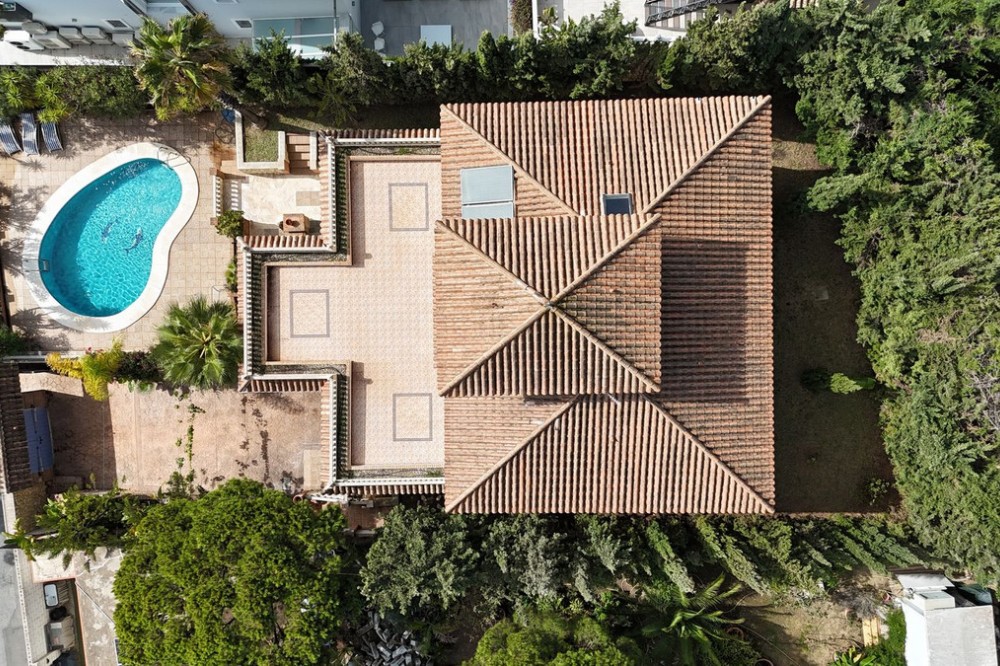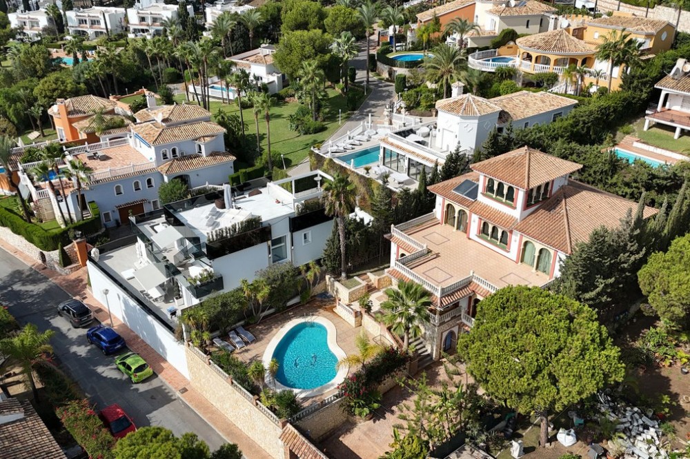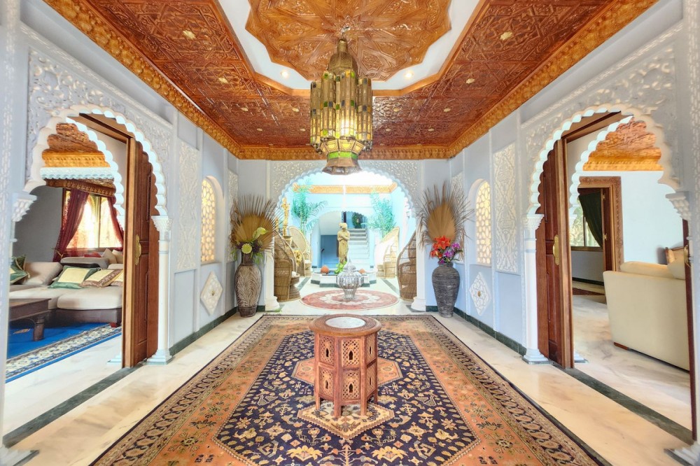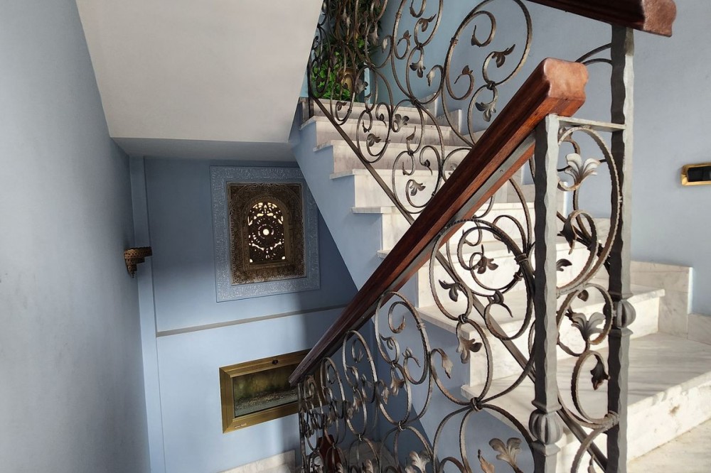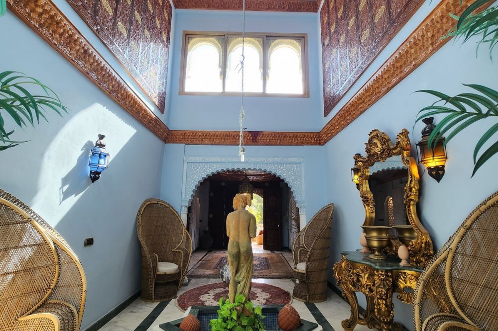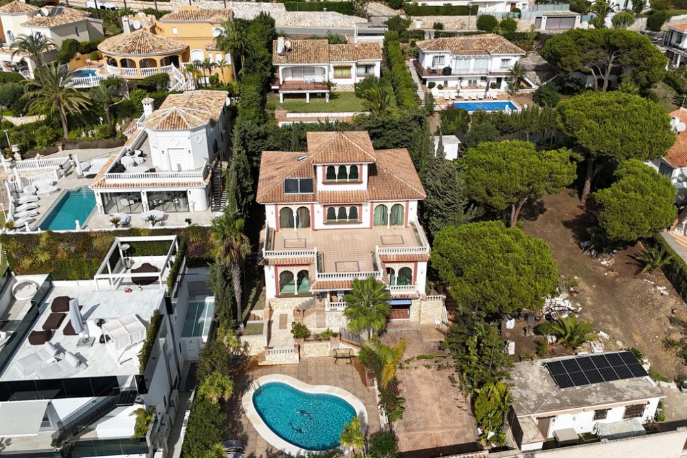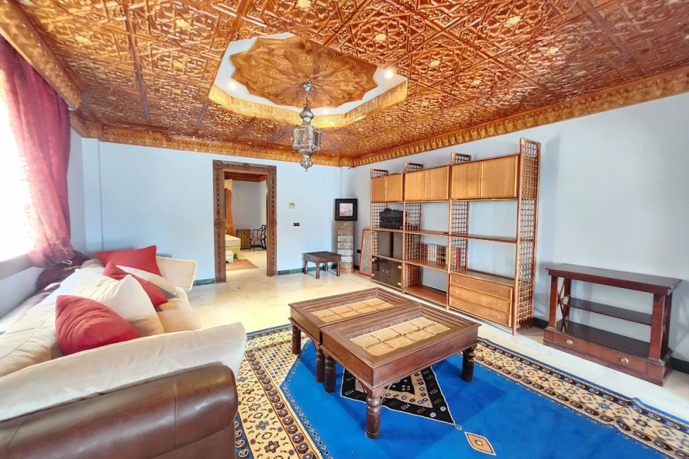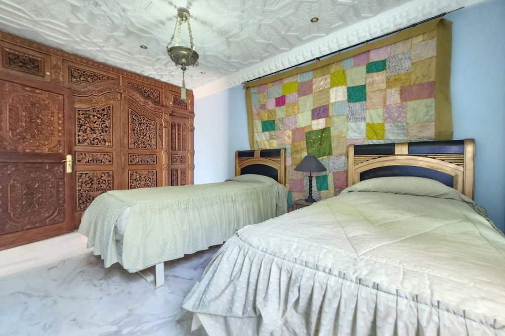 - Stunning Villa in Arabish-Andalusian Palace Style in Cala de Mijas Just 300 meters from the sea, this magnificent villa blends Andalusian Nazarí-modern design, combining luxury and tradition. Its privileged south-facing orientation ensures sunlight throughout the day, illuminating the garden and pool area. The property is accessed through a grand gate and a driveway. The villa is distributed over 3 floors plus a loft, featuring unique architectural details. Upon arrival, a small staircase leads to the pool and the main porch, offering stunning sea views. The entrance is through an impressive double door, hand-carved in mahogany, leading to a majestic 12-meter-high hall with a central patio and a marble fountain, all bathed in natural light coming through the central tower. To the left, a sliding double door opens to a large, bright double living room with sea views and windows overlooking the side garden. The high ceiling is lined with hand-carved mahogany wood, adding an artisanal touch to the space. This floor also includes a bright bedroom with garden views and a marble bathroom, perfectly equipped. On the right side of the hall, another living room with sea views connects to a spacious dining room, which leads to a modern kitchen equipped with high-end appliances and direct access to the rear garden. The upper floor offers three spacious bedrooms, two of them with access to a large terrace with panoramic sea views. The master bedroom features an en-suite bathroom with a jacuzzi and large windows providing abundant natural light. A second full bathroom also includes a jacuzzi and side windows. All carpentry is handcrafted from mahogany, and the windows are double-glazed. The lower floor offers flexible space with four additional bedrooms, perfect for conversion into a cinema room, games room, or even an independent apartment. It also includes a full bathroom and a garage with space for four cars. Located in the exclusive coastal urbanization of **Torrenueva**, this property is in the heart of Mijas' coastal area, just a short distance from the beaches and surrounded by lush forests. This enclave is known for its tranquility, international community, and excellent access to the AP7 motorway and A7 highway, allowing quick access to Málaga airport in 25 minutes, and Marbella or Puerto Banús in less than 15 minutes. Additionally, the nearby Cabopino area offers a charming marina just 10 minutes away. Torrenueva stands out for its excellent range of services, including restaurants, shops, tennis and golf clubs, as well as outdoor activities such as hiking, fishing, and diving. A unique property in an exceptional location, perfect for those seeking luxury, privacy, and proximity to the sea.