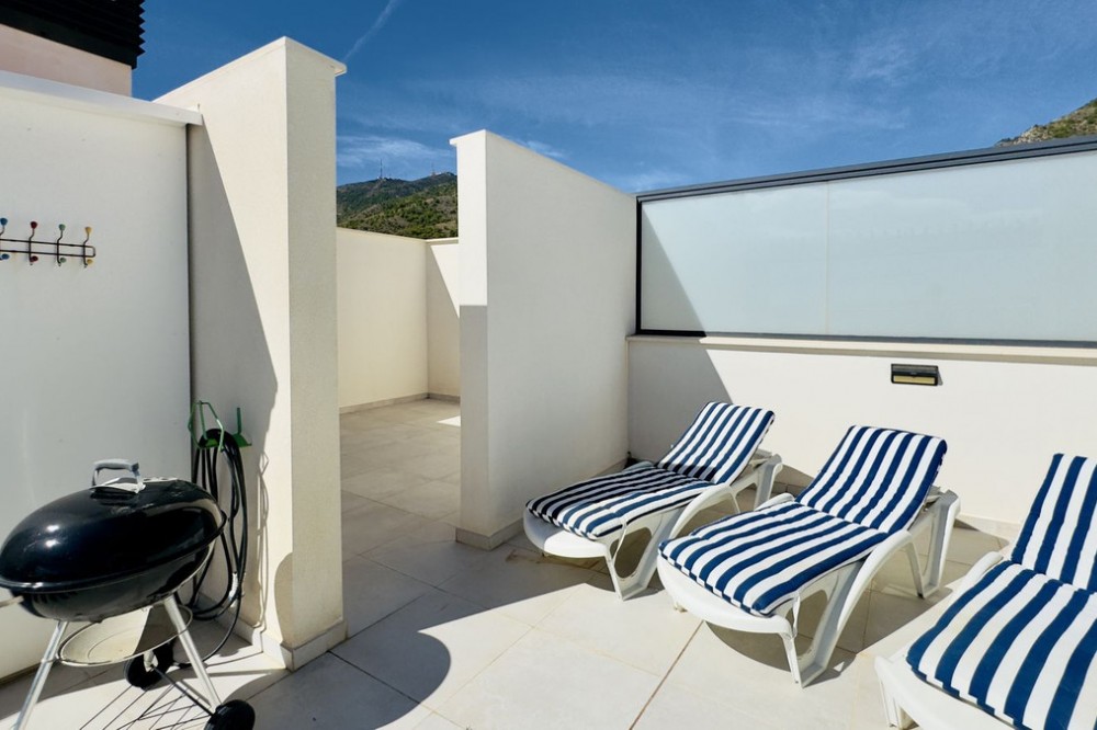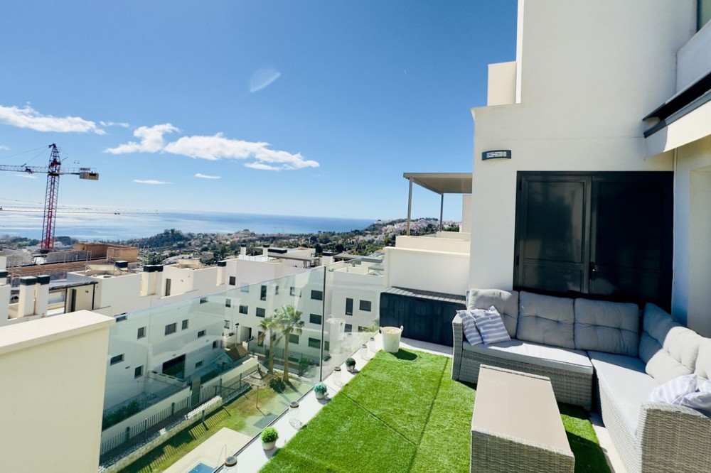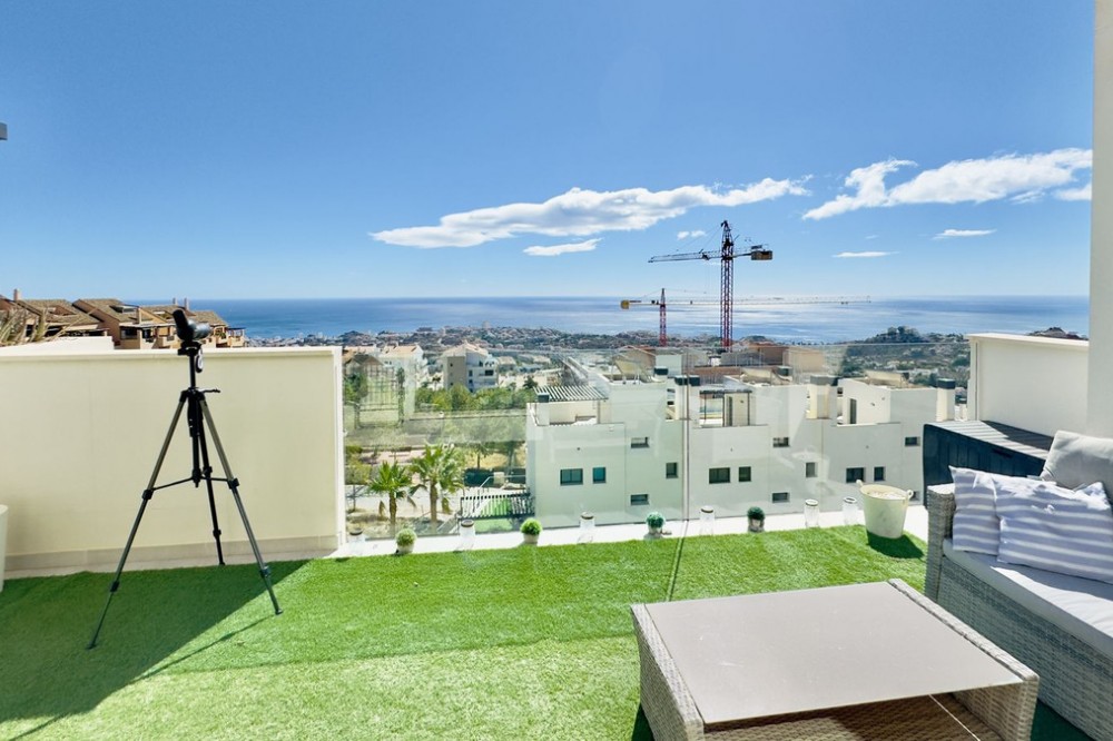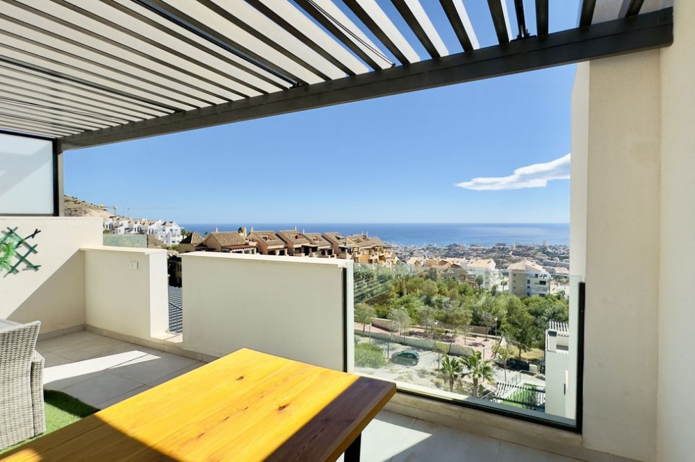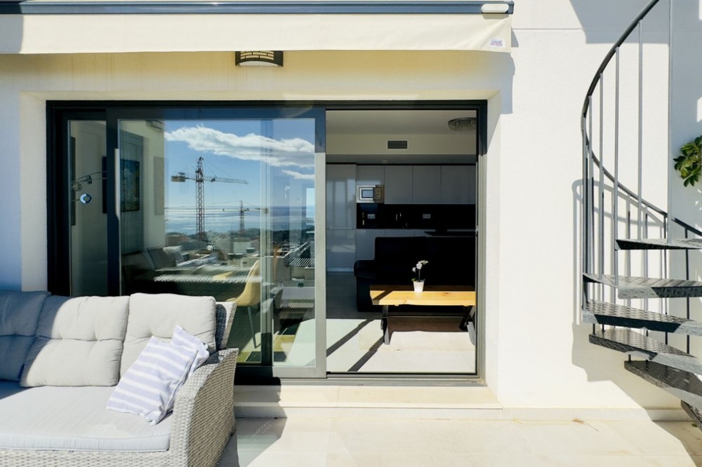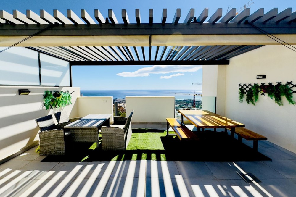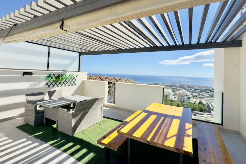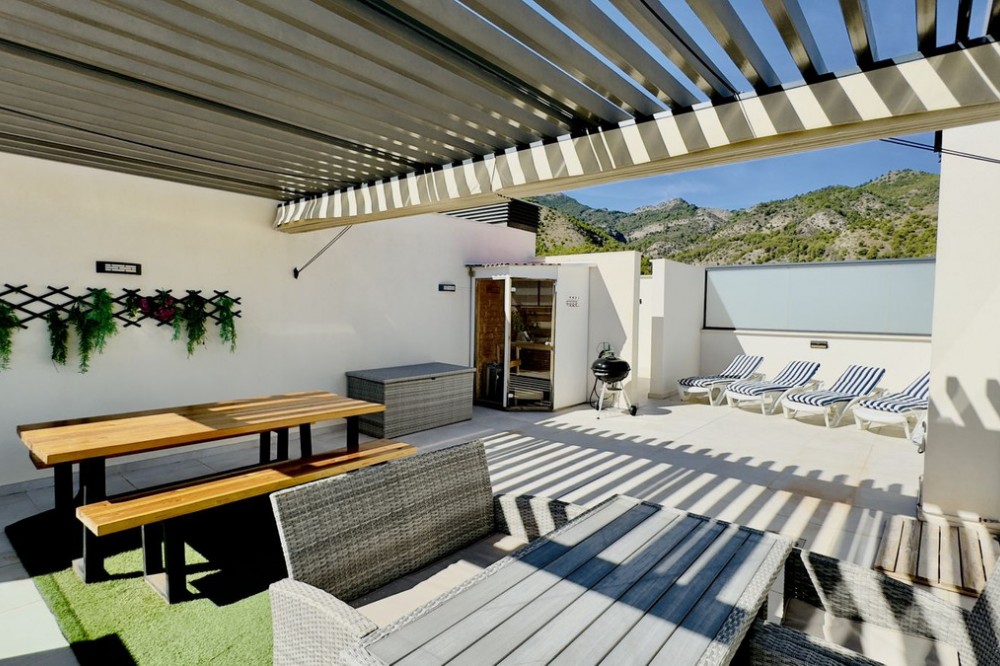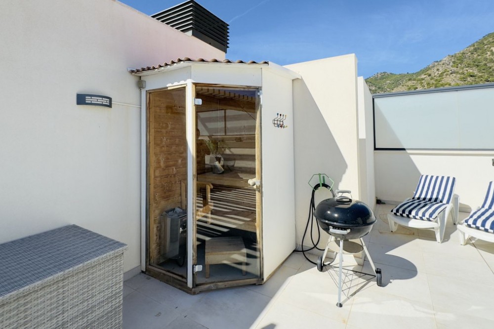 - Luxurious 2 Bed Penthouse with Amazing Sea Views in Benalmadena This beautiful 2-bedroom, 2-bathroom penthouse in Benalmadena offers high-quality finishes throughout, creating a luxurious atmosphere. The smart, modern floor plan optimizes space for comfortable living. The outdoor areas are a standout feature, with a south facing lower terrace that enjoys a lot of sun, and a large rooftop terrace with amazing sea views and sunshine all day. A private sauna on the rooftop adds a touch of indulgence. The property also includes two underground parking spaces and a storage unit, with direct lift access from the parking area to the apartment. This penthouse perfectly blends luxury, stunning sea views, and modern convenience. This property has a tourist license.