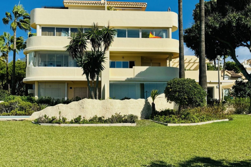 - Reduced Frontline beach apartment for sale in Elviria, Marbella. Rare opportunity to acquire a frontline beach property in the very exclusive area of Elviria located 15m drive from Marbella. This 2 bedroom 2 bathroom ground floor apartment is totally renovated modern style and is sold fully furnished. The contemporary open plan kitchen opens to the living room which leads to a covered terrace, equipped with glass curtains which can be opened when needed. The property is very bright and is part of a small very exclusive complexe of 14 apartments only, where all have stunning sea views. It is equipped with double glazing windows and electric blinds, Air conditioning Hot and Cold. The apartment has a private garden included in the title deeds and a private covered parking space. The community garden of 2400m has direct access to the beach. The size of the plot is exceptional for only 14 apartments. The beautifully designed pool, and gardens are all very well maintained. You are allowed to rent short term in this complexe, making the property a great little earner, perfect for an investor. The residence is located walking distance to famous beach clubs such as the Marriott, Nicky beach and the five stars Don Carlos Hotel. You can reach in a few minutes walk the several commercial centers of the Elviria area. Elviria is an upmarket area, very popular with Golf lovers for its reknowned Santa Maria Golf course, surrounded by green wooded protected forests. For those who dream of lounging in their own garden with the sea only a few meters away, this is the Dream! Don't miss it, as it is a rare find.