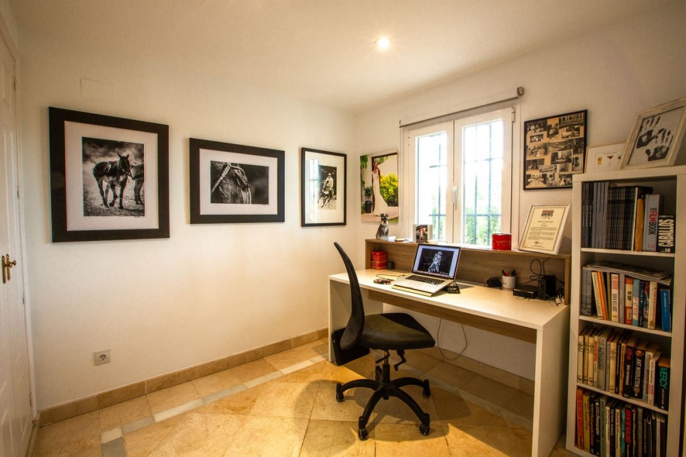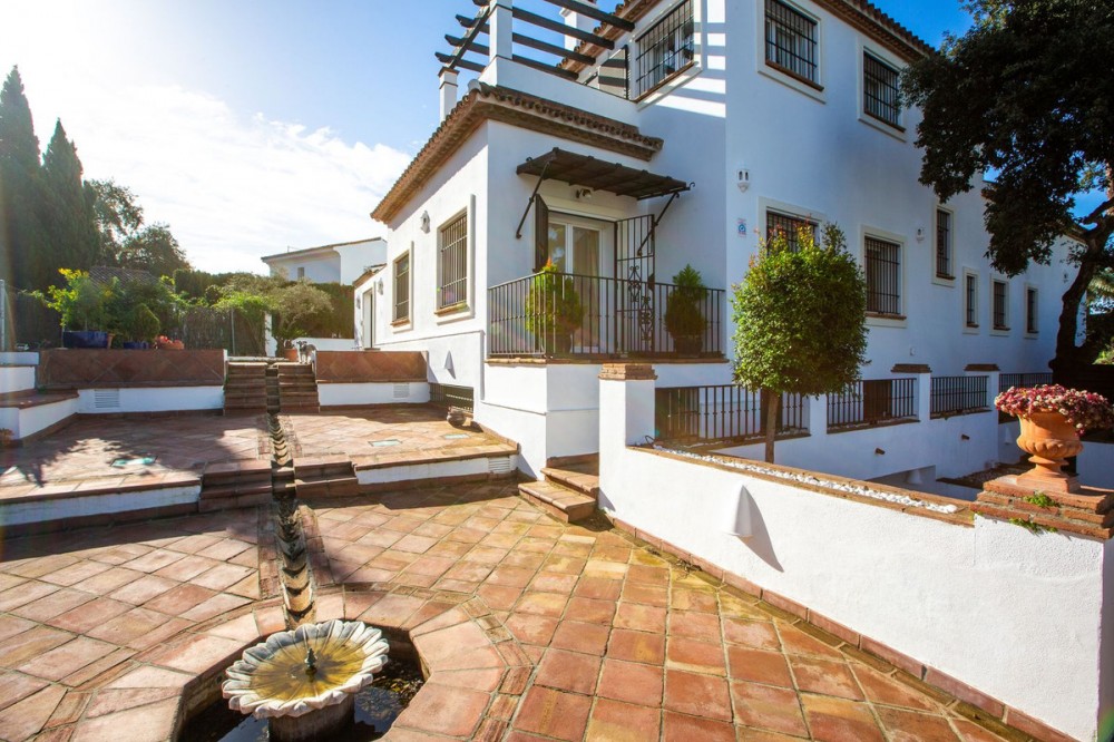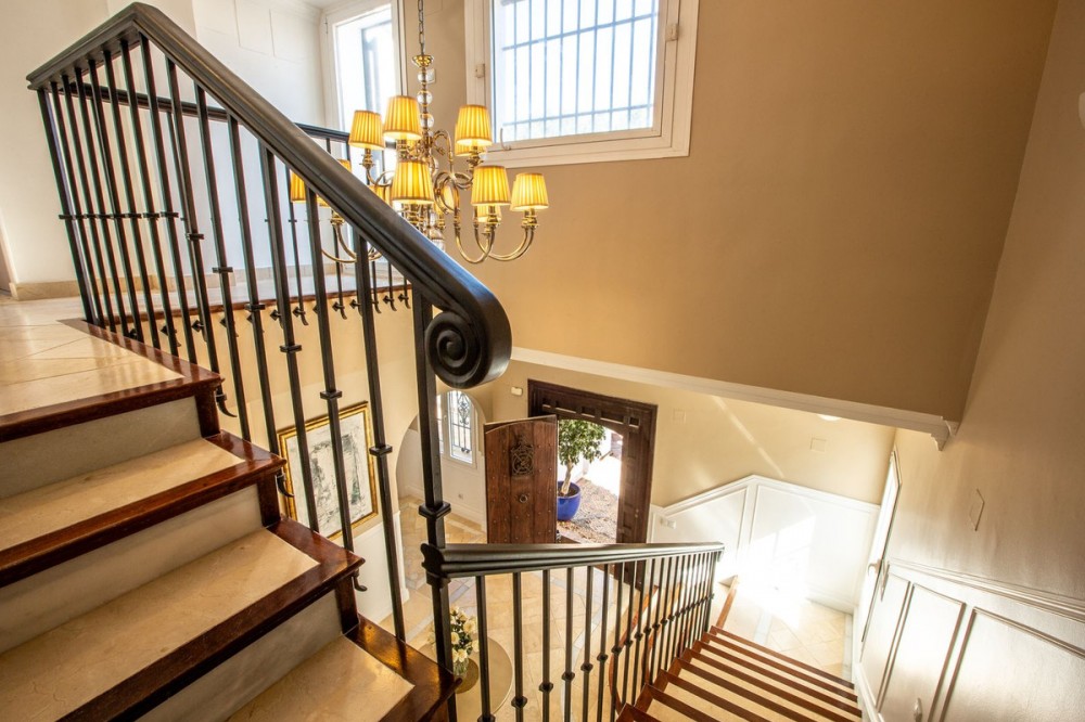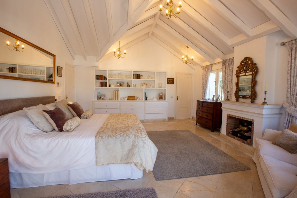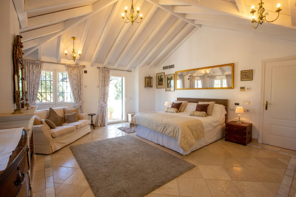 - This stunning southwest-facing, two-story villa with a distinctive tower room is situated on an elevated corner plot in Sotogrande’s prestigious B Zone. Offering exceptional privacy, abundant natural light, and captivating views of the Sierra Bermeja mountains, this home is designed for luxurious living. The villa features a grand double-height entrance leading into a spacious living room with a large, inviting fireplace. With five en-suite bedrooms and an additional maid’s quarter, each bedroom is fitted with premium wood wardrobes, while the master suite includes its own cozy fireplace. The kitchen provides an opportunity for customization, allowing you to renovate to your personal style. A versatile sunroom connects to the outdoor area, where you’ll find a deck-level pool and a pool house with a shower. Additional highlights include: - Basement with a sauna and space for a gym or home cinema - Elevator access from the basement to the second floor - Three-car garage and additional carport - Underfloor heating and air conditioning throughout - Proximity to schools, shops, and renowned golf courses This villa’s prime corner plot offers not only unparalleled light and privacy but also abundant potential for tailored updates to make it uniquely yours.